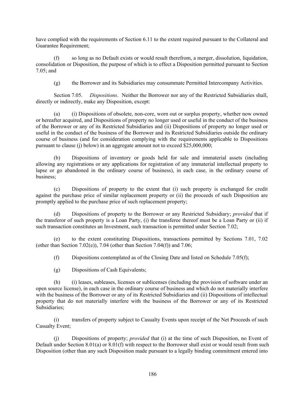 have complied with the requirements of Section 6.11 to the extent required pursuant to the Collateral andGuarantee Requirement;(f) so long as no Default exists or would result therefrom, a merger, dissolution, liquidation,consolidation or Disposition, the purpose of which is to effect a Disposition permitted pursuant to Section7.05; and(g) the Borrower and its Subsidiaries may consummate Permitted Intercompany Activities.Section 7.05. Dispositions. Neither the Borrower nor any of the Restricted Subsidiaries shall,directly or indirectly, make any Disposition, except:(a) (i) Dispositions of obsolete, non-core, worn out or surplus property, whether now ownedor hereafter acquired, and Dispositions of property no longer used or useful in the conduct of the businessof the Borrower or any of its Restricted Subsidiaries and (ii) Dispositions of property no longer used oruseful in the conduct of the business of the Borrower and its Restricted Subsidiaries outside the ordinarycourse of business (and for consideration complying with the requirements applicable to Dispositionspursuant to clause (j) below) in an aggregate amount not to exceed $25,000,000;(b) Dispositions of inventory or goods held for sale and immaterial assets (includingallowing any registrations or any applications for registration of any immaterial intellectual property tolapse or go abandoned in the ordinary course of business), in each case, in the ordinary course ofbusiness;(c) Dispositions of property to the extent that (i) such property is exchanged for creditagainst the purchase price of similar replacement property or (ii) the proceeds of such Disposition arepromptly applied to the purchase price of such replacement property;(d) Dispositions of property to the Borrower or any Restricted Subsidiary; provided that ifthe transferor of such property is a Loan Party, (i) the transferee thereof must be a Loan Party or (ii) ifsuch transaction constitutes an Investment, such transaction is permitted under Section 7.02;(e) to the extent constituting Dispositions, transactions permitted by Sections 7.01, 7.02(other than Section 7.02(e)), 7.04 (other than Section 7.04(f)) and 7.06;(f) Dispositions contemplated as of the Closing Date and listed on Schedule 7.05(f);(g) Dispositions of Cash Equivalents;(h) (i) leases, subleases, licenses or sublicenses (including the provision of software under anopen source license), in each case in the ordinary course of business and which do not materially interferewith the business of the Borrower or any of its Restricted Subsidiaries and (ii) Dispositions of intellectualproperty that do not materially interfere with the business of the Borrower or any of its RestrictedSubsidiaries;(i) transfers of property subject to Casualty Events upon receipt of the Net Proceeds of suchCasualty Event;(j) Dispositions of property; provided that (i) at the time of such Disposition, no Event ofDefault under Section 8.01(a) or 8.01(f) with respect to the Borrower shall exist or would result from suchDisposition (other than any such Disposition made pursuant to a legally binding commitment entered into186