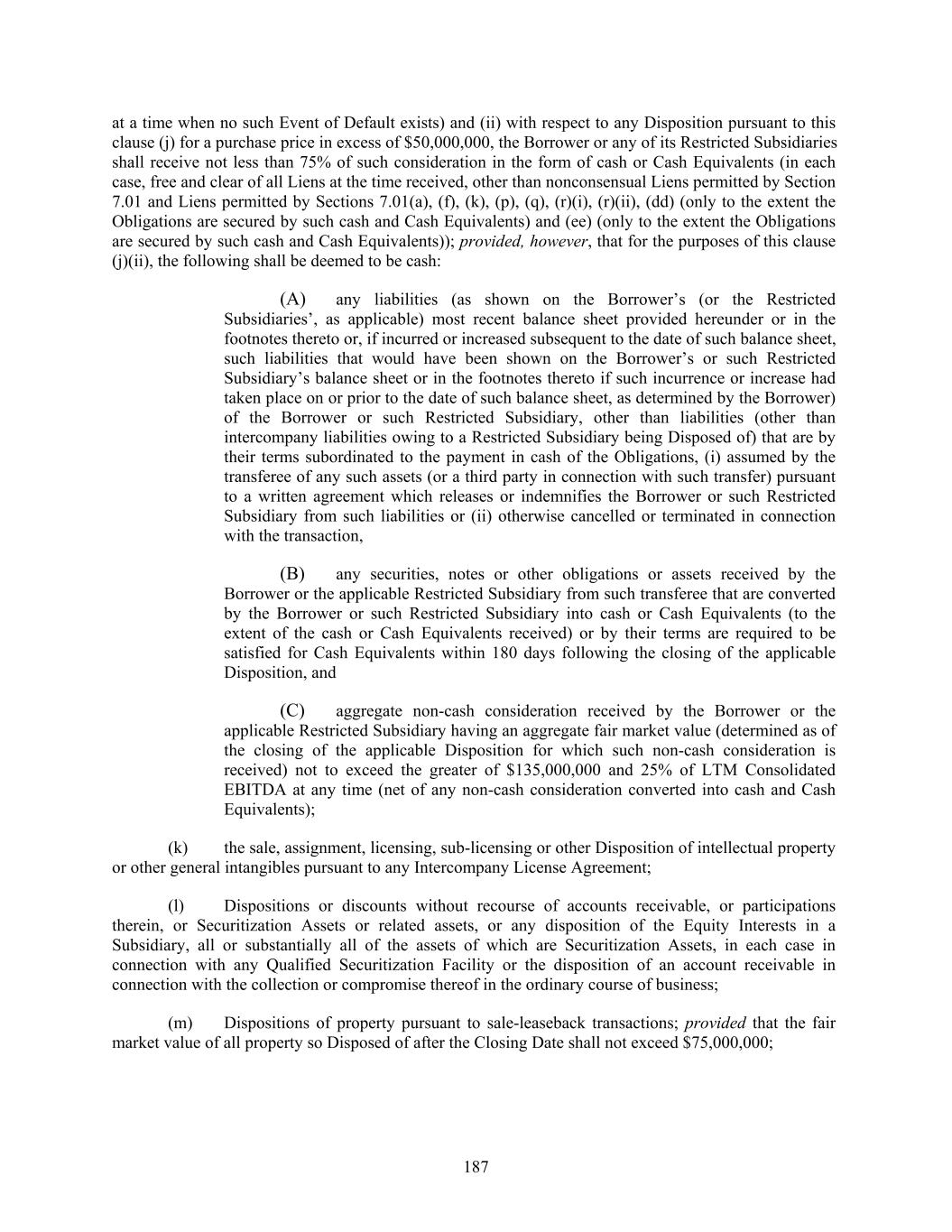 at a time when no such Event of Default exists) and (ii) with respect to any Disposition pursuant to thisclause (j) for a purchase price in excess of $50,000,000, the Borrower or any of its Restricted Subsidiariesshall receive not less than 75% of such consideration in the form of cash or Cash Equivalents (in eachcase, free and clear of all Liens at the time received, other than nonconsensual Liens permitted by Section7.01 and Liens permitted by Sections 7.01(a), (f), (k), (p), (q), (r) (i), (r) (ii), (dd) (only to the extent theObligations are secured by such cash and Cash Equivalents) and (ee) (only to the extent the Obligationsare secured by such cash and Cash Equivalents)); provided, however, that for the purposes of this clause (j) (ii), the following shall be deemed to be cash:(A) any liabilities (as shown on the Borrower’s (or the RestrictedSubsidiaries’, as applicable) most recent balance sheet provided hereunder or in thefootnotes thereto or, if incurred or increased subsequent to the date of such balance sheet,such liabilities that would have been shown on the Borrower’s or such RestrictedSubsidiary’s balance sheet or in the footnotes thereto if such incurrence or increase hadtaken place on or prior to the date of such balance sheet, as determined by the Borrower)of the Borrower or such Restricted Subsidiary, other than liabilities (other thanintercompany liabilities owing to a Restricted Subsidiary being Disposed of) that are bytheir terms subordinated to the payment in cash of the Obligations, (i) assumed by thetransferee of any such assets (or a third party in connection with such transfer) pursuantto a written agreement which releases or indemnifies the Borrower or such RestrictedSubsidiary from such liabilities or (ii) otherwise cancelled or terminated in connectionwith the transaction,(B) any securities, notes or other obligations or assets received by theBorrower or the applicable Restricted Subsidiary from such transferee that are convertedby the Borrower or such Restricted Subsidiary into cash or Cash Equivalents (to theextent of the cash or Cash Equivalents received) or by their terms are required to besatisfied for Cash Equivalents within 180 days following the closing of the applicableDisposition, and(C) aggregate non-cash consideration received by the Borrower or theapplicable Restricted Subsidiary having an aggregate fair market value (determined as ofthe closing of the applicable Disposition for which such non-cash consideration isreceived) not to exceed the greater of $135,000,000 and 25% of LTM ConsolidatedEBITDA at any time (net of any non-cash consideration converted into cash and CashEquivalents);(k) the sale, assignment, licensing, sub-licensing or other Disposition of intellectual propertyor other general intangibles pursuant to any Intercompany License Agreement;(l) Dispositions or discounts without recourse of accounts receivable, or participationstherein, or Securitization Assets or related assets, or any disposition of the Equity Interests in aSubsidiary, all or substantially all of the assets of which are Securitization Assets, in each case inconnection with any Qualified Securitization Facility or the disposition of an account receivable inconnection with the collection or compromise thereof in the ordinary course of business;(m) Dispositions of property pursuant to sale-leaseback transactions; provided that the fairmarket value of all property so Disposed of after the Closing Date shall not exceed $75,000,000;187