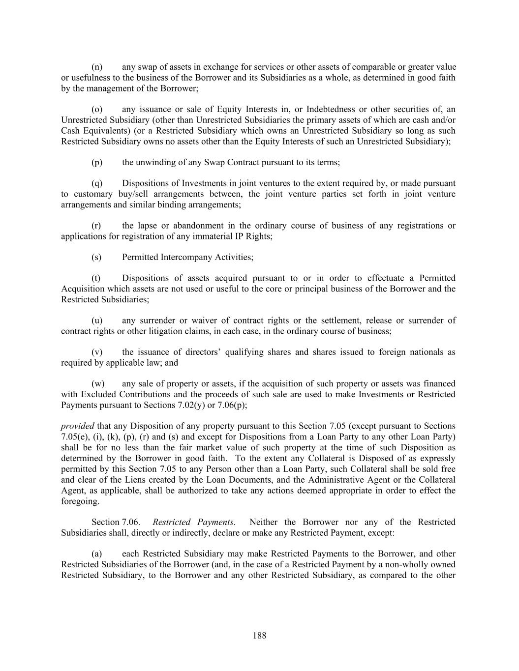 (n) any swap of assets in exchange for services or other assets of comparable or greater valueor usefulness to the business of the Borrower and its Subsidiaries as a whole, as determined in good faithby the management of the Borrower;(o) any issuance or sale of Equity Interests in, or Indebtedness or other securities of, anUnrestricted Subsidiary (other than Unrestricted Subsidiaries the primary assets of which are cash and/orCash Equivalents) (or a Restricted Subsidiary which owns an Unrestricted Subsidiary so long as suchRestricted Subsidiary owns no assets other than the Equity Interests of such an Unrestricted Subsidiary);(p) the unwinding of any Swap Contract pursuant to its terms;(q) Dispositions of Investments in joint ventures to the extent required by, or made pursuantto customary buy/sell arrangements between, the joint venture parties set forth in joint venturearrangements and similar binding arrangements;(r) the lapse or abandonment in the ordinary course of business of any registrations orapplications for registration of any immaterial IP Rights;(s) Permitted Intercompany Activities;(t) Dispositions of assets acquired pursuant to or in order to effectuate a PermittedAcquisition which assets are not used or useful to the core or principal business of the Borrower and theRestricted Subsidiaries;(u) any surrender or waiver of contract rights or the settlement, release or surrender ofcontract rights or other litigation claims, in each case, in the ordinary course of business;(v) the issuance of directors’ qualifying shares and shares issued to foreign nationals asrequired by applicable law; and(w) any sale of property or assets, if the acquisition of such property or assets was financedwith Excluded Contributions and the proceeds of such sale are used to make Investments or RestrictedPayments pursuant to Sections 7.02(y) or 7.06(p);provided that any Disposition of any property pursuant to this Section 7.05 (except pursuant to Sections 7.05(e), (i), (k), (p), (r) and (s) and except for Dispositions from a Loan Party to any other Loan Party)shall be for no less than the fair market value of such property at the time of such Disposition asdetermined by the Borrower in good faith. To the extent any Collateral is Disposed of as expresslypermitted by this Section 7.05 to any Person other than a Loan Party, such Collateral shall be sold freeand clear of the Liens created by the Loan Documents, and the Administrative Agent or the CollateralAgent, as applicable, shall be authorized to take any actions deemed appropriate in order to effect theforegoing.Section 7.06. Restricted Payments. Neither the Borrower nor any of the RestrictedSubsidiaries shall, directly or indirectly, declare or make any Restricted Payment, except:(a) each Restricted Subsidiary may make Restricted Payments to the Borrower, and otherRestricted Subsidiaries of the Borrower (and, in the case of a Restricted Payment by a non-wholly ownedRestricted Subsidiary, to the Borrower and any other Restricted Subsidiary, as compared to the other188