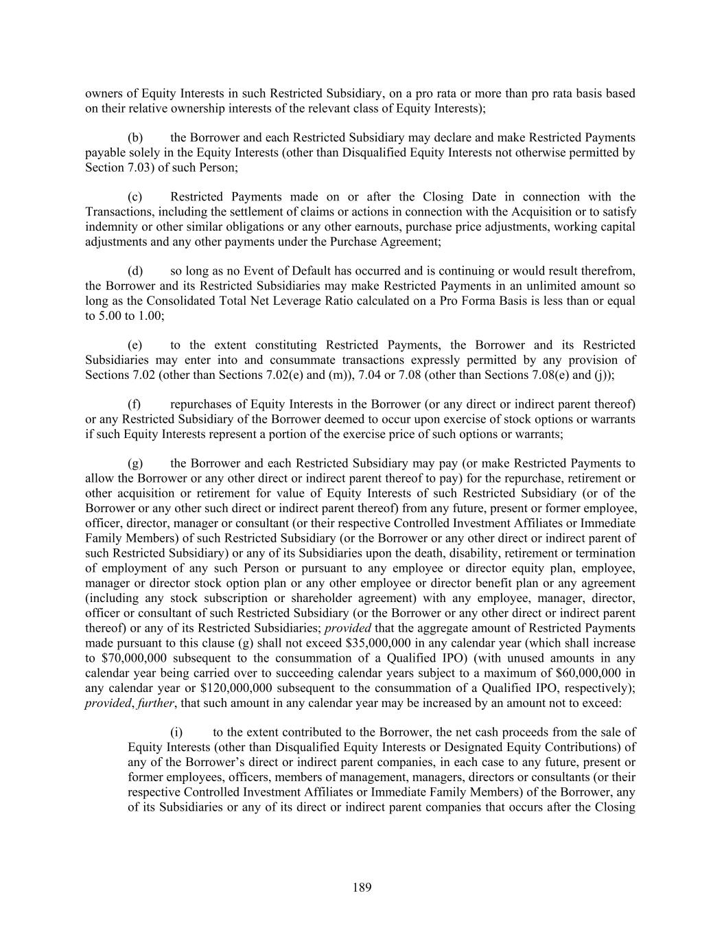 owners of Equity Interests in such Restricted Subsidiary, on a pro rata or more than pro rata basis basedon their relative ownership interests of the relevant class of Equity Interests);(b) the Borrower and each Restricted Subsidiary may declare and make Restricted Paymentspayable solely in the Equity Interests (other than Disqualified Equity Interests not otherwise permitted by Section 7.03) of such Person;(c) Restricted Payments made on or after the Closing Date in connection with theTransactions, including the settlement of claims or actions in connection with the Acquisition or to satisfyindemnity or other similar obligations or any other earnouts, purchase price adjustments, working capitaladjustments and any other payments under the Purchase Agreement;(d) so long as no Event of Default has occurred and is continuing or would result therefrom,the Borrower and its Restricted Subsidiaries may make Restricted Payments in an unlimited amount solong as the Consolidated Total Net Leverage Ratio calculated on a Pro Forma Basis is less than or equalto 5.00 to 1.00;(e) to the extent constituting Restricted Payments, the Borrower and its RestrictedSubsidiaries may enter into and consummate transactions expressly permitted by any provision ofSections 7.02 (other than Sections 7.02(e) and (m)), 7.04 or 7.08 (other than Sections 7.08(e) and (j));(f) repurchases of Equity Interests in the Borrower (or any direct or indirect parent thereof)or any Restricted Subsidiary of the Borrower deemed to occur upon exercise of stock options or warrantsif such Equity Interests represent a portion of the exercise price of such options or warrants;(g) the Borrower and each Restricted Subsidiary may pay (or make Restricted Payments toallow the Borrower or any other direct or indirect parent thereof to pay) for the repurchase, retirement orother acquisition or retirement for value of Equity Interests of such Restricted Subsidiary (or of theBorrower or any other such direct or indirect parent thereof) from any future, present or former employee,officer, director, manager or consultant (or their respective Controlled Investment Affiliates or ImmediateFamily Members) of such Restricted Subsidiary (or the Borrower or any other direct or indirect parent ofsuch Restricted Subsidiary) or any of its Subsidiaries upon the death, disability, retirement or terminationof employment of any such Person or pursuant to any employee or director equity plan, employee,manager or director stock option plan or any other employee or director benefit plan or any agreement(including any stock subscription or shareholder agreement) with any employee, manager, director,officer or consultant of such Restricted Subsidiary (or the Borrower or any other direct or indirect parentthereof) or any of its Restricted Subsidiaries; provided that the aggregate amount of Restricted Paymentsmade pursuant to this clause (g) shall not exceed $35,000,000 in any calendar year (which shall increaseto $70,000,000 subsequent to the consummation of a Qualified IPO) (with unused amounts in anycalendar year being carried over to succeeding calendar years subject to a maximum of $60,000,000 inany calendar year or $120,000,000 subsequent to the consummation of a Qualified IPO, respectively);provided, further, that such amount in any calendar year may be increased by an amount not to exceed:(i) to the extent contributed to the Borrower, the net cash proceeds from the sale ofEquity Interests (other than Disqualified Equity Interests or Designated Equity Contributions) ofany of the Borrower’s direct or indirect parent companies, in each case to any future, present orformer employees, officers, members of management, managers, directors or consultants (or theirrespective Controlled Investment Affiliates or Immediate Family Members) of the Borrower, anyof its Subsidiaries or any of its direct or indirect parent companies that occurs after the Closing189