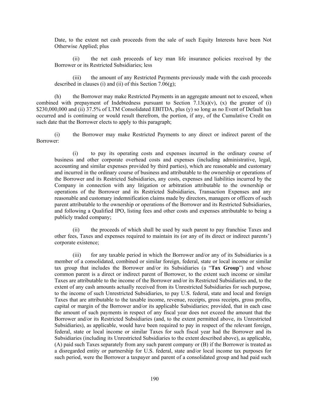Date, to the extent net cash proceeds from the sale of such Equity Interests have been NotOtherwise Applied; plus(ii) the net cash proceeds of key man life insurance policies received by theBorrower or its Restricted Subsidiaries; less(iii) the amount of any Restricted Payments previously made with the cash proceedsdescribed in clauses (i) and (ii) of this Section 7.06(g);(h) the Borrower may make Restricted Payments in an aggregate amount not to exceed, whencombined with prepayment of Indebtedness pursuant to Section 7.13(a)(v), (x) the greater of (i)$230,000,000 and (ii) 37.5% of LTM Consolidated EBITDA, plus (y) so long as no Event of Default hasoccurred and is continuing or would result therefrom, the portion, if any, of the Cumulative Credit onsuch date that the Borrower elects to apply to this paragraph;(i) the Borrower may make Restricted Payments to any direct or indirect parent of theBorrower: (i) to pay its operating costs and expenses incurred in the ordinary course ofbusiness and other corporate overhead costs and expenses (including administrative, legal,accounting and similar expenses provided by third parties), which are reasonable and customaryand incurred in the ordinary course of business and attributable to the ownership or operations ofthe Borrower and its Restricted Subsidiaries, any costs, expenses and liabilities incurred by theCompany in connection with any litigation or arbitration attributable to the ownership oroperations of the Borrower and its Restricted Subsidiaries, Transaction Expenses and anyreasonable and customary indemnification claims made by directors, managers or officers of suchparent attributable to the ownership or operations of the Borrower and its Restricted Subsidiaries,and following a Qualified IPO, listing fees and other costs and expenses attributable to being apublicly traded company;(ii) the proceeds of which shall be used by such parent to pay franchise Taxes andother fees, Taxes and expenses required to maintain its (or any of its direct or indirect parents’)corporate existence;(iii) for any taxable period in which the Borrower and/or any of its Subsidiaries is amember of a consolidated, combined or similar foreign, federal, state or local income or similartax group that includes the Borrower and/or its Subsidiaries (a “Tax Group”) and whosecommon parent is a direct or indirect parent of Borrower, to the extent such income or similarTaxes are attributable to the income of the Borrower and/or its Restricted Subsidiaries and, to theextent of any cash amounts actually received from its Unrestricted Subsidiaries for such purpose,to the income of such Unrestricted Subsidiaries, to pay U.S. federal, state and local and foreignTaxes that are attributable to the taxable income, revenue, receipts, gross receipts, gross profits,capital or margin of the Borrower and/or its applicable Subsidiaries; provided, that in each casethe amount of such payments in respect of any fiscal year does not exceed the amount that theBorrower and/or its Restricted Subsidiaries (and, to the extent permitted above, its UnrestrictedSubsidiaries), as applicable, would have been required to pay in respect of the relevant foreign,federal, state or local income or similar Taxes for such fiscal year had the Borrower and itsSubsidiaries (including its Unrestricted Subsidiaries to the extent described above), as applicable,(A) paid such Taxes separately from any such parent company or (B) if the Borrower is treated asa disregarded entity or partnership for U.S. federal, state and/or local income tax purposes forsuch period, were the Borrower a taxpayer and parent of a consolidated group and had paid such190
