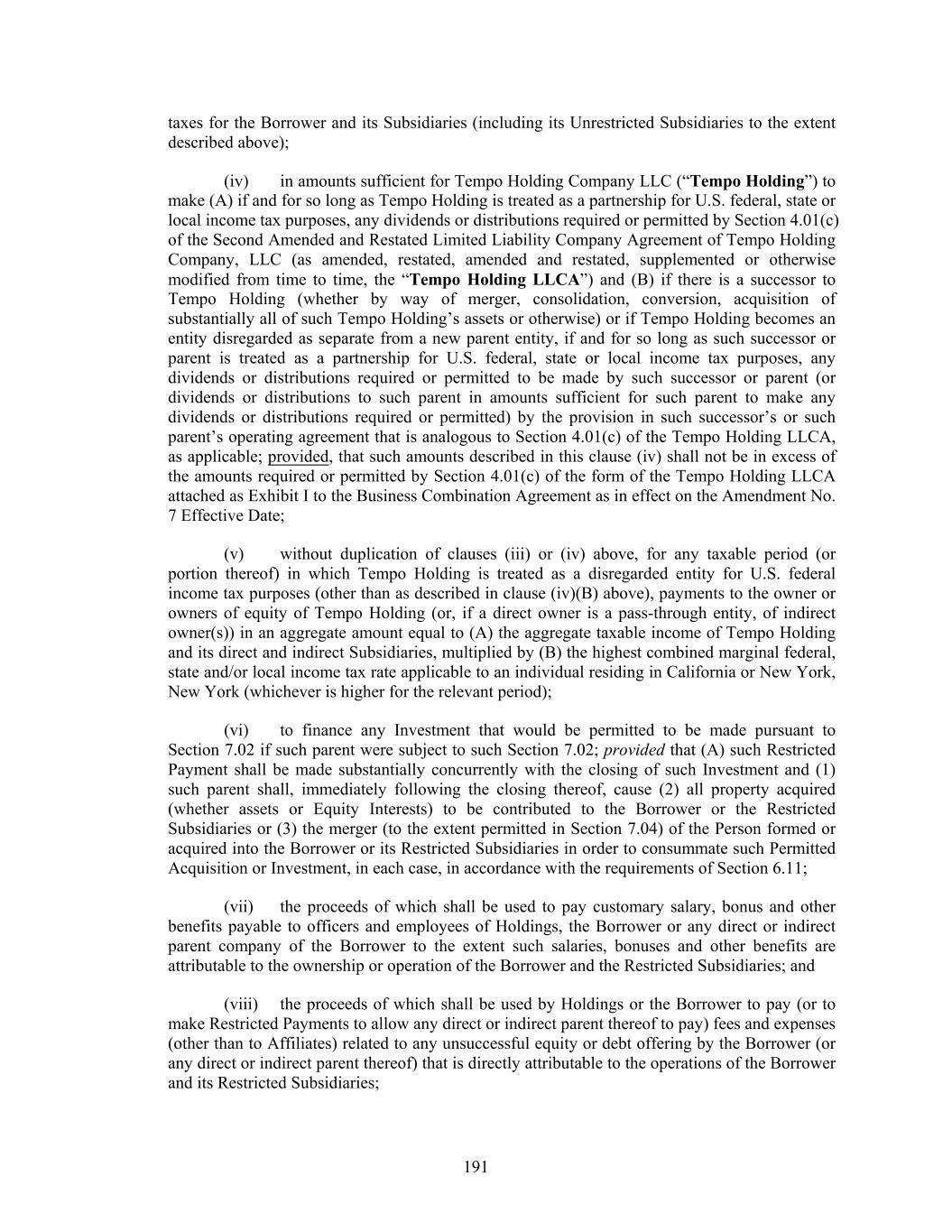 taxes for the Borrower and its Subsidiaries (including its Unrestricted Subsidiaries to the extentdescribed above);(iv) in amounts sufficient for Tempo Holding Company LLC (“Tempo Holding”) tomake (A) if and for so long as Tempo Holding is treated as a partnership for U.S. federal, state orlocal income tax purposes, any dividends or distributions required or permitted by Section 4.01(c)of the Second Amended and Restated Limited Liability Company Agreement of Tempo HoldingCompany, LLC (as amended, restated, amended and restated, supplemented or otherwisemodified from time to time, the “Tempo Holding LLCA”) and (B) if there is a successor toTempo Holding (whether by way of merger, consolidation, conversion, acquisition ofsubstantially all of such Tempo Holding’s assets or otherwise) or if Tempo Holding becomes anentity disregarded as separate from a new parent entity, if and for so long as such successor orparent is treated as a partnership for U.S. federal, state or local income tax purposes, anydividends or distributions required or permitted to be made by such successor or parent (ordividends or distributions to such parent in amounts sufficient for such parent to make anydividends or distributions required or permitted) by the provision in such successor’s or suchparent’s operating agreement that is analogous to Section 4.01(c) of the Tempo Holding LLCA,as applicable; provided, that such amounts described in this clause (iv) shall not be in excess ofthe amounts required or permitted by Section 4.01(c) of the form of the Tempo Holding LLCAattached as Exhibit I to the Business Combination Agreement as in effect on the Amendment No.7 Effective Date;(v) without duplication of clauses (iii) or (iv) above, for any taxable period (orportion thereof) in which Tempo Holding is treated as a disregarded entity for U.S. federalincome tax purposes (other than as described in clause (iv)(B) above), payments to the owner orowners of equity of Tempo Holding (or, if a direct owner is a pass-through entity, of indirectowner(s)) in an aggregate amount equal to (A) the aggregate taxable income of Tempo Holdingand its direct and indirect Subsidiaries, multiplied by (B) the highest combined marginal federal,state and/or local income tax rate applicable to an individual residing in California or New York,New York (whichever is higher for the relevant period);(vi) to finance any Investment that would be permitted to be made pursuant to Section 7.02 if such parent were subject to such Section 7.02; provided that (A) such RestrictedPayment shall be made substantially concurrently with the closing of such Investment and (1)such parent shall, immediately following the closing thereof, cause (2) all property acquired(whether assets or Equity Interests) to be contributed to the Borrower or the RestrictedSubsidiaries or (3) the merger (to the extent permitted in Section 7.04) of the Person formed oracquired into the Borrower or its Restricted Subsidiaries in order to consummate such PermittedAcquisition or Investment, in each case, in accordance with the requirements of Section 6.11;(vii) the proceeds of which shall be used to pay customary salary, bonus and otherbenefits payable to officers and employees of Holdings, the Borrower or any direct or indirectparent company of the Borrower to the extent such salaries, bonuses and other benefits areattributable to the ownership or operation of the Borrower and the Restricted Subsidiaries; and(viii) the proceeds of which shall be used by Holdings or the Borrower to pay (or tomake Restricted Payments to allow any direct or indirect parent thereof to pay) fees and expenses(other than to Affiliates) related to any unsuccessful equity or debt offering by the Borrower (orany direct or indirect parent thereof) that is directly attributable to the operations of the Borrowerand its Restricted Subsidiaries; 191
