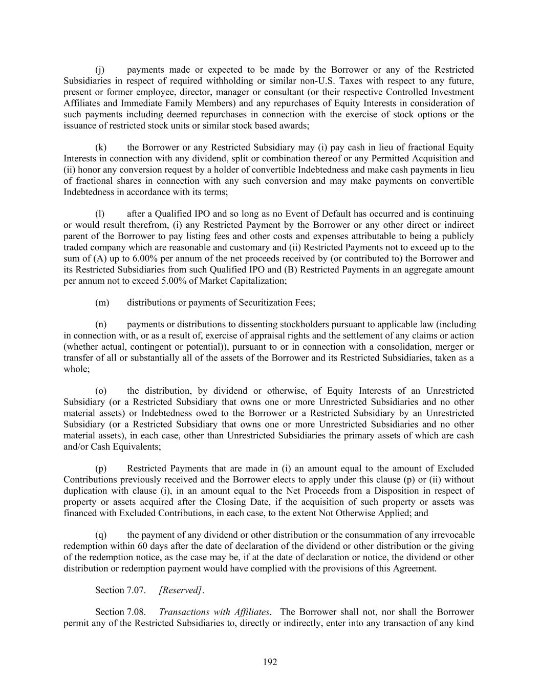 (j) payments made or expected to be made by the Borrower or any of the RestrictedSubsidiaries in respect of required withholding or similar non-U.S. Taxes with respect to any future,present or former employee, director, manager or consultant (or their respective Controlled InvestmentAffiliates and Immediate Family Members) and any repurchases of Equity Interests in consideration ofsuch payments including deemed repurchases in connection with the exercise of stock options or theissuance of restricted stock units or similar stock based awards;(k) the Borrower or any Restricted Subsidiary may (i) pay cash in lieu of fractional EquityInterests in connection with any dividend, split or combination thereof or any Permitted Acquisition and(ii) honor any conversion request by a holder of convertible Indebtedness and make cash payments in lieuof fractional shares in connection with any such conversion and may make payments on convertibleIndebtedness in accordance with its terms;(l) after a Qualified IPO and so long as no Event of Default has occurred and is continuingor would result therefrom, (i) any Restricted Payment by the Borrower or any other direct or indirectparent of the Borrower to pay listing fees and other costs and expenses attributable to being a publiclytraded company which are reasonable and customary and (ii) Restricted Payments not to exceed up to thesum of (A) up to 6.00% per annum of the net proceeds received by (or contributed to) the Borrower andits Restricted Subsidiaries from such Qualified IPO and (B) Restricted Payments in an aggregate amountper annum not to exceed 5.00% of Market Capitalization;(m) distributions or payments of Securitization Fees;(n) payments or distributions to dissenting stockholders pursuant to applicable law (includingin connection with, or as a result of, exercise of appraisal rights and the settlement of any claims or action(whether actual, contingent or potential)), pursuant to or in connection with a consolidation, merger ortransfer of all or substantially all of the assets of the Borrower and its Restricted Subsidiaries, taken as awhole; (o) the distribution, by dividend or otherwise, of Equity Interests of an UnrestrictedSubsidiary (or a Restricted Subsidiary that owns one or more Unrestricted Subsidiaries and no othermaterial assets) or Indebtedness owed to the Borrower or a Restricted Subsidiary by an UnrestrictedSubsidiary (or a Restricted Subsidiary that owns one or more Unrestricted Subsidiaries and no othermaterial assets), in each case, other than Unrestricted Subsidiaries the primary assets of which are cashand/or Cash Equivalents;(p) Restricted Payments that are made in (i) an amount equal to the amount of ExcludedContributions previously received and the Borrower elects to apply under this clause (p) or (ii) withoutduplication with clause (i), in an amount equal to the Net Proceeds from a Disposition in respect ofproperty or assets acquired after the Closing Date, if the acquisition of such property or assets wasfinanced with Excluded Contributions, in each case, to the extent Not Otherwise Applied; and(q) the payment of any dividend or other distribution or the consummation of any irrevocableredemption within 60 days after the date of declaration of the dividend or other distribution or the givingof the redemption notice, as the case may be, if at the date of declaration or notice, the dividend or otherdistribution or redemption payment would have complied with the provisions of this Agreement.Section 7.07. [Reserved].Section 7.08. Transactions with Affiliates. The Borrower shall not, nor shall the Borrowerpermit any of the Restricted Subsidiaries to, directly or indirectly, enter into any transaction of any kind192
