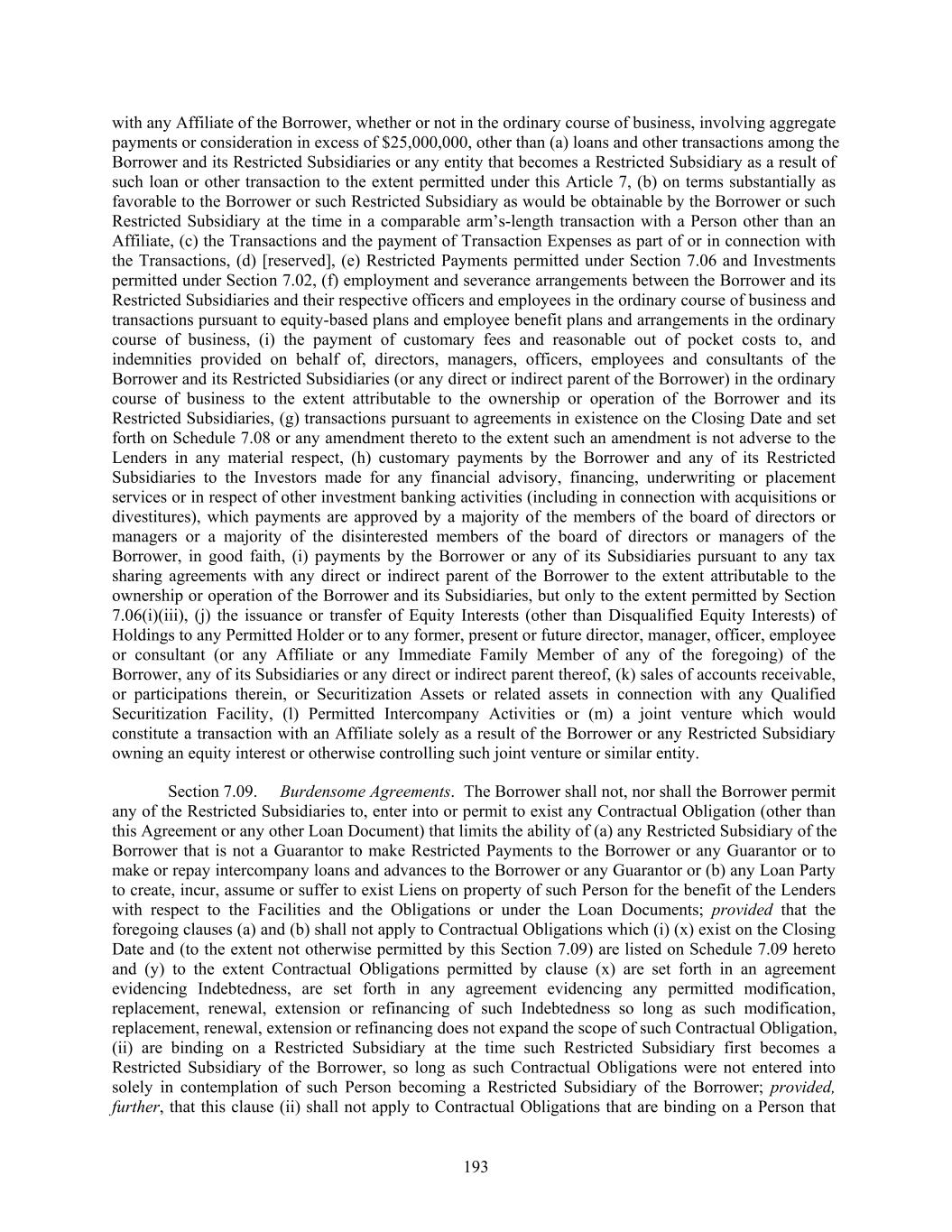 with any Affiliate of the Borrower, whether or not in the ordinary course of business, involving aggregatepayments or consideration in excess of $25,000,000, other than (a) loans and other transactions among theBorrower and its Restricted Subsidiaries or any entity that becomes a Restricted Subsidiary as a result ofsuch loan or other transaction to the extent permitted under this Article 7, (b) on terms substantially asfavorable to the Borrower or such Restricted Subsidiary as would be obtainable by the Borrower or suchRestricted Subsidiary at the time in a comparable arm’s-length transaction with a Person other than anAffiliate, (c) the Transactions and the payment of Transaction Expenses as part of or in connection withthe Transactions, (d) [reserved], (e) Restricted Payments permitted under Section 7.06 and Investmentspermitted under Section 7.02, (f) employment and severance arrangements between the Borrower and itsRestricted Subsidiaries and their respective officers and employees in the ordinary course of business andtransactions pursuant to equity-based plans and employee benefit plans and arrangements in the ordinarycourse of business, (i) the payment of customary fees and reasonable out of pocket costs to, andindemnities provided on behalf of, directors, managers, officers, employees and consultants of theBorrower and its Restricted Subsidiaries (or any direct or indirect parent of the Borrower) in the ordinarycourse of business to the extent attributable to the ownership or operation of the Borrower and itsRestricted Subsidiaries, (g) transactions pursuant to agreements in existence on the Closing Date and setforth on Schedule 7.08 or any amendment thereto to the extent such an amendment is not adverse to theLenders in any material respect, (h) customary payments by the Borrower and any of its RestrictedSubsidiaries to the Investors made for any financial advisory, financing, underwriting or placementservices or in respect of other investment banking activities (including in connection with acquisitions ordivestitures), which payments are approved by a majority of the members of the board of directors ormanagers or a majority of the disinterested members of the board of directors or managers of theBorrower, in good faith, (i) payments by the Borrower or any of its Subsidiaries pursuant to any taxsharing agreements with any direct or indirect parent of the Borrower to the extent attributable to theownership or operation of the Borrower and its Subsidiaries, but only to the extent permitted by Section7.06(i)(iii), (j) the issuance or transfer of Equity Interests (other than Disqualified Equity Interests) ofHoldings to any Permitted Holder or to any former, present or future director, manager, officer, employeeor consultant (or any Affiliate or any Immediate Family Member of any of the foregoing) of theBorrower, any of its Subsidiaries or any direct or indirect parent thereof, (k) sales of accounts receivable,or participations therein, or Securitization Assets or related assets in connection with any QualifiedSecuritization Facility, (l) Permitted Intercompany Activities or (m) a joint venture which wouldconstitute a transaction with an Affiliate solely as a result of the Borrower or any Restricted Subsidiaryowning an equity interest or otherwise controlling such joint venture or similar entity.Section 7.09. Burdensome Agreements. The Borrower shall not, nor shall the Borrower permitany of the Restricted Subsidiaries to, enter into or permit to exist any Contractual Obligation (other thanthis Agreement or any other Loan Document) that limits the ability of (a) any Restricted Subsidiary of theBorrower that is not a Guarantor to make Restricted Payments to the Borrower or any Guarantor or tomake or repay intercompany loans and advances to the Borrower or any Guarantor or (b) any Loan Partyto create, incur, assume or suffer to exist Liens on property of such Person for the benefit of the Lenderswith respect to the Facilities and the Obligations or under the Loan Documents; provided that theforegoing clauses (a) and (b) shall not apply to Contractual Obligations which (i) (x) exist on the ClosingDate and (to the extent not otherwise permitted by this Section 7.09) are listed on Schedule 7.09 heretoand (y) to the extent Contractual Obligations permitted by clause (x) are set forth in an agreementevidencing Indebtedness, are set forth in any agreement evidencing any permitted modification,replacement, renewal, extension or refinancing of such Indebtedness so long as such modification,replacement, renewal, extension or refinancing does not expand the scope of such Contractual Obligation,(ii) are binding on a Restricted Subsidiary at the time such Restricted Subsidiary first becomes aRestricted Subsidiary of the Borrower, so long as such Contractual Obligations were not entered intosolely in contemplation of such Person becoming a Restricted Subsidiary of the Borrower; provided,further, that this clause (ii) shall not apply to Contractual Obligations that are binding on a Person that193