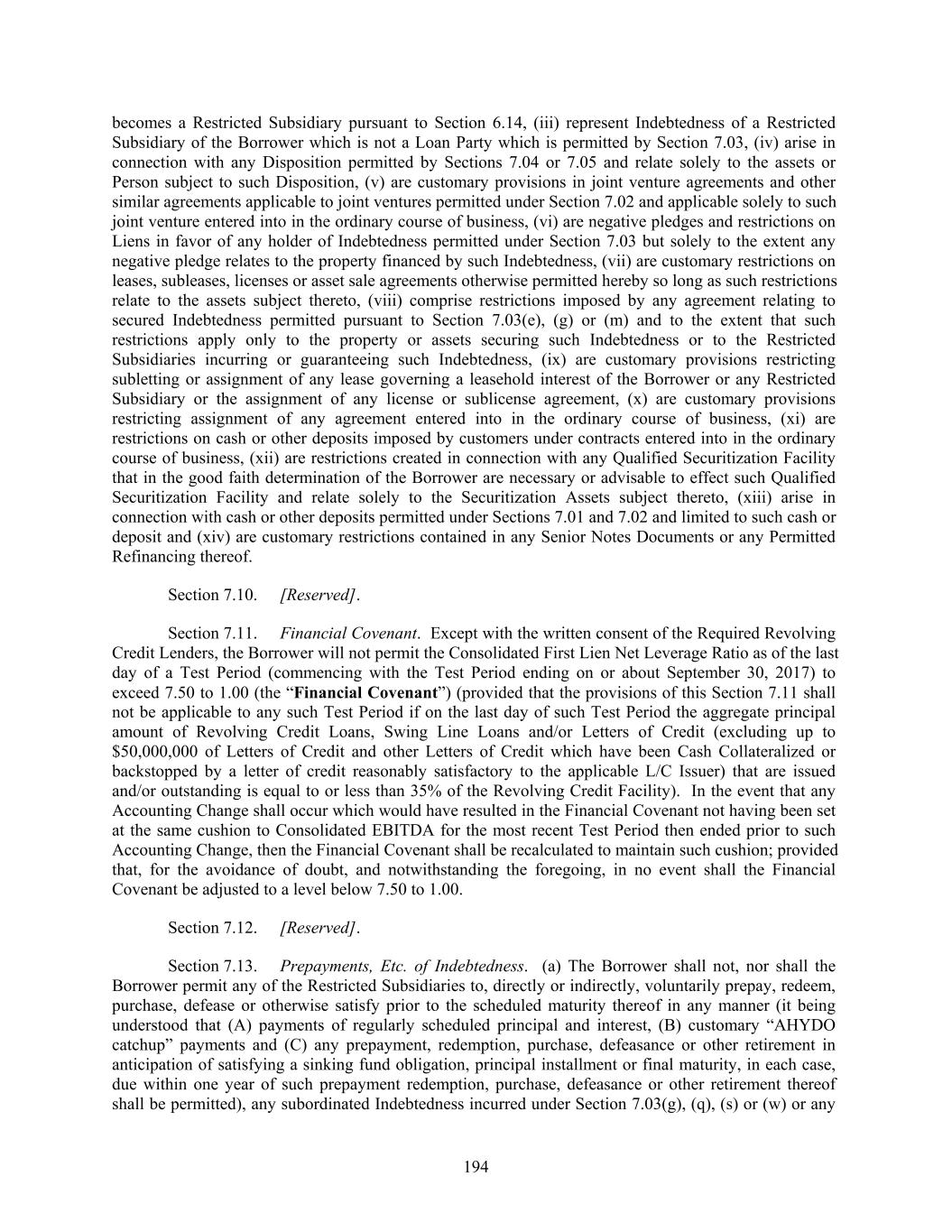 becomes a Restricted Subsidiary pursuant to Section 6.14, (iii) represent Indebtedness of a RestrictedSubsidiary of the Borrower which is not a Loan Party which is permitted by Section 7.03, (iv) arise inconnection with any Disposition permitted by Sections 7.04 or 7.05 and relate solely to the assets orPerson subject to such Disposition, (v) are customary provisions in joint venture agreements and othersimilar agreements applicable to joint ventures permitted under Section 7.02 and applicable solely to suchjoint venture entered into in the ordinary course of business, (vi) are negative pledges and restrictions onLiens in favor of any holder of Indebtedness permitted under Section 7.03 but solely to the extent anynegative pledge relates to the property financed by such Indebtedness, (vii) are customary restrictions onleases, subleases, licenses or asset sale agreements otherwise permitted hereby so long as such restrictionsrelate to the assets subject thereto, (viii) comprise restrictions imposed by any agreement relating tosecured Indebtedness permitted pursuant to Section 7.03(e), (g) or (m) and to the extent that suchrestrictions apply only to the property or assets securing such Indebtedness or to the RestrictedSubsidiaries incurring or guaranteeing such Indebtedness, (ix) are customary provisions restrictingsubletting or assignment of any lease governing a leasehold interest of the Borrower or any RestrictedSubsidiary or the assignment of any license or sublicense agreement, (x) are customary provisionsrestricting assignment of any agreement entered into in the ordinary course of business, (xi) arerestrictions on cash or other deposits imposed by customers under contracts entered into in the ordinarycourse of business, (xii) are restrictions created in connection with any Qualified Securitization Facilitythat in the good faith determination of the Borrower are necessary or advisable to effect such QualifiedSecuritization Facility and relate solely to the Securitization Assets subject thereto, (xiii) arise inconnection with cash or other deposits permitted under Sections 7.01 and 7.02 and limited to such cash ordeposit and (xiv) are customary restrictions contained in any Senior Notes Documents or any PermittedRefinancing thereof.Section 7.10. [Reserved].Section 7.11. Financial Covenant. Except with the written consent of the Required RevolvingCredit Lenders, the Borrower will not permit the Consolidated First Lien Net Leverage Ratio as of the lastday of a Test Period (commencing with the Test Period ending on or about September 30, 2017) toexceed 7.50 to 1.00 (the “Financial Covenant”) (provided that the provisions of this Section 7.11 shallnot be applicable to any such Test Period if on the last day of such Test Period the aggregate principalamount of Revolving Credit Loans, Swing Line Loans and/or Letters of Credit (excluding up to$50,000,000 of Letters of Credit and other Letters of Credit which have been Cash Collateralized orbackstopped by a letter of credit reasonably satisfactory to the applicable L/C Issuer) that are issuedand/or outstanding is equal to or less than 35% of the Revolving Credit Facility). In the event that anyAccounting Change shall occur which would have resulted in the Financial Covenant not having been setat the same cushion to Consolidated EBITDA for the most recent Test Period then ended prior to suchAccounting Change, then the Financial Covenant shall be recalculated to maintain such cushion; providedthat, for the avoidance of doubt, and notwithstanding the foregoing, in no event shall the FinancialCovenant be adjusted to a level below 7.50 to 1.00.Section 7.12. [Reserved].Section 7.13. Prepayments, Etc. of Indebtedness. (a) The Borrower shall not, nor shall theBorrower permit any of the Restricted Subsidiaries to, directly or indirectly, voluntarily prepay, redeem,purchase, defease or otherwise satisfy prior to the scheduled maturity thereof in any manner (it beingunderstood that (A) payments of regularly scheduled principal and interest, (B) customary “AHYDOcatchup” payments and (C) any prepayment, redemption, purchase, defeasance or other retirement inanticipation of satisfying a sinking fund obligation, principal installment or final maturity, in each case,due within one year of such prepayment redemption, purchase, defeasance or other retirement thereofshall be permitted), any subordinated Indebtedness incurred under Section 7.03(g), (q), (s) or (w) or any194