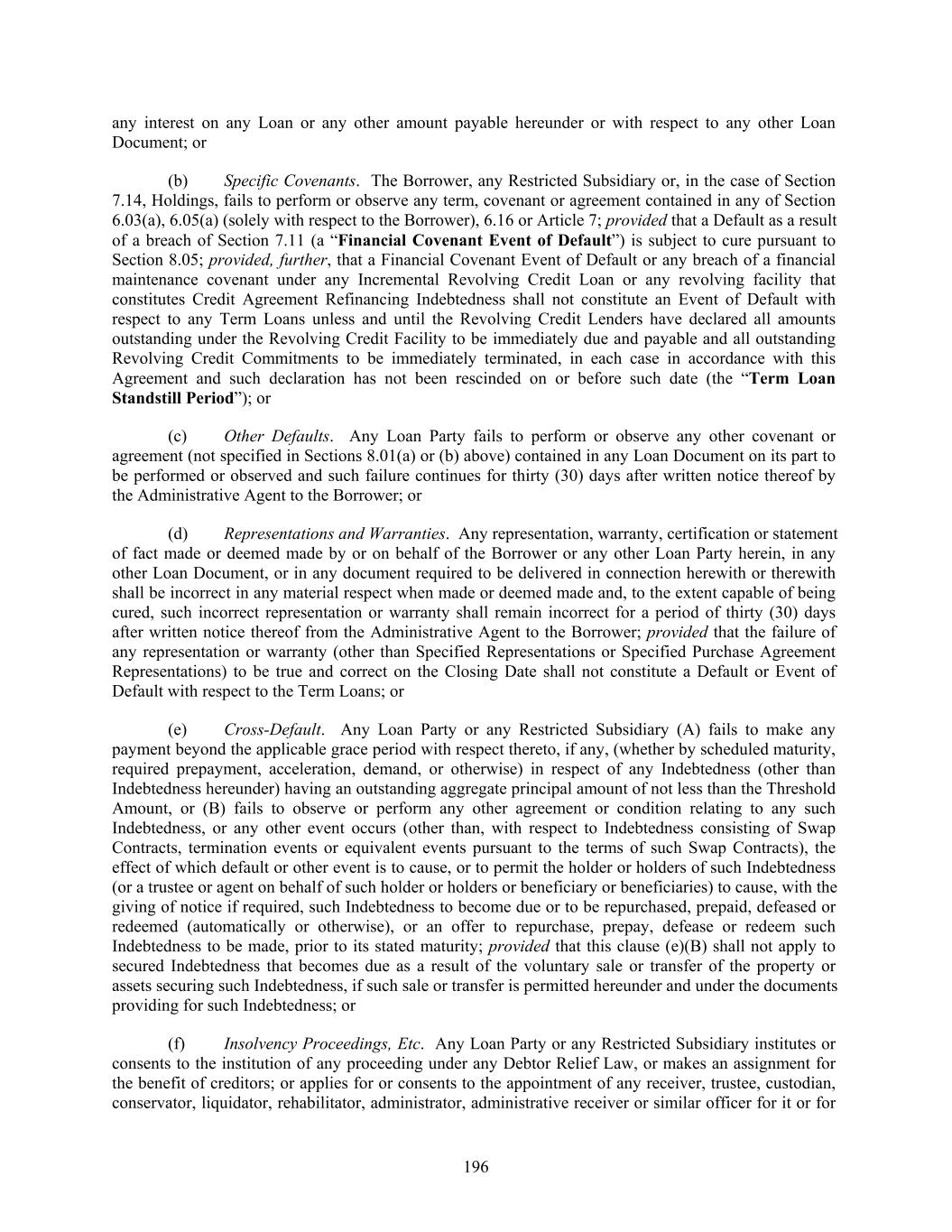 any interest on any Loan or any other amount payable hereunder or with respect to any other LoanDocument; or(b) Specific Covenants. The Borrower, any Restricted Subsidiary or, in the case of Section7.14, Holdings, fails to perform or observe any term, covenant or agreement contained in any of Section6.03(a), 6.05(a) (solely with respect to the Borrower), 6.16 or Article 7; provided that a Default as a resultof a breach of Section 7.11 (a “Financial Covenant Event of Default”) is subject to cure pursuant to Section 8.05; provided, further, that a Financial Covenant Event of Default or any breach of a financialmaintenance covenant under any Incremental Revolving Credit Loan or any revolving facility thatconstitutes Credit Agreement Refinancing Indebtedness shall not constitute an Event of Default withrespect to any Term Loans unless and until the Revolving Credit Lenders have declared all amountsoutstanding under the Revolving Credit Facility to be immediately due and payable and all outstandingRevolving Credit Commitments to be immediately terminated, in each case in accordance with thisAgreement and such declaration has not been rescinded on or before such date (the “Term LoanStandstill Period”); or(c) Other Defaults. Any Loan Party fails to perform or observe any other covenant oragreement (not specified in Sections 8.01(a) or (b) above) contained in any Loan Document on its part tobe performed or observed and such failure continues for thirty (30) days after written notice thereof bythe Administrative Agent to the Borrower; or(d) Representations and Warranties. Any representation, warranty, certification or statementof fact made or deemed made by or on behalf of the Borrower or any other Loan Party herein, in anyother Loan Document, or in any document required to be delivered in connection herewith or therewithshall be incorrect in any material respect when made or deemed made and, to the extent capable of beingcured, such incorrect representation or warranty shall remain incorrect for a period of thirty (30) daysafter written notice thereof from the Administrative Agent to the Borrower; provided that the failure ofany representation or warranty (other than Specified Representations or Specified Purchase AgreementRepresentations) to be true and correct on the Closing Date shall not constitute a Default or Event ofDefault with respect to the Term Loans; or(e) Cross-Default. Any Loan Party or any Restricted Subsidiary (A) fails to make anypayment beyond the applicable grace period with respect thereto, if any, (whether by scheduled maturity,required prepayment, acceleration, demand, or otherwise) in respect of any Indebtedness (other thanIndebtedness hereunder) having an outstanding aggregate principal amount of not less than the ThresholdAmount, or (B) fails to observe or perform any other agreement or condition relating to any suchIndebtedness, or any other event occurs (other than, with respect to Indebtedness consisting of SwapContracts, termination events or equivalent events pursuant to the terms of such Swap Contracts), theeffect of which default or other event is to cause, or to permit the holder or holders of such Indebtedness(or a trustee or agent on behalf of such holder or holders or beneficiary or beneficiaries) to cause, with thegiving of notice if required, such Indebtedness to become due or to be repurchased, prepaid, defeased orredeemed (automatically or otherwise), or an offer to repurchase, prepay, defease or redeem suchIndebtedness to be made, prior to its stated maturity; provided that this clause (e) (B) shall not apply tosecured Indebtedness that becomes due as a result of the voluntary sale or transfer of the property orassets securing such Indebtedness, if such sale or transfer is permitted hereunder and under the documentsproviding for such Indebtedness; or(f) Insolvency Proceedings, Etc. Any Loan Party or any Restricted Subsidiary institutes orconsents to the institution of any proceeding under any Debtor Relief Law, or makes an assignment forthe benefit of creditors; or applies for or consents to the appointment of any receiver, trustee, custodian,conservator, liquidator, rehabilitator, administrator, administrative receiver or similar officer for it or for196