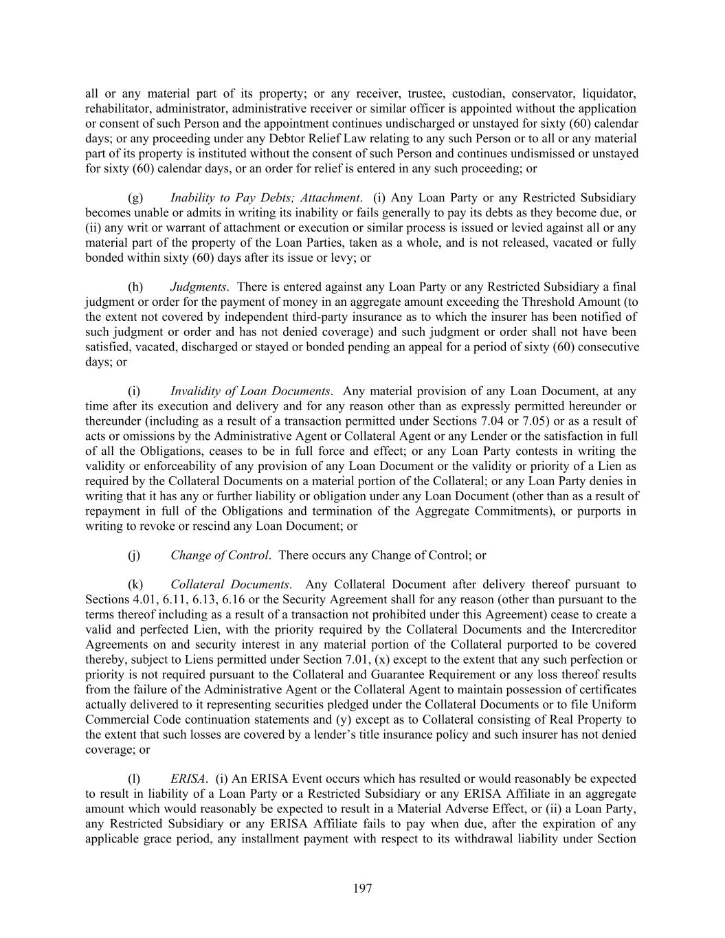 all or any material part of its property; or any receiver, trustee, custodian, conservator, liquidator,rehabilitator, administrator, administrative receiver or similar officer is appointed without the applicationor consent of such Person and the appointment continues undischarged or unstayed for sixty (60) calendardays; or any proceeding under any Debtor Relief Law relating to any such Person or to all or any materialpart of its property is instituted without the consent of such Person and continues undismissed or unstayedfor sixty (60) calendar days, or an order for relief is entered in any such proceeding; or(g) Inability to Pay Debts; Attachment. (i) Any Loan Party or any Restricted Subsidiarybecomes unable or admits in writing its inability or fails generally to pay its debts as they become due, or(ii) any writ or warrant of attachment or execution or similar process is issued or levied against all or anymaterial part of the property of the Loan Parties, taken as a whole, and is not released, vacated or fullybonded within sixty (60) days after its issue or levy; or(h) Judgments. There is entered against any Loan Party or any Restricted Subsidiary a finaljudgment or order for the payment of money in an aggregate amount exceeding the Threshold Amount (tothe extent not covered by independent third-party insurance as to which the insurer has been notified ofsuch judgment or order and has not denied coverage) and such judgment or order shall not have beensatisfied, vacated, discharged or stayed or bonded pending an appeal for a period of sixty (60) consecutivedays; or(i) Invalidity of Loan Documents. Any material provision of any Loan Document, at anytime after its execution and delivery and for any reason other than as expressly permitted hereunder orthereunder (including as a result of a transaction permitted under Sections 7.04 or 7.05) or as a result ofacts or omissions by the Administrative Agent or Collateral Agent or any Lender or the satisfaction in fullof all the Obligations, ceases to be in full force and effect; or any Loan Party contests in writing thevalidity or enforceability of any provision of any Loan Document or the validity or priority of a Lien asrequired by the Collateral Documents on a material portion of the Collateral; or any Loan Party denies inwriting that it has any or further liability or obligation under any Loan Document (other than as a result ofrepayment in full of the Obligations and termination of the Aggregate Commitments), or purports inwriting to revoke or rescind any Loan Document; or(j) Change of Control. There occurs any Change of Control; or(k) Collateral Documents. Any Collateral Document after delivery thereof pursuant toSections 4.01, 6.11, 6.13, 6.16 or the Security Agreement shall for any reason (other than pursuant to theterms thereof including as a result of a transaction not prohibited under this Agreement) cease to create avalid and perfected Lien, with the priority required by the Collateral Documents and the IntercreditorAgreements on and security interest in any material portion of the Collateral purported to be coveredthereby, subject to Liens permitted under Section 7.01, (x) except to the extent that any such perfection orpriority is not required pursuant to the Collateral and Guarantee Requirement or any loss thereof resultsfrom the failure of the Administrative Agent or the Collateral Agent to maintain possession of certificatesactually delivered to it representing securities pledged under the Collateral Documents or to file UniformCommercial Code continuation statements and (y) except as to Collateral consisting of Real Property tothe extent that such losses are covered by a lender’s title insurance policy and such insurer has not deniedcoverage; or(l) ERISA. (i) An ERISA Event occurs which has resulted or would reasonably be expectedto result in liability of a Loan Party or a Restricted Subsidiary or any ERISA Affiliate in an aggregateamount which would reasonably be expected to result in a Material Adverse Effect, or (ii) a Loan Party,any Restricted Subsidiary or any ERISA Affiliate fails to pay when due, after the expiration of anyapplicable grace period, any installment payment with respect to its withdrawal liability under Section197