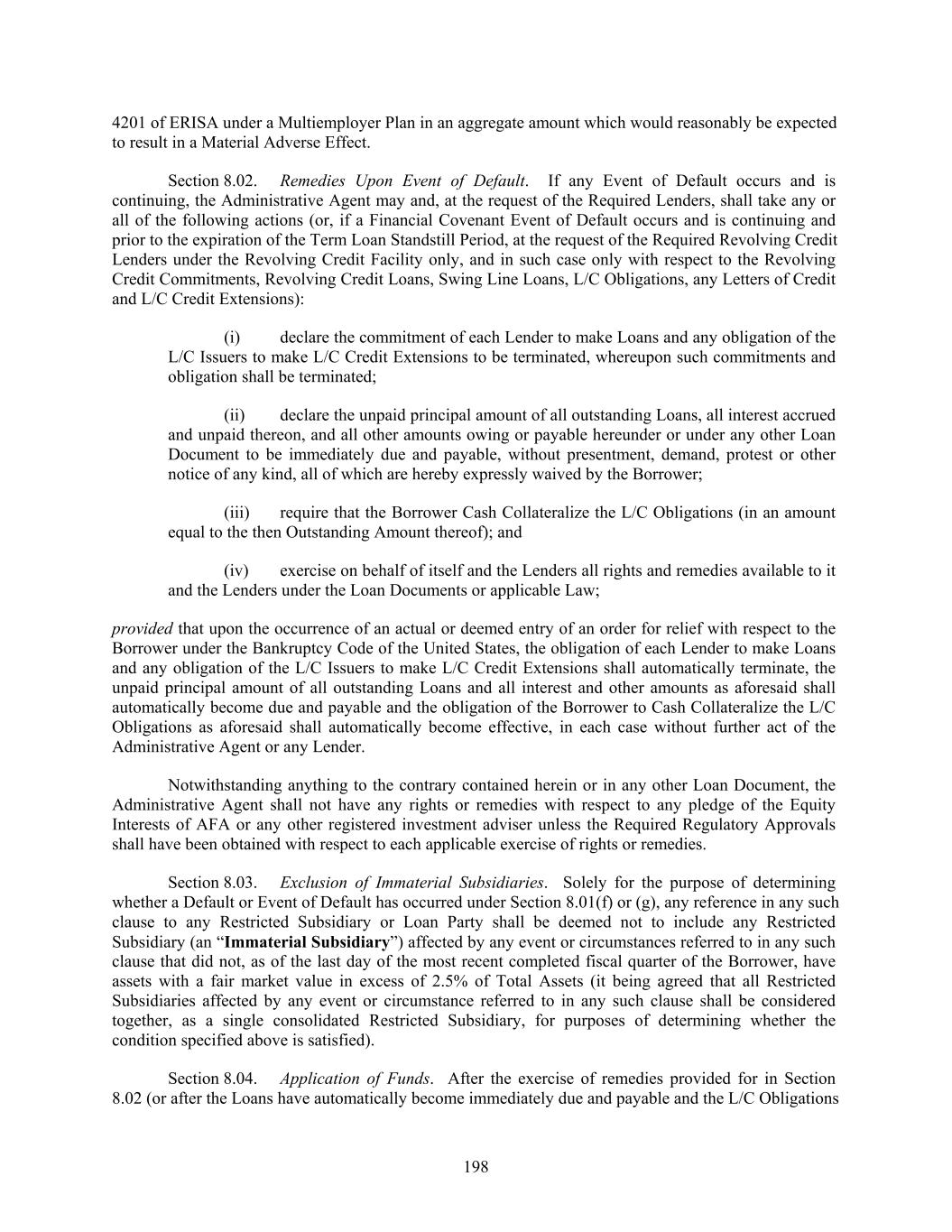 4201 of ERISA under a Multiemployer Plan in an aggregate amount which would reasonably be expectedto result in a Material Adverse Effect.Section 8.02. Remedies Upon Event of Default. If any Event of Default occurs and iscontinuing, the Administrative Agent may and, at the request of the Required Lenders, shall take any orall of the following actions (or, if a Financial Covenant Event of Default occurs and is continuing andprior to the expiration of the Term Loan Standstill Period, at the request of the Required Revolving CreditLenders under the Revolving Credit Facility only, and in such case only with respect to the RevolvingCredit Commitments, Revolving Credit Loans, Swing Line Loans, L/C Obligations, any Letters of Creditand L/C Credit Extensions):(i) declare the commitment of each Lender to make Loans and any obligation of theL/C Issuers to make L/C Credit Extensions to be terminated, whereupon such commitments andobligation shall be terminated;(ii) declare the unpaid principal amount of all outstanding Loans, all interest accruedand unpaid thereon, and all other amounts owing or payable hereunder or under any other LoanDocument to be immediately due and payable, without presentment, demand, protest or othernotice of any kind, all of which are hereby expressly waived by the Borrower;(iii) require that the Borrower Cash Collateralize the L/C Obligations (in an amountequal to the then Outstanding Amount thereof); and(iv) exercise on behalf of itself and the Lenders all rights and remedies available to itand the Lenders under the Loan Documents or applicable Law;provided that upon the occurrence of an actual or deemed entry of an order for relief with respect to theBorrower under the Bankruptcy Code of the United States, the obligation of each Lender to make Loansand any obligation of the L/C Issuers to make L/C Credit Extensions shall automatically terminate, theunpaid principal amount of all outstanding Loans and all interest and other amounts as aforesaid shallautomatically become due and payable and the obligation of the Borrower to Cash Collateralize the L/CObligations as aforesaid shall automatically become effective, in each case without further act of theAdministrative Agent or any Lender.Notwithstanding anything to the contrary contained herein or in any other Loan Document, theAdministrative Agent shall not have any rights or remedies with respect to any pledge of the EquityInterests of AFA or any other registered investment adviser unless the Required Regulatory Approvalsshall have been obtained with respect to each applicable exercise of rights or remedies.Section 8.03. Exclusion of Immaterial Subsidiaries. Solely for the purpose of determiningwhether a Default or Event of Default has occurred under Section 8.01(f) or (g), any reference in any suchclause to any Restricted Subsidiary or Loan Party shall be deemed not to include any RestrictedSubsidiary (an “Immaterial Subsidiary”) affected by any event or circumstances referred to in any suchclause that did not, as of the last day of the most recent completed fiscal quarter of the Borrower, haveassets with a fair market value in excess of 2.5% of Total Assets (it being agreed that all RestrictedSubsidiaries affected by any event or circumstance referred to in any such clause shall be consideredtogether, as a single consolidated Restricted Subsidiary, for purposes of determining whether thecondition specified above is satisfied).Section 8.04. Application of Funds. After the exercise of remedies provided for in Section8.02 (or after the Loans have automatically become immediately due and payable and the L/C Obligations198