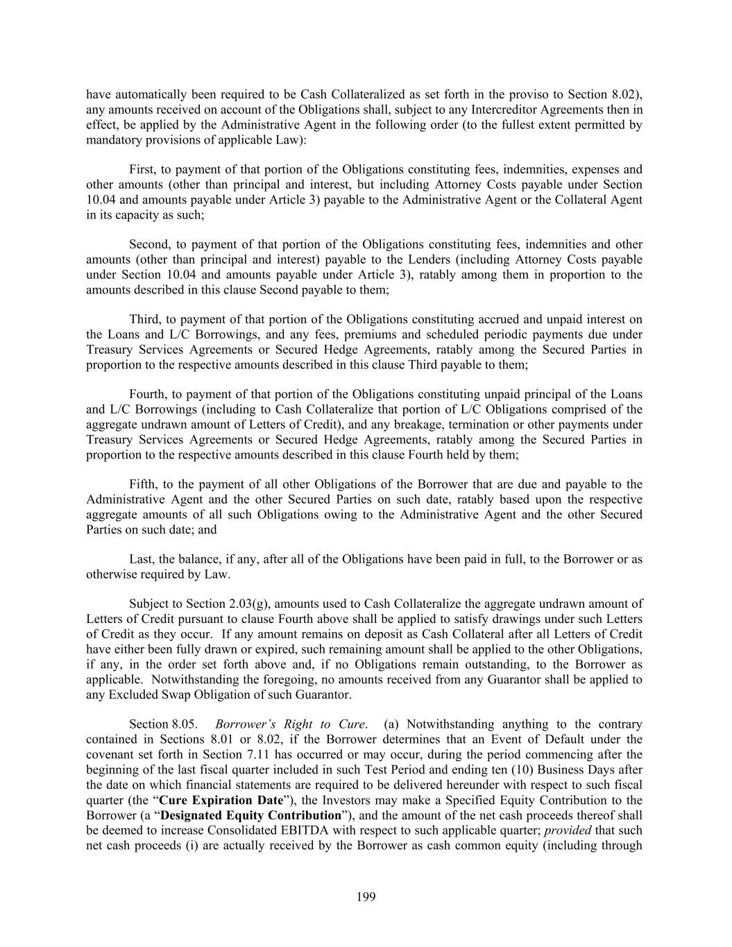 have automatically been required to be Cash Collateralized as set forth in the proviso to Section 8.02),any amounts received on account of the Obligations shall, subject to any Intercreditor Agreements then ineffect, be applied by the Administrative Agent in the following order (to the fullest extent permitted bymandatory provisions of applicable Law):First, to payment of that portion of the Obligations constituting fees, indemnities, expenses andother amounts (other than principal and interest, but including Attorney Costs payable under Section10.04 and amounts payable under Article 3) payable to the Administrative Agent or the Collateral Agentin its capacity as such;Second, to payment of that portion of the Obligations constituting fees, indemnities and otheramounts (other than principal and interest) payable to the Lenders (including Attorney Costs payableunder Section 10.04 and amounts payable under Article 3), ratably among them in proportion to theamounts described in this clause Second payable to them;Third, to payment of that portion of the Obligations constituting accrued and unpaid interest onthe Loans and L/C Borrowings, and any fees, premiums and scheduled periodic payments due underTreasury Services Agreements or Secured Hedge Agreements, ratably among the Secured Parties inproportion to the respective amounts described in this clause Third payable to them;Fourth, to payment of that portion of the Obligations constituting unpaid principal of the Loansand L/C Borrowings (including to Cash Collateralize that portion of L/C Obligations comprised of theaggregate undrawn amount of Letters of Credit), and any breakage, termination or other payments underTreasury Services Agreements or Secured Hedge Agreements, ratably among the Secured Parties inproportion to the respective amounts described in this clause Fourth held by them;Fifth, to the payment of all other Obligations of the Borrower that are due and payable to theAdministrative Agent and the other Secured Parties on such date, ratably based upon the respectiveaggregate amounts of all such Obligations owing to the Administrative Agent and the other SecuredParties on such date; andLast, the balance, if any, after all of the Obligations have been paid in full, to the Borrower or asotherwise required by Law.Subject to Section 2.03(g), amounts used to Cash Collateralize the aggregate undrawn amount ofLetters of Credit pursuant to clause Fourth above shall be applied to satisfy drawings under such Lettersof Credit as they occur. If any amount remains on deposit as Cash Collateral after all Letters of Credithave either been fully drawn or expired, such remaining amount shall be applied to the other Obligations,if any, in the order set forth above and, if no Obligations remain outstanding, to the Borrower asapplicable. Notwithstanding the foregoing, no amounts received from any Guarantor shall be applied toany Excluded Swap Obligation of such Guarantor.Section 8.05. Borrower’s Right to Cure. (a) Notwithstanding anything to the contrarycontained in Sections 8.01 or 8.02, if the Borrower determines that an Event of Default under thecovenant set forth in Section 7.11 has occurred or may occur, during the period commencing after thebeginning of the last fiscal quarter included in such Test Period and ending ten (10) Business Days afterthe date on which financial statements are required to be delivered hereunder with respect to such fiscalquarter (the “Cure Expiration Date”), the Investors may make a Specified Equity Contribution to theBorrower (a “Designated Equity Contribution”), and the amount of the net cash proceeds thereof shallbe deemed to increase Consolidated EBITDA with respect to such applicable quarter; provided that suchnet cash proceeds (i) are actually received by the Borrower as cash common equity (including through199