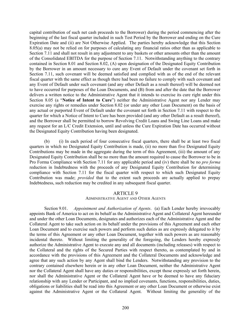 capital contribution of such net cash proceeds to the Borrower) during the period commencing after thebeginning of the last fiscal quarter included in such Test Period by the Borrower and ending on the CureExpiration Date and (ii) are Not Otherwise Applied. The parties hereby acknowledge that this Section8.05(a) may not be relied on for purposes of calculating any financial ratios other than as applicable to Section 7.11 and shall not result in any adjustment to any baskets or other amounts other than the amountof the Consolidated EBITDA for the purpose of Section 7.11. Notwithstanding anything to the contrarycontained in Section 8.01 and Section 8.02, (A) upon designation of the Designated Equity Contributionby the Borrower in an amount necessary to cure any Event of Default under the covenant set forth in Section 7.11, such covenant will be deemed satisfied and complied with as of the end of the relevantfiscal quarter with the same effect as though there had been no failure to comply with such covenant andany Event of Default under such covenant (and any other Default as a result thereof) will be deemed notto have occurred for purposes of the Loan Documents, and (B) from and after the date that the Borrowerdelivers a written notice to the Administrative Agent that it intends to exercise its cure right under thisSection 8.05 (a “Notice of Intent to Cure”) neither the Administrative Agent nor any Lender mayexercise any rights or remedies under Section 8.02 (or under any other Loan Document) on the basis ofany actual or purported Event of Default under the covenant set forth in Section 7.11 with respect to thequarter for which a Notice of Intent to Cure has been provided (and any other Default as a result thereof),and the Borrower shall be permitted to borrow Revolving Credit Loans and Swing Line Loans and makeany request for an L/C Credit Extension, until and unless the Cure Expiration Date has occurred withoutthe Designated Equity Contribution having been designated.(b) (i) In each period of four consecutive fiscal quarters, there shall be at least two fiscalquarters in which no Designated Equity Contribution is made, (ii) no more than five Designated EquityContributions may be made in the aggregate during the term of this Agreement, (iii) the amount of anyDesignated Equity Contribution shall be no more than the amount required to cause the Borrower to be inPro Forma Compliance with Section 7.11 for any applicable period and (iv) there shall be no pro formareduction in Indebtedness with the proceeds of any Designated Equity Contribution for determiningcompliance with Section 7.11 for the fiscal quarter with respect to which such Designated EquityContribution was made; provided that to the extent such proceeds are actually applied to prepayIndebtedness, such reduction may be credited in any subsequent fiscal quarter.ARTICLE 9ADMINISTRATIVE AGENT AND OTHER AGENTSSection 9.01. Appointment and Authorization of Agents. (a) Each Lender hereby irrevocablyappoints Bank of America to act on its behalf as the Administrative Agent and Collateral Agent hereunderand under the other Loan Documents, designates and authorizes each of the Administrative Agent and theCollateral Agent to take such action on its behalf under the provisions of this Agreement and each otherLoan Document and to exercise such powers and perform such duties as are expressly delegated to it bythe terms of this Agreement or any other Loan Document, together with such powers as are reasonablyincidental thereto. Without limiting the generality of the foregoing, the Lenders hereby expresslyauthorize the Administrative Agent to execute any and all documents (including releases) with respect tothe Collateral and the rights of the Secured Parties with respect thereto, as contemplated by and inaccordance with the provisions of this Agreement and the Collateral Documents and acknowledge andagree that any such action by any Agent shall bind the Lenders. Notwithstanding any provision to thecontrary contained elsewhere herein or in any other Loan Document, neither the Administrative Agentnor the Collateral Agent shall have any duties or responsibilities, except those expressly set forth herein,nor shall the Administrative Agent or the Collateral Agent have or be deemed to have any fiduciaryrelationship with any Lender or Participant, and no implied covenants, functions, responsibilities, duties,obligations or liabilities shall be read into this Agreement or any other Loan Document or otherwise existagainst the Administrative Agent or the Collateral Agent. Without limiting the generality of the200