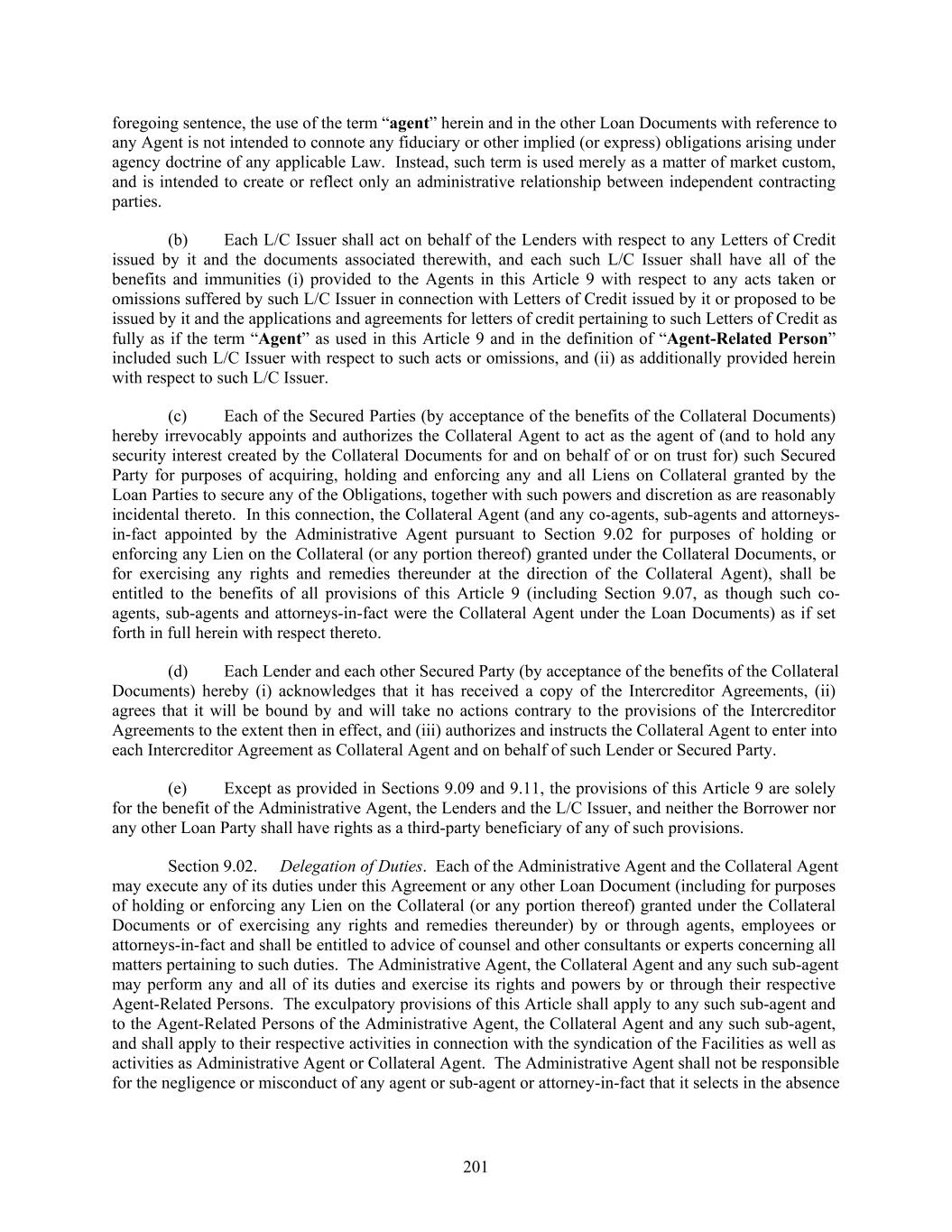 foregoing sentence, the use of the term “agent” herein and in the other Loan Documents with reference toany Agent is not intended to connote any fiduciary or other implied (or express) obligations arising underagency doctrine of any applicable Law. Instead, such term is used merely as a matter of market custom,and is intended to create or reflect only an administrative relationship between independent contractingparties. (b) Each L/C Issuer shall act on behalf of the Lenders with respect to any Letters of Creditissued by it and the documents associated therewith, and each such L/C Issuer shall have all of thebenefits and immunities (i) provided to the Agents in this Article 9 with respect to any acts taken oromissions suffered by such L/C Issuer in connection with Letters of Credit issued by it or proposed to beissued by it and the applications and agreements for letters of credit pertaining to such Letters of Credit asfully as if the term “Agent” as used in this Article 9 and in the definition of “Agent-Related Person”included such L/C Issuer with respect to such acts or omissions, and (ii) as additionally provided hereinwith respect to such L/C Issuer.(c) Each of the Secured Parties (by acceptance of the benefits of the Collateral Documents)hereby irrevocably appoints and authorizes the Collateral Agent to act as the agent of (and to hold anysecurity interest created by the Collateral Documents for and on behalf of or on trust for) such SecuredParty for purposes of acquiring, holding and enforcing any and all Liens on Collateral granted by theLoan Parties to secure any of the Obligations, together with such powers and discretion as are reasonablyincidental thereto. In this connection, the Collateral Agent (and any co-agents, sub-agents and attorneys-in-fact appointed by the Administrative Agent pursuant to Section 9.02 for purposes of holding orenforcing any Lien on the Collateral (or any portion thereof) granted under the Collateral Documents, orfor exercising any rights and remedies thereunder at the direction of the Collateral Agent), shall beentitled to the benefits of all provisions of this Article 9 (including Section 9.07, as though such co-agents, sub-agents and attorneys-in-fact were the Collateral Agent under the Loan Documents) as if setforth in full herein with respect thereto.(d) Each Lender and each other Secured Party (by acceptance of the benefits of the CollateralDocuments) hereby (i) acknowledges that it has received a copy of the Intercreditor Agreements, (ii)agrees that it will be bound by and will take no actions contrary to the provisions of the IntercreditorAgreements to the extent then in effect, and (iii) authorizes and instructs the Collateral Agent to enter intoeach Intercreditor Agreement as Collateral Agent and on behalf of such Lender or Secured Party.(e) Except as provided in Sections 9.09 and 9.11, the provisions of this Article 9 are solelyfor the benefit of the Administrative Agent, the Lenders and the L/C Issuer, and neither the Borrower norany other Loan Party shall have rights as a third-party beneficiary of any of such provisions.Section 9.02. Delegation of Duties. Each of the Administrative Agent and the Collateral Agentmay execute any of its duties under this Agreement or any other Loan Document (including for purposesof holding or enforcing any Lien on the Collateral (or any portion thereof) granted under the CollateralDocuments or of exercising any rights and remedies thereunder) by or through agents, employees orattorneys-in-fact and shall be entitled to advice of counsel and other consultants or experts concerning allmatters pertaining to such duties. The Administrative Agent, the Collateral Agent and any such sub-agentmay perform any and all of its duties and exercise its rights and powers by or through their respectiveAgent-Related Persons. The exculpatory provisions of this Article shall apply to any such sub-agent andto the Agent-Related Persons of the Administrative Agent, the Collateral Agent and any such sub-agent,and shall apply to their respective activities in connection with the syndication of the Facilities as well asactivities as Administrative Agent or Collateral Agent. The Administrative Agent shall not be responsiblefor the negligence or misconduct of any agent or sub-agent or attorney-in-fact that it selects in the absence201