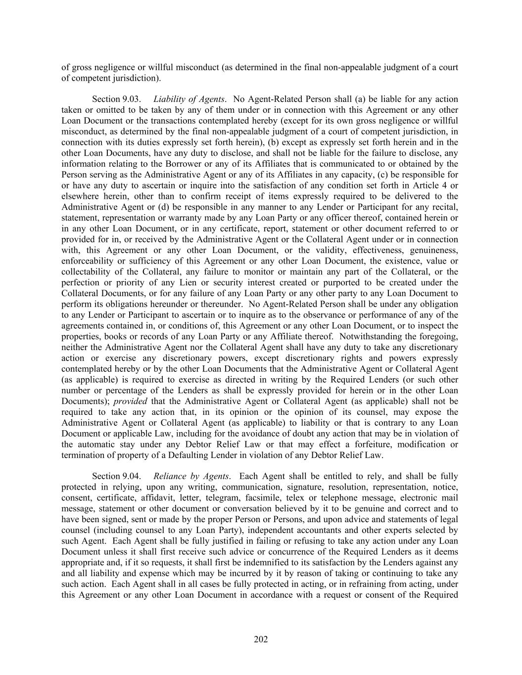 of gross negligence or willful misconduct (as determined in the final non-appealable judgment of a courtof competent jurisdiction).Section 9.03. Liability of Agents. No Agent-Related Person shall (a) be liable for any actiontaken or omitted to be taken by any of them under or in connection with this Agreement or any otherLoan Document or the transactions contemplated hereby (except for its own gross negligence or willfulmisconduct, as determined by the final non-appealable judgment of a court of competent jurisdiction, inconnection with its duties expressly set forth herein), (b) except as expressly set forth herein and in theother Loan Documents, have any duty to disclose, and shall not be liable for the failure to disclose, anyinformation relating to the Borrower or any of its Affiliates that is communicated to or obtained by thePerson serving as the Administrative Agent or any of its Affiliates in any capacity, (c) be responsible foror have any duty to ascertain or inquire into the satisfaction of any condition set forth in Article 4 orelsewhere herein, other than to confirm receipt of items expressly required to be delivered to theAdministrative Agent or (d) be responsible in any manner to any Lender or Participant for any recital,statement, representation or warranty made by any Loan Party or any officer thereof, contained herein orin any other Loan Document, or in any certificate, report, statement or other document referred to orprovided for in, or received by the Administrative Agent or the Collateral Agent under or in connectionwith, this Agreement or any other Loan Document, or the validity, effectiveness, genuineness,enforceability or sufficiency of this Agreement or any other Loan Document, the existence, value orcollectability of the Collateral, any failure to monitor or maintain any part of the Collateral, or theperfection or priority of any Lien or security interest created or purported to be created under theCollateral Documents, or for any failure of any Loan Party or any other party to any Loan Document toperform its obligations hereunder or thereunder. No Agent-Related Person shall be under any obligationto any Lender or Participant to ascertain or to inquire as to the observance or performance of any of theagreements contained in, or conditions of, this Agreement or any other Loan Document, or to inspect theproperties, books or records of any Loan Party or any Affiliate thereof. Notwithstanding the foregoing,neither the Administrative Agent nor the Collateral Agent shall have any duty to take any discretionaryaction or exercise any discretionary powers, except discretionary rights and powers expresslycontemplated hereby or by the other Loan Documents that the Administrative Agent or Collateral Agent(as applicable) is required to exercise as directed in writing by the Required Lenders (or such othernumber or percentage of the Lenders as shall be expressly provided for herein or in the other LoanDocuments); provided that the Administrative Agent or Collateral Agent (as applicable) shall not berequired to take any action that, in its opinion or the opinion of its counsel, may expose theAdministrative Agent or Collateral Agent (as applicable) to liability or that is contrary to any LoanDocument or applicable Law, including for the avoidance of doubt any action that may be in violation ofthe automatic stay under any Debtor Relief Law or that may effect a forfeiture, modification ortermination of property of a Defaulting Lender in violation of any Debtor Relief Law.Section 9.04. Reliance by Agents. Each Agent shall be entitled to rely, and shall be fullyprotected in relying, upon any writing, communication, signature, resolution, representation, notice,consent, certificate, affidavit, letter, telegram, facsimile, telex or telephone message, electronic mailmessage, statement or other document or conversation believed by it to be genuine and correct and tohave been signed, sent or made by the proper Person or Persons, and upon advice and statements of legalcounsel (including counsel to any Loan Party), independent accountants and other experts selected bysuch Agent. Each Agent shall be fully justified in failing or refusing to take any action under any LoanDocument unless it shall first receive such advice or concurrence of the Required Lenders as it deemsappropriate and, if it so requests, it shall first be indemnified to its satisfaction by the Lenders against anyand all liability and expense which may be incurred by it by reason of taking or continuing to take anysuch action. Each Agent shall in all cases be fully protected in acting, or in refraining from acting, underthis Agreement or any other Loan Document in accordance with a request or consent of the Required202