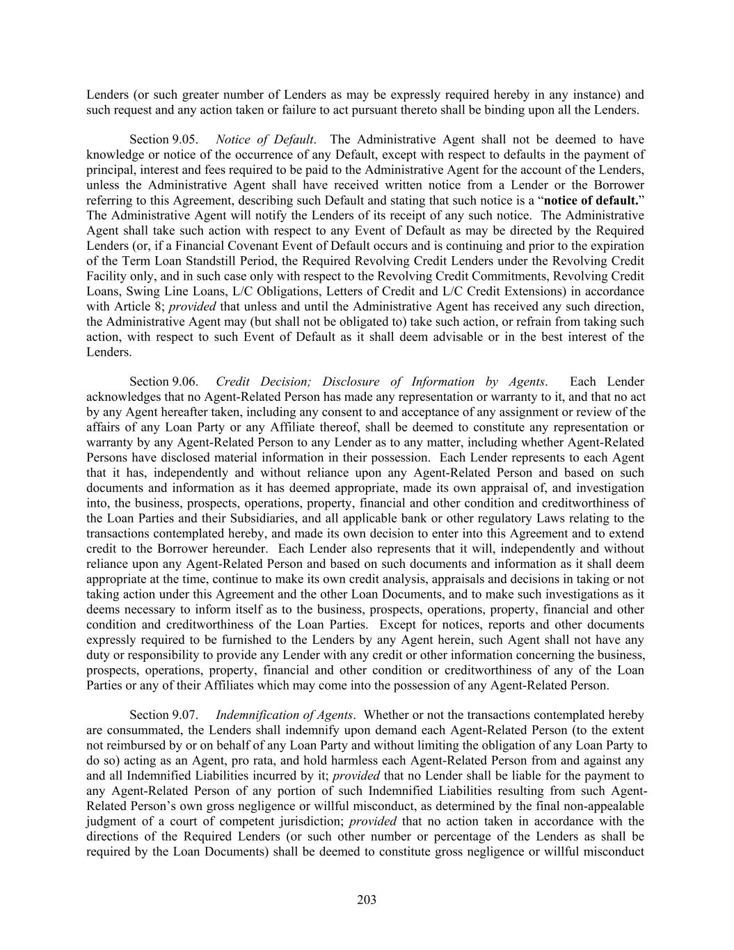 Lenders (or such greater number of Lenders as may be expressly required hereby in any instance) andsuch request and any action taken or failure to act pursuant thereto shall be binding upon all the Lenders.Section 9.05. Notice of Default. The Administrative Agent shall not be deemed to haveknowledge or notice of the occurrence of any Default, except with respect to defaults in the payment ofprincipal, interest and fees required to be paid to the Administrative Agent for the account of the Lenders,unless the Administrative Agent shall have received written notice from a Lender or the Borrowerreferring to this Agreement, describing such Default and stating that such notice is a “notice of default.”The Administrative Agent will notify the Lenders of its receipt of any such notice. The AdministrativeAgent shall take such action with respect to any Event of Default as may be directed by the RequiredLenders (or, if a Financial Covenant Event of Default occurs and is continuing and prior to the expirationof the Term Loan Standstill Period, the Required Revolving Credit Lenders under the Revolving CreditFacility only, and in such case only with respect to the Revolving Credit Commitments, Revolving CreditLoans, Swing Line Loans, L/C Obligations, Letters of Credit and L/C Credit Extensions) in accordancewith Article 8; provided that unless and until the Administrative Agent has received any such direction,the Administrative Agent may (but shall not be obligated to) take such action, or refrain from taking suchaction, with respect to such Event of Default as it shall deem advisable or in the best interest of theLenders.Section 9.06. Credit Decision; Disclosure of Information by Agents. Each Lenderacknowledges that no Agent-Related Person has made any representation or warranty to it, and that no actby any Agent hereafter taken, including any consent to and acceptance of any assignment or review of theaffairs of any Loan Party or any Affiliate thereof, shall be deemed to constitute any representation orwarranty by any Agent-Related Person to any Lender as to any matter, including whether Agent-RelatedPersons have disclosed material information in their possession. Each Lender represents to each Agentthat it has, independently and without reliance upon any Agent-Related Person and based on suchdocuments and information as it has deemed appropriate, made its own appraisal of, and investigationinto, the business, prospects, operations, property, financial and other condition and creditworthiness ofthe Loan Parties and their Subsidiaries, and all applicable bank or other regulatory Laws relating to thetransactions contemplated hereby, and made its own decision to enter into this Agreement and to extendcredit to the Borrower hereunder. Each Lender also represents that it will, independently and withoutreliance upon any Agent-Related Person and based on such documents and information as it shall deemappropriate at the time, continue to make its own credit analysis, appraisals and decisions in taking or nottaking action under this Agreement and the other Loan Documents, and to make such investigations as itdeems necessary to inform itself as to the business, prospects, operations, property, financial and othercondition and creditworthiness of the Loan Parties. Except for notices, reports and other documentsexpressly required to be furnished to the Lenders by any Agent herein, such Agent shall not have anyduty or responsibility to provide any Lender with any credit or other information concerning the business,prospects, operations, property, financial and other condition or creditworthiness of any of the LoanParties or any of their Affiliates which may come into the possession of any Agent-Related Person.Section 9.07. Indemnification of Agents. Whether or not the transactions contemplated herebyare consummated, the Lenders shall indemnify upon demand each Agent-Related Person (to the extentnot reimbursed by or on behalf of any Loan Party and without limiting the obligation of any Loan Party todo so) acting as an Agent, pro rata, and hold harmless each Agent-Related Person from and against anyand all Indemnified Liabilities incurred by it; provided that no Lender shall be liable for the payment toany Agent-Related Person of any portion of such Indemnified Liabilities resulting from such Agent-Related Person’s own gross negligence or willful misconduct, as determined by the final non-appealablejudgment of a court of competent jurisdiction; provided that no action taken in accordance with thedirections of the Required Lenders (or such other number or percentage of the Lenders as shall berequired by the Loan Documents) shall be deemed to constitute gross negligence or willful misconduct203