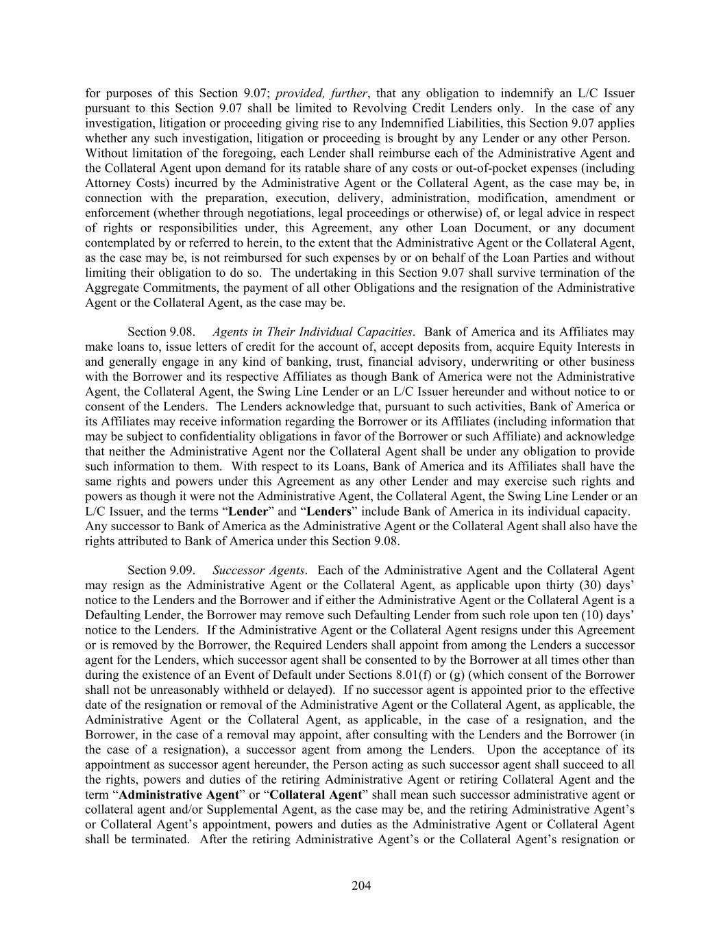for purposes of this Section 9.07; provided, further, that any obligation to indemnify an L/C Issuerpursuant to this Section 9.07 shall be limited to Revolving Credit Lenders only. In the case of anyinvestigation, litigation or proceeding giving rise to any Indemnified Liabilities, this Section 9.07 applieswhether any such investigation, litigation or proceeding is brought by any Lender or any other Person.Without limitation of the foregoing, each Lender shall reimburse each of the Administrative Agent andthe Collateral Agent upon demand for its ratable share of any costs or out-of-pocket expenses (includingAttorney Costs) incurred by the Administrative Agent or the Collateral Agent, as the case may be, inconnection with the preparation, execution, delivery, administration, modification, amendment orenforcement (whether through negotiations, legal proceedings or otherwise) of, or legal advice in respectof rights or responsibilities under, this Agreement, any other Loan Document, or any documentcontemplated by or referred to herein, to the extent that the Administrative Agent or the Collateral Agent,as the case may be, is not reimbursed for such expenses by or on behalf of the Loan Parties and withoutlimiting their obligation to do so. The undertaking in this Section 9.07 shall survive termination of theAggregate Commitments, the payment of all other Obligations and the resignation of the AdministrativeAgent or the Collateral Agent, as the case may be.Section 9.08. Agents in Their Individual Capacities. Bank of America and its Affiliates maymake loans to, issue letters of credit for the account of, accept deposits from, acquire Equity Interests inand generally engage in any kind of banking, trust, financial advisory, underwriting or other businesswith the Borrower and its respective Affiliates as though Bank of America were not the AdministrativeAgent, the Collateral Agent, the Swing Line Lender or an L/C Issuer hereunder and without notice to orconsent of the Lenders. The Lenders acknowledge that, pursuant to such activities, Bank of America orits Affiliates may receive information regarding the Borrower or its Affiliates (including information thatmay be subject to confidentiality obligations in favor of the Borrower or such Affiliate) and acknowledgethat neither the Administrative Agent nor the Collateral Agent shall be under any obligation to providesuch information to them. With respect to its Loans, Bank of America and its Affiliates shall have thesame rights and powers under this Agreement as any other Lender and may exercise such rights andpowers as though it were not the Administrative Agent, the Collateral Agent, the Swing Line Lender or anL/C Issuer, and the terms “Lender” and “Lenders” include Bank of America in its individual capacity.Any successor to Bank of America as the Administrative Agent or the Collateral Agent shall also have therights attributed to Bank of America under this Section 9.08.Section 9.09. Successor Agents. Each of the Administrative Agent and the Collateral Agentmay resign as the Administrative Agent or the Collateral Agent, as applicable upon thirty (30) days’notice to the Lenders and the Borrower and if either the Administrative Agent or the Collateral Agent is aDefaulting Lender, the Borrower may remove such Defaulting Lender from such role upon ten (10) days’notice to the Lenders. If the Administrative Agent or the Collateral Agent resigns under this Agreementor is removed by the Borrower, the Required Lenders shall appoint from among the Lenders a successoragent for the Lenders, which successor agent shall be consented to by the Borrower at all times other thanduring the existence of an Event of Default under Sections 8.01(f) or (g) (which consent of the Borrowershall not be unreasonably withheld or delayed). If no successor agent is appointed prior to the effectivedate of the resignation or removal of the Administrative Agent or the Collateral Agent, as applicable, theAdministrative Agent or the Collateral Agent, as applicable, in the case of a resignation, and theBorrower, in the case of a removal may appoint, after consulting with the Lenders and the Borrower (inthe case of a resignation), a successor agent from among the Lenders. Upon the acceptance of itsappointment as successor agent hereunder, the Person acting as such successor agent shall succeed to allthe rights, powers and duties of the retiring Administrative Agent or retiring Collateral Agent and theterm “Administrative Agent” or “Collateral Agent” shall mean such successor administrative agent orcollateral agent and/or Supplemental Agent, as the case may be, and the retiring Administrative Agent’sor Collateral Agent’s appointment, powers and duties as the Administrative Agent or Collateral Agentshall be terminated. After the retiring Administrative Agent’s or the Collateral Agent’s resignation or204
