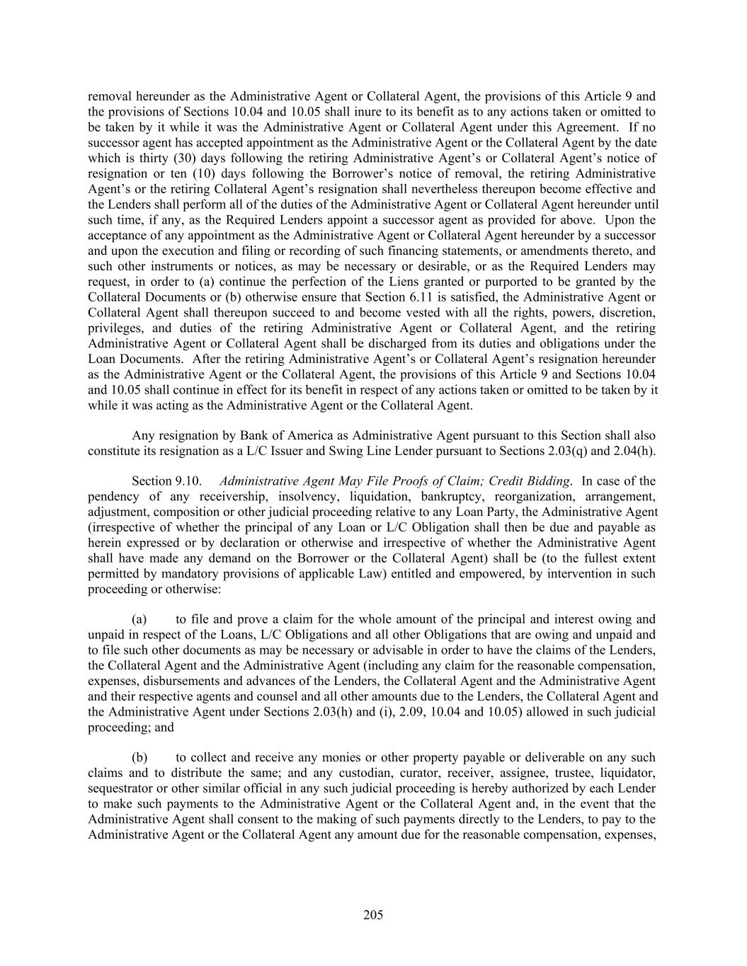 removal hereunder as the Administrative Agent or Collateral Agent, the provisions of this Article 9 andthe provisions of Sections 10.04 and 10.05 shall inure to its benefit as to any actions taken or omitted tobe taken by it while it was the Administrative Agent or Collateral Agent under this Agreement. If nosuccessor agent has accepted appointment as the Administrative Agent or the Collateral Agent by the datewhich is thirty (30) days following the retiring Administrative Agent’s or Collateral Agent’s notice ofresignation or ten (10) days following the Borrower’s notice of removal, the retiring AdministrativeAgent’s or the retiring Collateral Agent’s resignation shall nevertheless thereupon become effective andthe Lenders shall perform all of the duties of the Administrative Agent or Collateral Agent hereunder untilsuch time, if any, as the Required Lenders appoint a successor agent as provided for above. Upon theacceptance of any appointment as the Administrative Agent or Collateral Agent hereunder by a successorand upon the execution and filing or recording of such financing statements, or amendments thereto, andsuch other instruments or notices, as may be necessary or desirable, or as the Required Lenders mayrequest, in order to (a) continue the perfection of the Liens granted or purported to be granted by theCollateral Documents or (b) otherwise ensure that Section 6.11 is satisfied, the Administrative Agent orCollateral Agent shall thereupon succeed to and become vested with all the rights, powers, discretion,privileges, and duties of the retiring Administrative Agent or Collateral Agent, and the retiringAdministrative Agent or Collateral Agent shall be discharged from its duties and obligations under theLoan Documents. After the retiring Administrative Agent’s or Collateral Agent’s resignation hereunderas the Administrative Agent or the Collateral Agent, the provisions of this Article 9 and Sections 10.04and 10.05 shall continue in effect for its benefit in respect of any actions taken or omitted to be taken by itwhile it was acting as the Administrative Agent or the Collateral Agent.Any resignation by Bank of America as Administrative Agent pursuant to this Section shall alsoconstitute its resignation as a L/C Issuer and Swing Line Lender pursuant to Sections 2.03(q) and 2.04(h).Section 9.10. Administrative Agent May File Proofs of Claim; Credit Bidding. In case of thependency of any receivership, insolvency, liquidation, bankruptcy, reorganization, arrangement,adjustment, composition or other judicial proceeding relative to any Loan Party, the Administrative Agent(irrespective of whether the principal of any Loan or L/C Obligation shall then be due and payable asherein expressed or by declaration or otherwise and irrespective of whether the Administrative Agentshall have made any demand on the Borrower or the Collateral Agent) shall be (to the fullest extentpermitted by mandatory provisions of applicable Law) entitled and empowered, by intervention in suchproceeding or otherwise:(a) to file and prove a claim for the whole amount of the principal and interest owing andunpaid in respect of the Loans, L/C Obligations and all other Obligations that are owing and unpaid andto file such other documents as may be necessary or advisable in order to have the claims of the Lenders,the Collateral Agent and the Administrative Agent (including any claim for the reasonable compensation,expenses, disbursements and advances of the Lenders, the Collateral Agent and the Administrative Agentand their respective agents and counsel and all other amounts due to the Lenders, the Collateral Agent andthe Administrative Agent under Sections 2.03(h) and (i), 2.09, 10.04 and 10.05) allowed in such judicialproceeding; and(b) to collect and receive any monies or other property payable or deliverable on any suchclaims and to distribute the same; and any custodian, curator, receiver, assignee, trustee, liquidator,sequestrator or other similar official in any such judicial proceeding is hereby authorized by each Lenderto make such payments to the Administrative Agent or the Collateral Agent and, in the event that theAdministrative Agent shall consent to the making of such payments directly to the Lenders, to pay to theAdministrative Agent or the Collateral Agent any amount due for the reasonable compensation, expenses,205