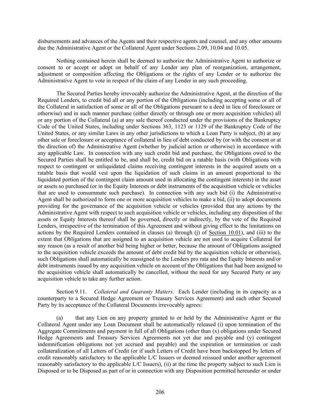 disbursements and advances of the Agents and their respective agents and counsel, and any other amountsdue the Administrative Agent or the Collateral Agent under Sections 2.09, 10.04 and 10.05.Nothing contained herein shall be deemed to authorize the Administrative Agent to authorize orconsent to or accept or adopt on behalf of any Lender any plan of reorganization, arrangement,adjustment or composition affecting the Obligations or the rights of any Lender or to authorize theAdministrative Agent to vote in respect of the claim of any Lender in any such proceeding.The Secured Parties hereby irrevocably authorize the Administrative Agent, at the direction of theRequired Lenders, to credit bid all or any portion of the Obligations (including accepting some or all ofthe Collateral in satisfaction of some or all of the Obligations pursuant to a deed in lieu of foreclosure orotherwise) and in such manner purchase (either directly or through one or more acquisition vehicles) allor any portion of the Collateral (a) at any sale thereof conducted under the provisions of the BankruptcyCode of the United States, including under Sections 363, 1123 or 1129 of the Bankruptcy Code of theUnited States, or any similar Laws in any other jurisdictions to which a Loan Party is subject, (b) at anyother sale or foreclosure or acceptance of collateral in lieu of debt conducted by (or with the consent or atthe direction of) the Administrative Agent (whether by judicial action or otherwise) in accordance withany applicable Law. In connection with any such credit bid and purchase, the Obligations owed to theSecured Parties shall be entitled to be, and shall be, credit bid on a ratable basis (with Obligations withrespect to contingent or unliquidated claims receiving contingent interests in the acquired assets on aratable basis that would vest upon the liquidation of such claims in an amount proportional to theliquidated portion of the contingent claim amount used in allocating the contingent interests) in the assetor assets so purchased (or in the Equity Interests or debt instruments of the acquisition vehicle or vehiclesthat are used to consummate such purchase). In connection with any such bid (i) the AdministrativeAgent shall be authorized to form one or more acquisition vehicles to make a bid, (ii) to adopt documentsproviding for the governance of the acquisition vehicle or vehicles (provided that any actions by theAdministrative Agent with respect to such acquisition vehicle or vehicles, including any disposition of theassets or Equity Interests thereof shall be governed, directly or indirectly, by the vote of the RequiredLenders, irrespective of the termination of this Agreement and without giving effect to the limitations onactions by the Required Lenders contained in clauses (a) through (j) of Section 10.01), and (iii) to theextent that Obligations that are assigned to an acquisition vehicle are not used to acquire Collateral forany reason (as a result of another bid being higher or better, because the amount of Obligations assignedto the acquisition vehicle exceeds the amount of debt credit bid by the acquisition vehicle or otherwise),such Obligations shall automatically be reassigned to the Lenders pro rata and the Equity Interests and/ordebt instruments issued by any acquisition vehicle on account of the Obligations that had been assigned tothe acquisition vehicle shall automatically be cancelled, without the need for any Secured Party or anyacquisition vehicle to take any further action.Section 9.11. Collateral and Guaranty Matters. Each Lender (including in its capacity as acounterparty to a Secured Hedge Agreement or Treasury Services Agreement) and each other SecuredParty by its acceptance of the Collateral Documents irrevocably agrees:(a) that any Lien on any property granted to or held by the Administrative Agent or theCollateral Agent under any Loan Document shall be automatically released (i) upon termination of theAggregate Commitments and payment in full of all Obligations (other than (x) obligations under SecuredHedge Agreements and Treasury Services Agreements not yet due and payable and (y) contingentindemnification obligations not yet accrued and payable) and the expiration or termination or cashcollateralization of all Letters of Credit (or if such Letters of Credit have been backstopped by letters ofcredit reasonably satisfactory to the applicable L/C Issuers or deemed reissued under another agreementreasonably satisfactory to the applicable L/C Issuers), (ii) at the time the property subject to such Lien isDisposed or to be Disposed as part of or in connection with any Disposition permitted hereunder or under206