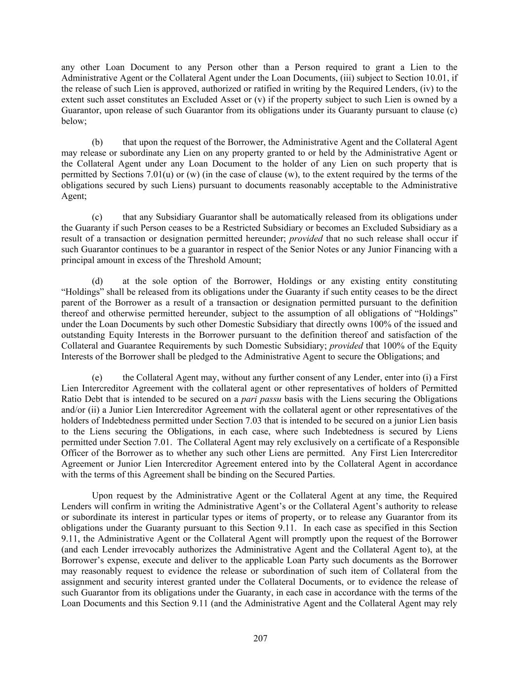 any other Loan Document to any Person other than a Person required to grant a Lien to theAdministrative Agent or the Collateral Agent under the Loan Documents, (iii) subject to Section 10.01, ifthe release of such Lien is approved, authorized or ratified in writing by the Required Lenders, (iv) to theextent such asset constitutes an Excluded Asset or (v) if the property subject to such Lien is owned by aGuarantor, upon release of such Guarantor from its obligations under its Guaranty pursuant to clause (c)below; (b) that upon the request of the Borrower, the Administrative Agent and the Collateral Agentmay release or subordinate any Lien on any property granted to or held by the Administrative Agent orthe Collateral Agent under any Loan Document to the holder of any Lien on such property that ispermitted by Sections 7.01(u) or (w) (in the case of clause (w), to the extent required by the terms of theobligations secured by such Liens) pursuant to documents reasonably acceptable to the AdministrativeAgent; (c) that any Subsidiary Guarantor shall be automatically released from its obligations underthe Guaranty if such Person ceases to be a Restricted Subsidiary or becomes an Excluded Subsidiary as aresult of a transaction or designation permitted hereunder; provided that no such release shall occur ifsuch Guarantor continues to be a guarantor in respect of the Senior Notes or any Junior Financing with aprincipal amount in excess of the Threshold Amount;(d) at the sole option of the Borrower, Holdings or any existing entity constituting“Holdings” shall be released from its obligations under the Guaranty if such entity ceases to be the directparent of the Borrower as a result of a transaction or designation permitted pursuant to the definitionthereof and otherwise permitted hereunder, subject to the assumption of all obligations of “Holdings”under the Loan Documents by such other Domestic Subsidiary that directly owns 100% of the issued andoutstanding Equity Interests in the Borrower pursuant to the definition thereof and satisfaction of theCollateral and Guarantee Requirements by such Domestic Subsidiary; provided that 100% of the EquityInterests of the Borrower shall be pledged to the Administrative Agent to secure the Obligations; and(e) the Collateral Agent may, without any further consent of any Lender, enter into (i) a FirstLien Intercreditor Agreement with the collateral agent or other representatives of holders of PermittedRatio Debt that is intended to be secured on a pari passu basis with the Liens securing the Obligationsand/or (ii) a Junior Lien Intercreditor Agreement with the collateral agent or other representatives of theholders of Indebtedness permitted under Section 7.03 that is intended to be secured on a junior Lien basisto the Liens securing the Obligations, in each case, where such Indebtedness is secured by Lienspermitted under Section 7.01. The Collateral Agent may rely exclusively on a certificate of a ResponsibleOfficer of the Borrower as to whether any such other Liens are permitted. Any First Lien IntercreditorAgreement or Junior Lien Intercreditor Agreement entered into by the Collateral Agent in accordancewith the terms of this Agreement shall be binding on the Secured Parties.Upon request by the Administrative Agent or the Collateral Agent at any time, the RequiredLenders will confirm in writing the Administrative Agent’s or the Collateral Agent’s authority to releaseor subordinate its interest in particular types or items of property, or to release any Guarantor from itsobligations under the Guaranty pursuant to this Section 9.11. In each case as specified in this Section9.11, the Administrative Agent or the Collateral Agent will promptly upon the request of the Borrower(and each Lender irrevocably authorizes the Administrative Agent and the Collateral Agent to), at theBorrower’s expense, execute and deliver to the applicable Loan Party such documents as the Borrowermay reasonably request to evidence the release or subordination of such item of Collateral from theassignment and security interest granted under the Collateral Documents, or to evidence the release ofsuch Guarantor from its obligations under the Guaranty, in each case in accordance with the terms of theLoan Documents and this Section 9.11 (and the Administrative Agent and the Collateral Agent may rely207