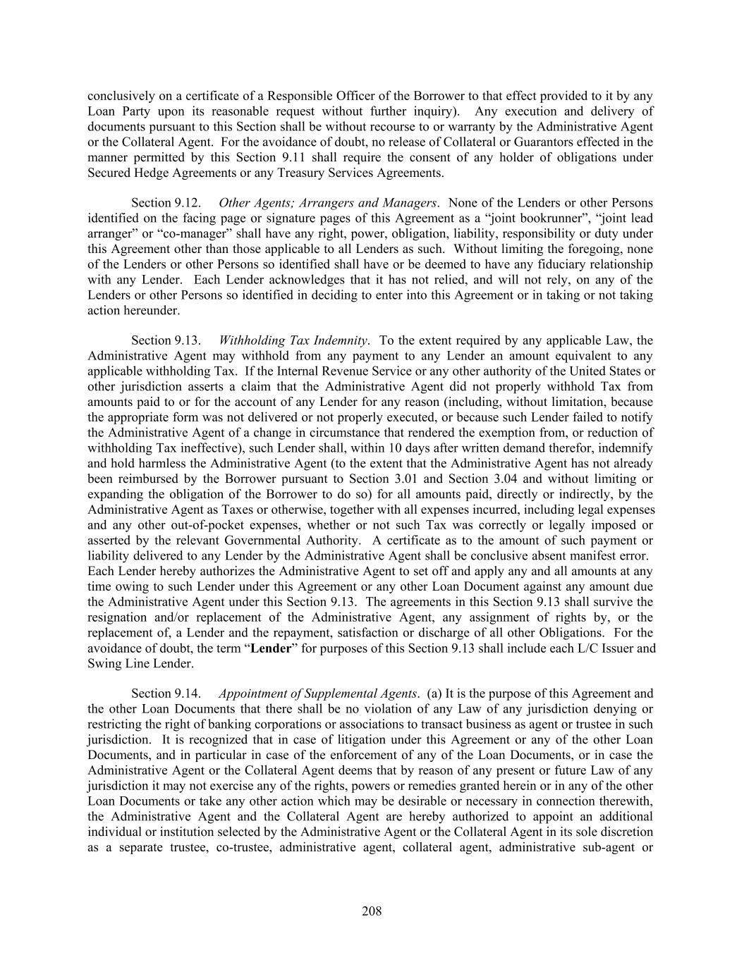 conclusively on a certificate of a Responsible Officer of the Borrower to that effect provided to it by anyLoan Party upon its reasonable request without further inquiry). Any execution and delivery ofdocuments pursuant to this Section shall be without recourse to or warranty by the Administrative Agentor the Collateral Agent. For the avoidance of doubt, no release of Collateral or Guarantors effected in themanner permitted by this Section 9.11 shall require the consent of any holder of obligations underSecured Hedge Agreements or any Treasury Services Agreements.Section 9.12. Other Agents; Arrangers and Managers. None of the Lenders or other Personsidentified on the facing page or signature pages of this Agreement as a “joint bookrunner”, “joint leadarranger” or “co-manager” shall have any right, power, obligation, liability, responsibility or duty underthis Agreement other than those applicable to all Lenders as such. Without limiting the foregoing, noneof the Lenders or other Persons so identified shall have or be deemed to have any fiduciary relationshipwith any Lender. Each Lender acknowledges that it has not relied, and will not rely, on any of theLenders or other Persons so identified in deciding to enter into this Agreement or in taking or not takingaction hereunder.Section 9.13. Withholding Tax Indemnity. To the extent required by any applicable Law, theAdministrative Agent may withhold from any payment to any Lender an amount equivalent to anyapplicable withholding Tax. If the Internal Revenue Service or any other authority of the United States orother jurisdiction asserts a claim that the Administrative Agent did not properly withhold Tax fromamounts paid to or for the account of any Lender for any reason (including, without limitation, becausethe appropriate form was not delivered or not properly executed, or because such Lender failed to notifythe Administrative Agent of a change in circumstance that rendered the exemption from, or reduction ofwithholding Tax ineffective), such Lender shall, within 10 days after written demand therefor, indemnifyand hold harmless the Administrative Agent (to the extent that the Administrative Agent has not alreadybeen reimbursed by the Borrower pursuant to Section 3.01 and Section 3.04 and without limiting orexpanding the obligation of the Borrower to do so) for all amounts paid, directly or indirectly, by theAdministrative Agent as Taxes or otherwise, together with all expenses incurred, including legal expensesand any other out-of-pocket expenses, whether or not such Tax was correctly or legally imposed orasserted by the relevant Governmental Authority. A certificate as to the amount of such payment orliability delivered to any Lender by the Administrative Agent shall be conclusive absent manifest error.Each Lender hereby authorizes the Administrative Agent to set off and apply any and all amounts at anytime owing to such Lender under this Agreement or any other Loan Document against any amount duethe Administrative Agent under this Section 9.13. The agreements in this Section 9.13 shall survive theresignation and/or replacement of the Administrative Agent, any assignment of rights by, or thereplacement of, a Lender and the repayment, satisfaction or discharge of all other Obligations. For theavoidance of doubt, the term “Lender” for purposes of this Section 9.13 shall include each L/C Issuer andSwing Line Lender.Section 9.14. Appointment of Supplemental Agents. (a) It is the purpose of this Agreement andthe other Loan Documents that there shall be no violation of any Law of any jurisdiction denying orrestricting the right of banking corporations or associations to transact business as agent or trustee in suchjurisdiction. It is recognized that in case of litigation under this Agreement or any of the other LoanDocuments, and in particular in case of the enforcement of any of the Loan Documents, or in case theAdministrative Agent or the Collateral Agent deems that by reason of any present or future Law of anyjurisdiction it may not exercise any of the rights, powers or remedies granted herein or in any of the otherLoan Documents or take any other action which may be desirable or necessary in connection therewith,the Administrative Agent and the Collateral Agent are hereby authorized to appoint an additionalindividual or institution selected by the Administrative Agent or the Collateral Agent in its sole discretionas a separate trustee, co-trustee, administrative agent, collateral agent, administrative sub-agent or208