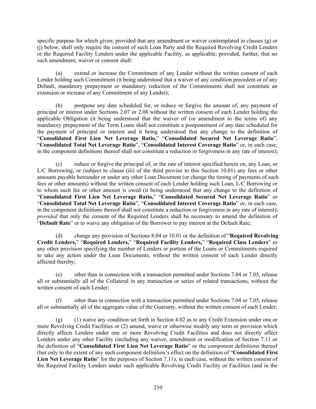 specific purpose for which given; provided that any amendment or waiver contemplated in clauses (g) or (j) below, shall only require the consent of such Loan Party and the Required Revolving Credit Lendersor the Required Facility Lenders under the applicable Facility, as applicable; provided, further, that nosuch amendment, waiver or consent shall:(a) extend or increase the Commitment of any Lender without the written consent of eachLender holding such Commitment (it being understood that a waiver of any condition precedent or of anyDefault, mandatory prepayment or mandatory reduction of the Commitments shall not constitute anextension or increase of any Commitment of any Lender);(b) postpone any date scheduled for, or reduce or forgive the amount of, any payment ofprincipal or interest under Sections 2.07 or 2.08 without the written consent of each Lender holding theapplicable Obligation (it being understood that the waiver of (or amendment to the terms of) anymandatory prepayment of the Term Loans shall not constitute a postponement of any date scheduled forthe payment of principal or interest and it being understood that any change to the definition of“Consolidated First Lien Net Leverage Ratio,” “Consolidated Secured Net Leverage Ratio”,“Consolidated Total Net Leverage Ratio”, “Consolidated Interest Coverage Ratio” or, in each case,in the component definitions thereof shall not constitute a reduction or forgiveness in any rate of interest);(c) reduce or forgive the principal of, or the rate of interest specified herein on, any Loan, orL/C Borrowing, or (subject to clause (iii) of the third proviso to this Section 10.01) any fees or otheramounts payable hereunder or under any other Loan Document (or change the timing of payments of suchfees or other amounts) without the written consent of each Lender holding such Loan, L/C Borrowing orto whom such fee or other amount is owed (it being understood that any change to the definition of“Consolidated First Lien Net Leverage Ratio,” “Consolidated Secured Net Leverage Ratio” or“Consolidated Total Net Leverage Ratio”, “Consolidated Interest Coverage Ratio” or, in each case,in the component definitions thereof shall not constitute a reduction or forgiveness in any rate of interest);provided that only the consent of the Required Lenders shall be necessary to amend the definition of“Default Rate” or to waive any obligation of the Borrower to pay interest at the Default Rate;(d) change any provision of Sections 8.04 or 10.01 or the definition of “Required RevolvingCredit Lenders,” “Required Lenders,” “Required Facility Lenders,” “Required Class Lenders” orany other provision specifying the number of Lenders or portion of the Loans or Commitments requiredto take any action under the Loan Documents, without the written consent of each Lender directlyaffected thereby;(e) other than in connection with a transaction permitted under Sections 7.04 or 7.05, releaseall or substantially all of the Collateral in any transaction or series of related transactions, without thewritten consent of each Lender;(f) other than in connection with a transaction permitted under Sections 7.04 or 7.05, releaseall or substantially all of the aggregate value of the Guaranty, without the written consent of each Lender;(g) (1) waive any condition set forth in Section 4.02 as to any Credit Extension under one ormore Revolving Credit Facilities or (2) amend, waive or otherwise modify any term or provision whichdirectly affects Lenders under one or more Revolving Credit Facilities and does not directly affectLenders under any other Facility (including any waiver, amendment or modification of Section 7.11 orthe definition of “Consolidated First Lien Net Leverage Ratio” or the component definitions thereof(but only to the extent of any such component definition’s effect on the definition of “Consolidated FirstLien Net Leverage Ratio” for the purposes of Section 7.11), in each case, without the written consent ofthe Required Facility Lenders under such applicable Revolving Credit Facility or Facilities (and in the210