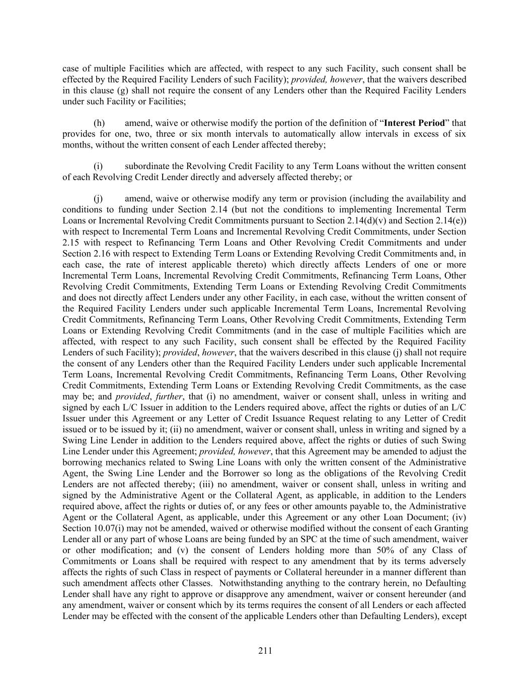case of multiple Facilities which are affected, with respect to any such Facility, such consent shall beeffected by the Required Facility Lenders of such Facility); provided, however, that the waivers describedin this clause (g) shall not require the consent of any Lenders other than the Required Facility Lendersunder such Facility or Facilities;(h) amend, waive or otherwise modify the portion of the definition of “Interest Period” thatprovides for one, two, three or six month intervals to automatically allow intervals in excess of sixmonths, without the written consent of each Lender affected thereby;(i) subordinate the Revolving Credit Facility to any Term Loans without the written consentof each Revolving Credit Lender directly and adversely affected thereby; or(j) amend, waive or otherwise modify any term or provision (including the availability andconditions to funding under Section 2.14 (but not the conditions to implementing Incremental TermLoans or Incremental Revolving Credit Commitments pursuant to Section 2.14(d)(v) and Section 2.14(e))with respect to Incremental Term Loans and Incremental Revolving Credit Commitments, under Section2.15 with respect to Refinancing Term Loans and Other Revolving Credit Commitments and under Section 2.16 with respect to Extending Term Loans or Extending Revolving Credit Commitments and, ineach case, the rate of interest applicable thereto) which directly affects Lenders of one or moreIncremental Term Loans, Incremental Revolving Credit Commitments, Refinancing Term Loans, OtherRevolving Credit Commitments, Extending Term Loans or Extending Revolving Credit Commitmentsand does not directly affect Lenders under any other Facility, in each case, without the written consent ofthe Required Facility Lenders under such applicable Incremental Term Loans, Incremental RevolvingCredit Commitments, Refinancing Term Loans, Other Revolving Credit Commitments, Extending TermLoans or Extending Revolving Credit Commitments (and in the case of multiple Facilities which areaffected, with respect to any such Facility, such consent shall be effected by the Required FacilityLenders of such Facility); provided, however, that the waivers described in this clause (j) shall not requirethe consent of any Lenders other than the Required Facility Lenders under such applicable IncrementalTerm Loans, Incremental Revolving Credit Commitments, Refinancing Term Loans, Other RevolvingCredit Commitments, Extending Term Loans or Extending Revolving Credit Commitments, as the casemay be; and provided, further, that (i) no amendment, waiver or consent shall, unless in writing andsigned by each L/C Issuer in addition to the Lenders required above, affect the rights or duties of an L/CIssuer under this Agreement or any Letter of Credit Issuance Request relating to any Letter of Creditissued or to be issued by it; (ii) no amendment, waiver or consent shall, unless in writing and signed by aSwing Line Lender in addition to the Lenders required above, affect the rights or duties of such SwingLine Lender under this Agreement; provided, however, that this Agreement may be amended to adjust theborrowing mechanics related to Swing Line Loans with only the written consent of the AdministrativeAgent, the Swing Line Lender and the Borrower so long as the obligations of the Revolving CreditLenders are not affected thereby; (iii) no amendment, waiver or consent shall, unless in writing andsigned by the Administrative Agent or the Collateral Agent, as applicable, in addition to the Lendersrequired above, affect the rights or duties of, or any fees or other amounts payable to, the AdministrativeAgent or the Collateral Agent, as applicable, under this Agreement or any other Loan Document; (iv)Section 10.07(i) may not be amended, waived or otherwise modified without the consent of each GrantingLender all or any part of whose Loans are being funded by an SPC at the time of such amendment, waiveror other modification; and (v) the consent of Lenders holding more than 50% of any Class ofCommitments or Loans shall be required with respect to any amendment that by its terms adverselyaffects the rights of such Class in respect of payments or Collateral hereunder in a manner different thansuch amendment affects other Classes. Notwithstanding anything to the contrary herein, no DefaultingLender shall have any right to approve or disapprove any amendment, waiver or consent hereunder (andany amendment, waiver or consent which by its terms requires the consent of all Lenders or each affectedLender may be effected with the consent of the applicable Lenders other than Defaulting Lenders), except211