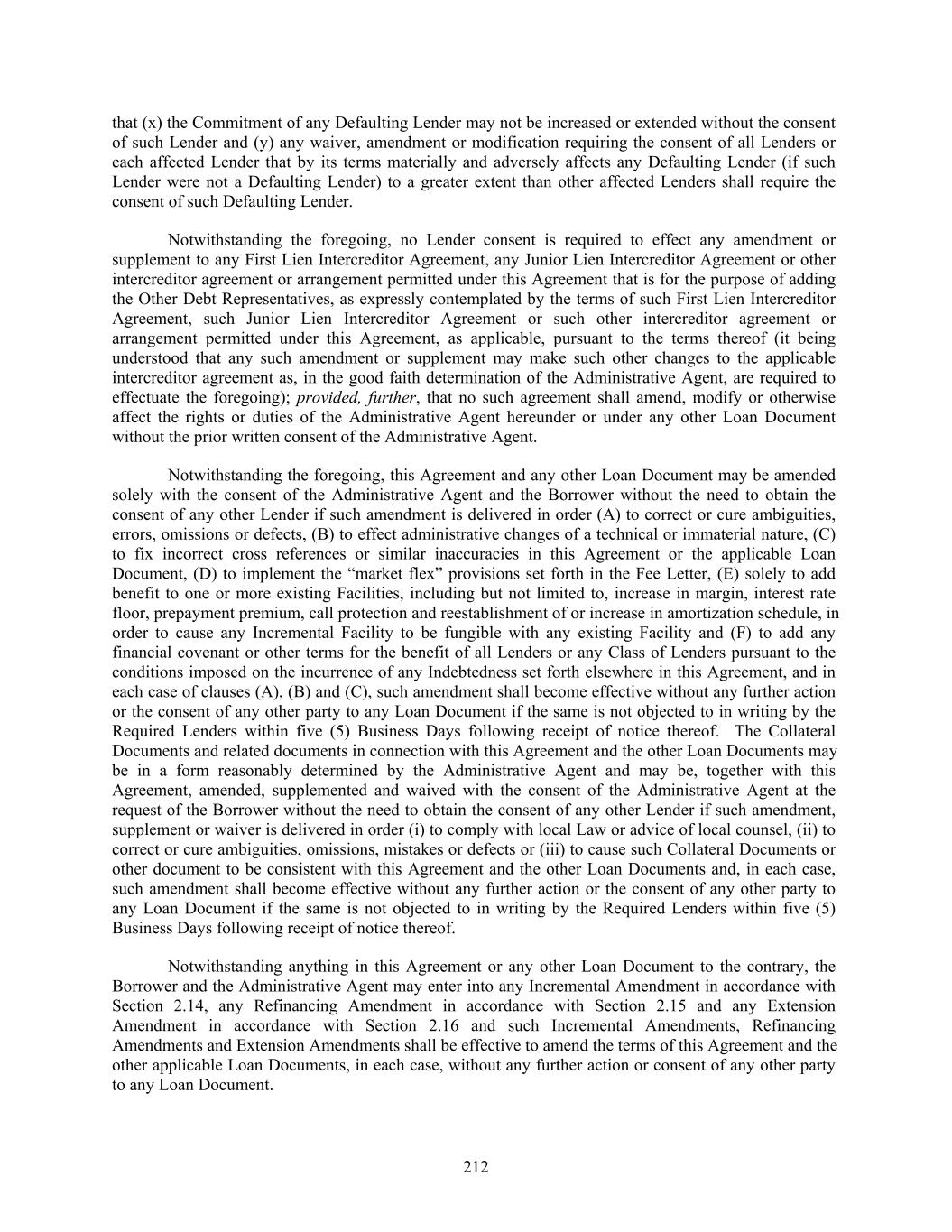 that (x) the Commitment of any Defaulting Lender may not be increased or extended without the consentof such Lender and (y) any waiver, amendment or modification requiring the consent of all Lenders oreach affected Lender that by its terms materially and adversely affects any Defaulting Lender (if suchLender were not a Defaulting Lender) to a greater extent than other affected Lenders shall require theconsent of such Defaulting Lender.Notwithstanding the foregoing, no Lender consent is required to effect any amendment orsupplement to any First Lien Intercreditor Agreement, any Junior Lien Intercreditor Agreement or otherintercreditor agreement or arrangement permitted under this Agreement that is for the purpose of addingthe Other Debt Representatives, as expressly contemplated by the terms of such First Lien IntercreditorAgreement, such Junior Lien Intercreditor Agreement or such other intercreditor agreement orarrangement permitted under this Agreement, as applicable, pursuant to the terms thereof (it beingunderstood that any such amendment or supplement may make such other changes to the applicableintercreditor agreement as, in the good faith determination of the Administrative Agent, are required toeffectuate the foregoing); provided, further, that no such agreement shall amend, modify or otherwiseaffect the rights or duties of the Administrative Agent hereunder or under any other Loan Documentwithout the prior written consent of the Administrative Agent.Notwithstanding the foregoing, this Agreement and any other Loan Document may be amendedsolely with the consent of the Administrative Agent and the Borrower without the need to obtain theconsent of any other Lender if such amendment is delivered in order (A) to correct or cure ambiguities,errors, omissions or defects, (B) to effect administrative changes of a technical or immaterial nature, (C)to fix incorrect cross references or similar inaccuracies in this Agreement or the applicable LoanDocument, (D) to implement the “market flex” provisions set forth in the Fee Letter, (E) solely to addbenefit to one or more existing Facilities, including but not limited to, increase in margin, interest ratefloor, prepayment premium, call protection and reestablishment of or increase in amortization schedule, inorder to cause any Incremental Facility to be fungible with any existing Facility and (F) to add anyfinancial covenant or other terms for the benefit of all Lenders or any Class of Lenders pursuant to theconditions imposed on the incurrence of any Indebtedness set forth elsewhere in this Agreement, and ineach case of clauses (A), (B) and (C), such amendment shall become effective without any further actionor the consent of any other party to any Loan Document if the same is not objected to in writing by theRequired Lenders within five (5) Business Days following receipt of notice thereof. The CollateralDocuments and related documents in connection with this Agreement and the other Loan Documents maybe in a form reasonably determined by the Administrative Agent and may be, together with thisAgreement, amended, supplemented and waived with the consent of the Administrative Agent at therequest of the Borrower without the need to obtain the consent of any other Lender if such amendment,supplement or waiver is delivered in order (i) to comply with local Law or advice of local counsel, (ii) tocorrect or cure ambiguities, omissions, mistakes or defects or (iii) to cause such Collateral Documents orother document to be consistent with this Agreement and the other Loan Documents and, in each case,such amendment shall become effective without any further action or the consent of any other party toany Loan Document if the same is not objected to in writing by the Required Lenders within five (5)Business Days following receipt of notice thereof.Notwithstanding anything in this Agreement or any other Loan Document to the contrary, theBorrower and the Administrative Agent may enter into any Incremental Amendment in accordance with Section 2.14, any Refinancing Amendment in accordance with Section 2.15 and any ExtensionAmendment in accordance with Section 2.16 and such Incremental Amendments, RefinancingAmendments and Extension Amendments shall be effective to amend the terms of this Agreement and theother applicable Loan Documents, in each case, without any further action or consent of any other partyto any Loan Document. 212
