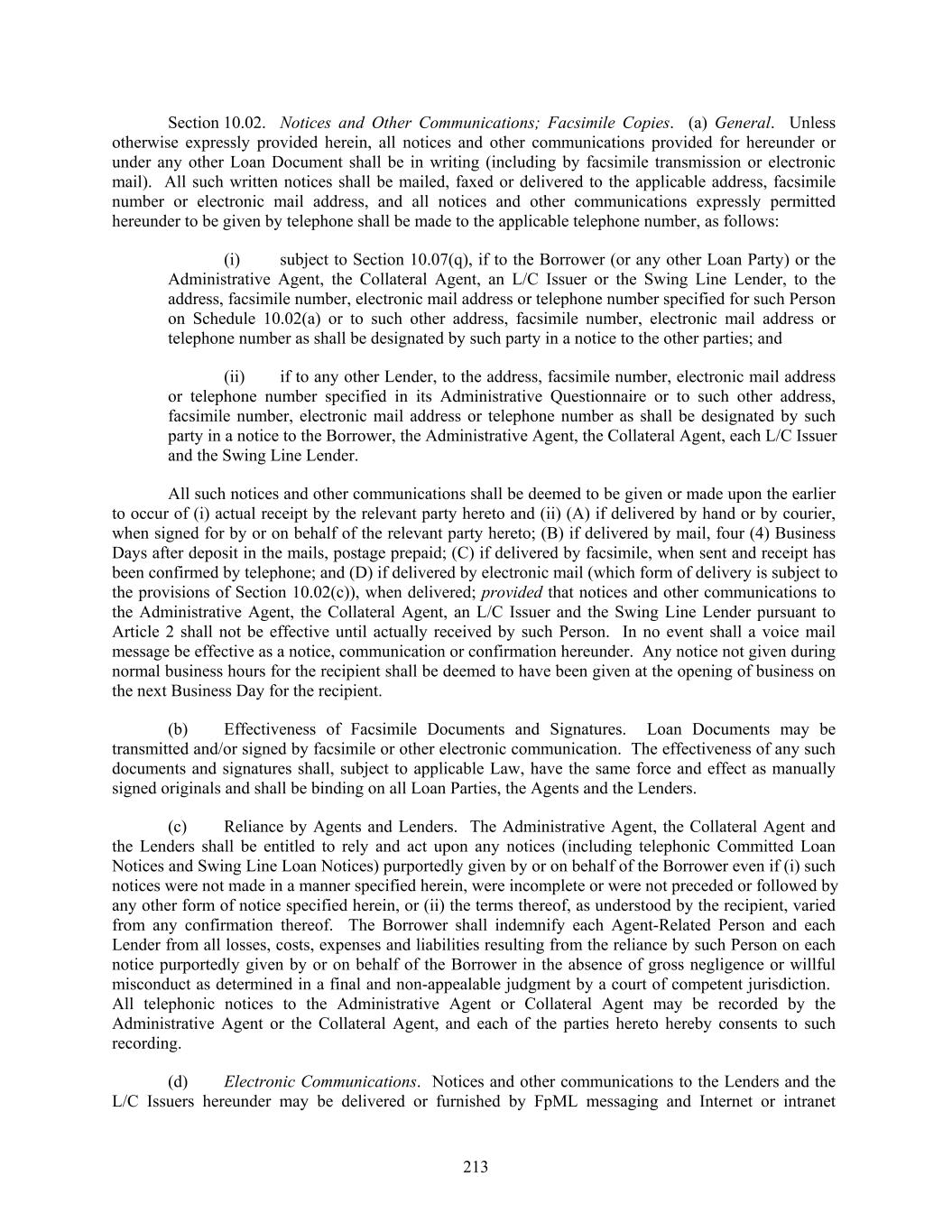Section 10.02. Notices and Other Communications; Facsimile Copies. (a) General. Unlessotherwise expressly provided herein, all notices and other communications provided for hereunder orunder any other Loan Document shall be in writing (including by facsimile transmission or electronicmail). All such written notices shall be mailed, faxed or delivered to the applicable address, facsimilenumber or electronic mail address, and all notices and other communications expressly permittedhereunder to be given by telephone shall be made to the applicable telephone number, as follows:(i) subject to Section 10.07(q), if to the Borrower (or any other Loan Party) or theAdministrative Agent, the Collateral Agent, an L/C Issuer or the Swing Line Lender, to theaddress, facsimile number, electronic mail address or telephone number specified for such Personon Schedule 10.02(a) or to such other address, facsimile number, electronic mail address ortelephone number as shall be designated by such party in a notice to the other parties; and(ii) if to any other Lender, to the address, facsimile number, electronic mail addressor telephone number specified in its Administrative Questionnaire or to such other address,facsimile number, electronic mail address or telephone number as shall be designated by suchparty in a notice to the Borrower, the Administrative Agent, the Collateral Agent, each L/C Issuerand the Swing Line Lender.All such notices and other communications shall be deemed to be given or made upon the earlierto occur of (i) actual receipt by the relevant party hereto and (ii) (A) if delivered by hand or by courier,when signed for by or on behalf of the relevant party hereto; (B) if delivered by mail, four (4) BusinessDays after deposit in the mails, postage prepaid; (C) if delivered by facsimile, when sent and receipt hasbeen confirmed by telephone; and (D) if delivered by electronic mail (which form of delivery is subject tothe provisions of Section 10.02(c)), when delivered; provided that notices and other communications tothe Administrative Agent, the Collateral Agent, an L/C Issuer and the Swing Line Lender pursuant toArticle 2 shall not be effective until actually received by such Person. In no event shall a voice mailmessage be effective as a notice, communication or confirmation hereunder. Any notice not given duringnormal business hours for the recipient shall be deemed to have been given at the opening of business onthe next Business Day for the recipient.(b) Effectiveness of Facsimile Documents and Signatures. Loan Documents may betransmitted and/or signed by facsimile or other electronic communication. The effectiveness of any suchdocuments and signatures shall, subject to applicable Law, have the same force and effect as manuallysigned originals and shall be binding on all Loan Parties, the Agents and the Lenders.(c) Reliance by Agents and Lenders. The Administrative Agent, the Collateral Agent andthe Lenders shall be entitled to rely and act upon any notices (including telephonic Committed LoanNotices and Swing Line Loan Notices) purportedly given by or on behalf of the Borrower even if (i) suchnotices were not made in a manner specified herein, were incomplete or were not preceded or followed byany other form of notice specified herein, or (ii) the terms thereof, as understood by the recipient, variedfrom any confirmation thereof. The Borrower shall indemnify each Agent-Related Person and eachLender from all losses, costs, expenses and liabilities resulting from the reliance by such Person on eachnotice purportedly given by or on behalf of the Borrower in the absence of gross negligence or willfulmisconduct as determined in a final and non-appealable judgment by a court of competent jurisdiction.All telephonic notices to the Administrative Agent or Collateral Agent may be recorded by theAdministrative Agent or the Collateral Agent, and each of the parties hereto hereby consents to suchrecording.(d) Electronic Communications. Notices and other communications to the Lenders and theL/C Issuers hereunder may be delivered or furnished by FpML messaging and Internet or intranet213