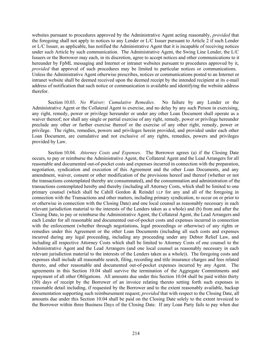 websites pursuant to procedures approved by the Administrative Agent acting reasonably, provided thatthe foregoing shall not apply to notices to any Lender or L/C Issuer pursuant to Article 2 if such Lenderor L/C Issuer, as applicable, has notified the Administrative Agent that it is incapable of receiving noticesunder such Article by such communication. The Administrative Agent, the Swing Line Lender, the L/CIssuers or the Borrower may each, in its discretion, agree to accept notices and other communications to ithereunder by FpML messaging and Internet or intranet websites pursuant to procedures approved by it,provided that approval of such procedures may be limited to particular notices or communications.Unless the Administrative Agent otherwise prescribes, notices or communications posted to an Internet orintranet website shall be deemed received upon the deemed receipt by the intended recipient at its e-mailaddress of notification that such notice or communication is available and identifying the website addresstherefor.Section 10.03. No Waiver; Cumulative Remedies. No failure by any Lender or theAdministrative Agent or the Collateral Agent to exercise, and no delay by any such Person in exercising,any right, remedy, power or privilege hereunder or under any other Loan Document shall operate as awaiver thereof; nor shall any single or partial exercise of any right, remedy, power or privilege hereunderpreclude any other or further exercise thereof or the exercise of any other right, remedy, power orprivilege. The rights, remedies, powers and privileges herein provided, and provided under each otherLoan Document, are cumulative and not exclusive of any rights, remedies, powers and privilegesprovided by Law.Section 10.04. Attorney Costs and Expenses. The Borrower agrees (a) if the Closing Dateoccurs, to pay or reimburse the Administrative Agent, the Collateral Agent and the Lead Arrangers for allreasonable and documented out-of-pocket costs and expenses incurred in connection with the preparation,negotiation, syndication and execution of this Agreement and the other Loan Documents, and anyamendment, waiver, consent or other modification of the provisions hereof and thereof (whether or notthe transactions contemplated thereby are consummated), and the consummation and administration of thetransactions contemplated hereby and thereby (including all Attorney Costs, which shall be limited to oneprimary counsel (which shall be Cahill Gordon & Reindel LLP for any and all of the foregoing inconnection with the Transactions and other matters, including primary syndication, to occur on or prior toor otherwise in connection with the Closing Date) and one local counsel as reasonably necessary in eachrelevant jurisdiction material to the interests of the Lenders taken as a whole) and (b) from and after theClosing Date, to pay or reimburse the Administrative Agent, the Collateral Agent, the Lead Arrangers andeach Lender for all reasonable and documented out-of-pocket costs and expenses incurred in connectionwith the enforcement (whether through negotiations, legal proceedings or otherwise) of any rights orremedies under this Agreement or the other Loan Documents (including all such costs and expensesincurred during any legal proceeding, including any proceeding under any Debtor Relief Law, andincluding all respective Attorney Costs which shall be limited to Attorney Costs of one counsel to theAdministrative Agent and the Lead Arrangers (and one local counsel as reasonably necessary in eachrelevant jurisdiction material to the interests of the Lenders taken as a whole)). The foregoing costs andexpenses shall include all reasonable search, filing, recording and title insurance charges and fees relatedthereto, and other reasonable and documented out-of-pocket expenses incurred by any Agent. Theagreements in this Section 10.04 shall survive the termination of the Aggregate Commitments andrepayment of all other Obligations. All amounts due under this Section 10.04 shall be paid within thirty(30) days of receipt by the Borrower of an invoice relating thereto setting forth such expenses inreasonable detail including, if requested by the Borrower and to the extent reasonably available, backupdocumentation supporting such reimbursement request; provided that with respect to the Closing Date, allamounts due under this Section 10.04 shall be paid on the Closing Date solely to the extent invoiced tothe Borrower within three Business Days of the Closing Date. If any Loan Party fails to pay when due214