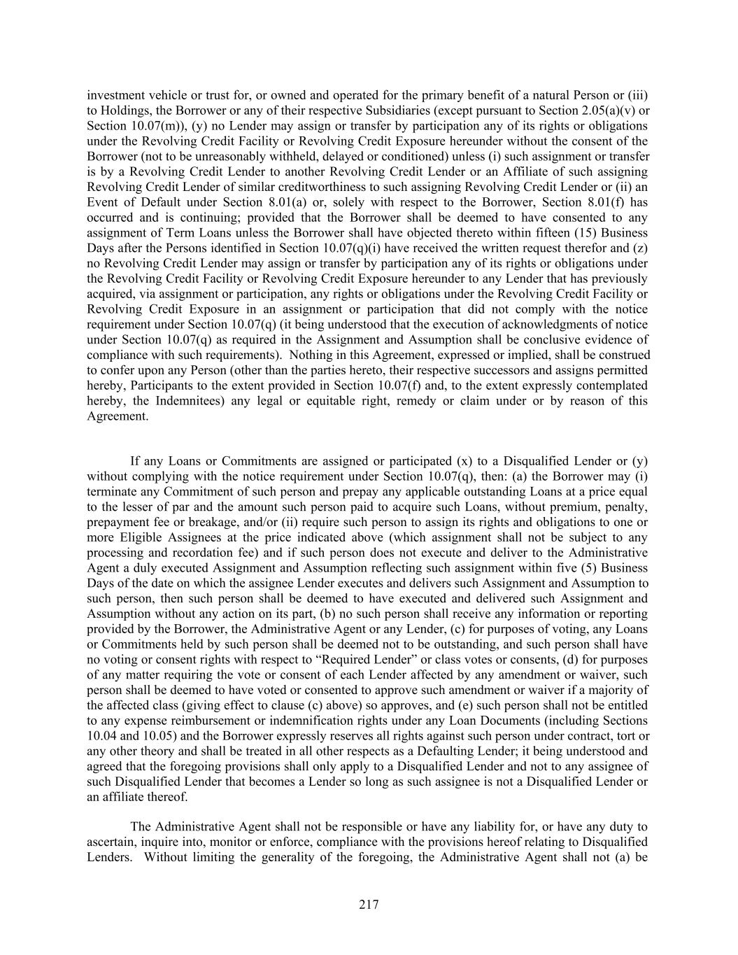 investment vehicle or trust for, or owned and operated for the primary benefit of a natural Person or (iii)to Holdings, the Borrower or any of their respective Subsidiaries (except pursuant to Section 2.05(a)(v) or Section 10.07(m)), (y) no Lender may assign or transfer by participation any of its rights or obligationsunder the Revolving Credit Facility or Revolving Credit Exposure hereunder without the consent of theBorrower (not to be unreasonably withheld, delayed or conditioned) unless (i) such assignment or transferis by a Revolving Credit Lender to another Revolving Credit Lender or an Affiliate of such assigningRevolving Credit Lender of similar creditworthiness to such assigning Revolving Credit Lender or (ii) anEvent of Default under Section 8.01(a) or, solely with respect to the Borrower, Section 8.01(f) hasoccurred and is continuing; provided that the Borrower shall be deemed to have consented to anyassignment of Term Loans unless the Borrower shall have objected thereto within fifteen (15) BusinessDays after the Persons identified in Section 10.07(q)(i) have received the written request therefor and (z)no Revolving Credit Lender may assign or transfer by participation any of its rights or obligations underthe Revolving Credit Facility or Revolving Credit Exposure hereunder to any Lender that has previouslyacquired, via assignment or participation, any rights or obligations under the Revolving Credit Facility orRevolving Credit Exposure in an assignment or participation that did not comply with the noticerequirement under Section 10.07(q) (it being understood that the execution of acknowledgments of noticeunder Section 10.07(q) as required in the Assignment and Assumption shall be conclusive evidence ofcompliance with such requirements). Nothing in this Agreement, expressed or implied, shall be construedto confer upon any Person (other than the parties hereto, their respective successors and assigns permittedhereby, Participants to the extent provided in Section 10.07(f) and, to the extent expressly contemplatedhereby, the Indemnitees) any legal or equitable right, remedy or claim under or by reason of thisAgreement.If any Loans or Commitments are assigned or participated (x) to a Disqualified Lender or (y)without complying with the notice requirement under Section 10.07(q), then: (a) the Borrower may (i)terminate any Commitment of such person and prepay any applicable outstanding Loans at a price equalto the lesser of par and the amount such person paid to acquire such Loans, without premium, penalty,prepayment fee or breakage, and/or (ii) require such person to assign its rights and obligations to one ormore Eligible Assignees at the price indicated above (which assignment shall not be subject to anyprocessing and recordation fee) and if such person does not execute and deliver to the AdministrativeAgent a duly executed Assignment and Assumption reflecting such assignment within five (5) BusinessDays of the date on which the assignee Lender executes and delivers such Assignment and Assumption tosuch person, then such person shall be deemed to have executed and delivered such Assignment andAssumption without any action on its part, (b) no such person shall receive any information or reportingprovided by the Borrower, the Administrative Agent or any Lender, (c) for purposes of voting, any Loansor Commitments held by such person shall be deemed not to be outstanding, and such person shall haveno voting or consent rights with respect to “Required Lender” or class votes or consents, (d) for purposesof any matter requiring the vote or consent of each Lender affected by any amendment or waiver, suchperson shall be deemed to have voted or consented to approve such amendment or waiver if a majority ofthe affected class (giving effect to clause (c) above) so approves, and (e) such person shall not be entitledto any expense reimbursement or indemnification rights under any Loan Documents (including Sections10.04 and 10.05) and the Borrower expressly reserves all rights against such person under contract, tort orany other theory and shall be treated in all other respects as a Defaulting Lender; it being understood andagreed that the foregoing provisions shall only apply to a Disqualified Lender and not to any assignee ofsuch Disqualified Lender that becomes a Lender so long as such assignee is not a Disqualified Lender oran affiliate thereof.The Administrative Agent shall not be responsible or have any liability for, or have any duty toascertain, inquire into, monitor or enforce, compliance with the provisions hereof relating to DisqualifiedLenders. Without limiting the generality of the foregoing, the Administrative Agent shall not (a) be217