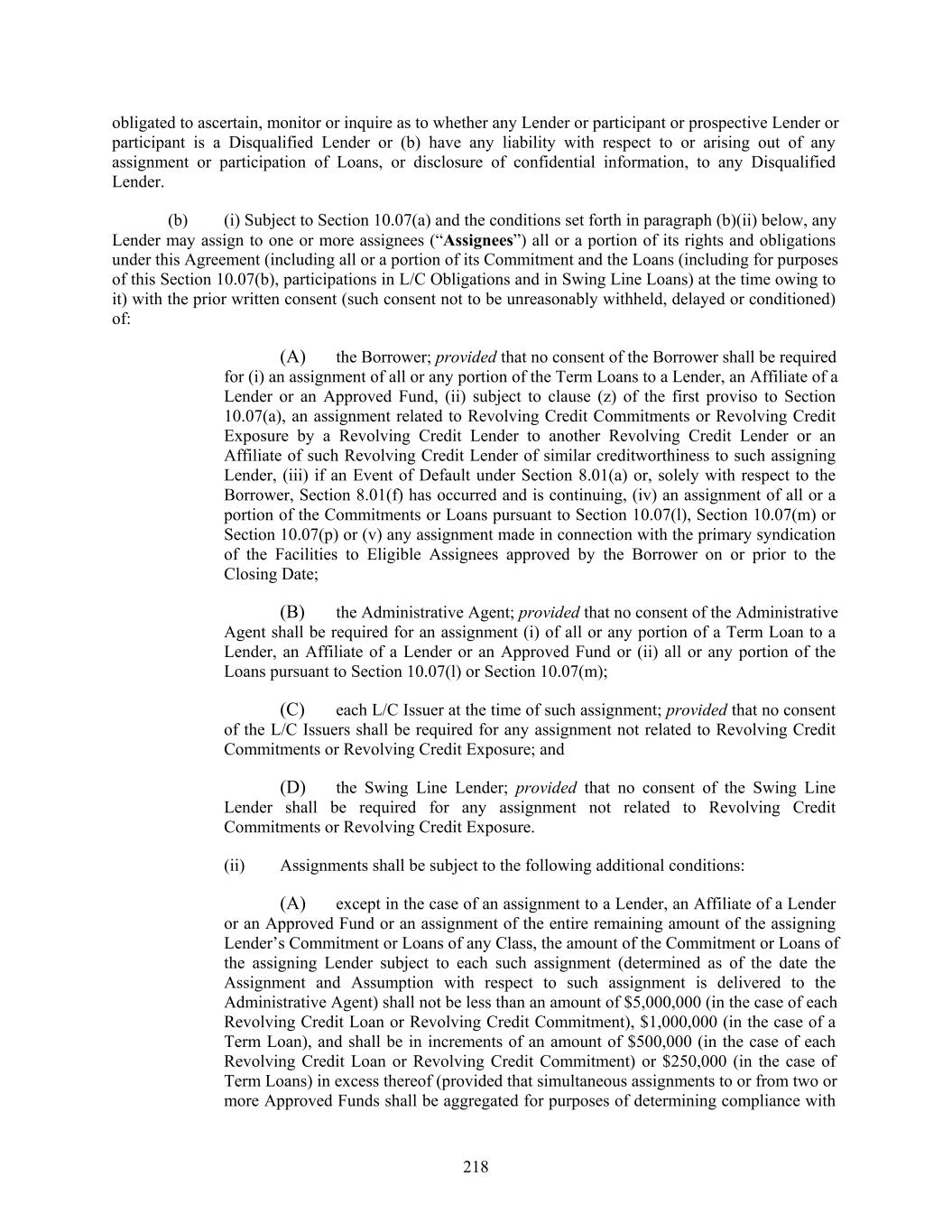 obligated to ascertain, monitor or inquire as to whether any Lender or participant or prospective Lender orparticipant is a Disqualified Lender or (b) have any liability with respect to or arising out of anyassignment or participation of Loans, or disclosure of confidential information, to any DisqualifiedLender. (b) (i) Subject to Section 10.07(a) and the conditions set forth in paragraph (b) (ii) below, anyLender may assign to one or more assignees (“Assignees”) all or a portion of its rights and obligationsunder this Agreement (including all or a portion of its Commitment and the Loans (including for purposesof this Section 10.07(b), participations in L/C Obligations and in Swing Line Loans) at the time owing toit) with the prior written consent (such consent not to be unreasonably withheld, delayed or conditioned)of: (A) the Borrower; provided that no consent of the Borrower shall be requiredfor (i) an assignment of all or any portion of the Term Loans to a Lender, an Affiliate of aLender or an Approved Fund, (ii) subject to clause (z) of the first proviso to Section10.07(a), an assignment related to Revolving Credit Commitments or Revolving CreditExposure by a Revolving Credit Lender to another Revolving Credit Lender or anAffiliate of such Revolving Credit Lender of similar creditworthiness to such assigningLender, (iii) if an Event of Default under Section 8.01(a) or, solely with respect to theBorrower, Section 8.01(f) has occurred and is continuing, (iv) an assignment of all or aportion of the Commitments or Loans pursuant to Section 10.07(l), Section 10.07(m) or Section 10.07(p) or (v) any assignment made in connection with the primary syndicationof the Facilities to Eligible Assignees approved by the Borrower on or prior to theClosing Date;(B) the Administrative Agent; provided that no consent of the AdministrativeAgent shall be required for an assignment (i) of all or any portion of a Term Loan to aLender, an Affiliate of a Lender or an Approved Fund or (ii) all or any portion of theLoans pursuant to Section 10.07(l) or Section 10.07(m);(C) each L/C Issuer at the time of such assignment; provided that no consentof the L/C Issuers shall be required for any assignment not related to Revolving CreditCommitments or Revolving Credit Exposure; and(D) the Swing Line Lender; provided that no consent of the Swing LineLender shall be required for any assignment not related to Revolving CreditCommitments or Revolving Credit Exposure.(ii) Assignments shall be subject to the following additional conditions:(A) except in the case of an assignment to a Lender, an Affiliate of a Lenderor an Approved Fund or an assignment of the entire remaining amount of the assigningLender’s Commitment or Loans of any Class, the amount of the Commitment or Loans ofthe assigning Lender subject to each such assignment (determined as of the date theAssignment and Assumption with respect to such assignment is delivered to theAdministrative Agent) shall not be less than an amount of $5,000,000 (in the case of eachRevolving Credit Loan or Revolving Credit Commitment), $1,000,000 (in the case of aTerm Loan), and shall be in increments of an amount of $500,000 (in the case of eachRevolving Credit Loan or Revolving Credit Commitment) or $250,000 (in the case ofTerm Loans) in excess thereof (provided that simultaneous assignments to or from two ormore Approved Funds shall be aggregated for purposes of determining compliance with218