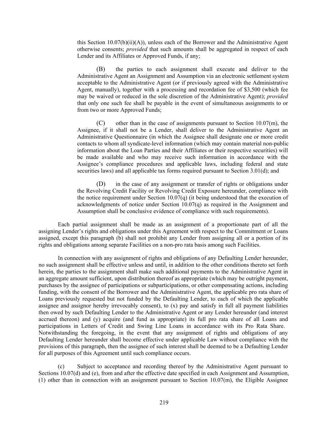 this Section 10.07(b)(ii)(A)), unless each of the Borrower and the Administrative Agentotherwise consents; provided that such amounts shall be aggregated in respect of eachLender and its Affiliates or Approved Funds, if any;(B) the parties to each assignment shall execute and deliver to theAdministrative Agent an Assignment and Assumption via an electronic settlement systemacceptable to the Administrative Agent (or if previously agreed with the AdministrativeAgent, manually), together with a processing and recordation fee of $3,500 (which feemay be waived or reduced in the sole discretion of the Administrative Agent); providedthat only one such fee shall be payable in the event of simultaneous assignments to orfrom two or more Approved Funds;(C) other than in the case of assignments pursuant to Section 10.07(m), theAssignee, if it shall not be a Lender, shall deliver to the Administrative Agent anAdministrative Questionnaire (in which the Assignee shall designate one or more creditcontacts to whom all syndicate-level information (which may contain material non-publicinformation about the Loan Parties and their Affiliates or their respective securities) willbe made available and who may receive such information in accordance with theAssignee’s compliance procedures and applicable laws, including federal and statesecurities laws) and all applicable tax forms required pursuant to Section 3.01(d); and(D) in the case of any assignment or transfer of rights or obligations underthe Revolving Credit Facility or Revolving Credit Exposure hereunder, compliance withthe notice requirement under Section 10.07(q) (it being understood that the execution ofacknowledgments of notice under Section 10.07(q) as required in the Assignment andAssumption shall be conclusive evidence of compliance with such requirements).Each partial assignment shall be made as an assignment of a proportionate part of all theassigning Lender’s rights and obligations under this Agreement with respect to the Commitment or Loansassigned, except this paragraph (b) shall not prohibit any Lender from assigning all or a portion of itsrights and obligations among separate Facilities on a non-pro rata basis among such Facilities.In connection with any assignment of rights and obligations of any Defaulting Lender hereunder,no such assignment shall be effective unless and until, in addition to the other conditions thereto set forthherein, the parties to the assignment shall make such additional payments to the Administrative Agent inan aggregate amount sufficient, upon distribution thereof as appropriate (which may be outright payment,purchases by the assignee of participations or subparticipations, or other compensating actions, includingfunding, with the consent of the Borrower and the Administrative Agent, the applicable pro rata share ofLoans previously requested but not funded by the Defaulting Lender, to each of which the applicableassignee and assignor hereby irrevocably consent), to (x) pay and satisfy in full all payment liabilitiesthen owed by such Defaulting Lender to the Administrative Agent or any Lender hereunder (and interestaccrued thereon) and (y) acquire (and fund as appropriate) its full pro rata share of all Loans andparticipations in Letters of Credit and Swing Line Loans in accordance with its Pro Rata Share.Notwithstanding the foregoing, in the event that any assignment of rights and obligations of anyDefaulting Lender hereunder shall become effective under applicable Law without compliance with theprovisions of this paragraph, then the assignee of such interest shall be deemed to be a Defaulting Lenderfor all purposes of this Agreement until such compliance occurs.(c) Subject to acceptance and recording thereof by the Administrative Agent pursuant toSections 10.07(d) and (e), from and after the effective date specified in each Assignment and Assumption,(1) other than in connection with an assignment pursuant to Section 10.07(m), the Eligible Assignee219