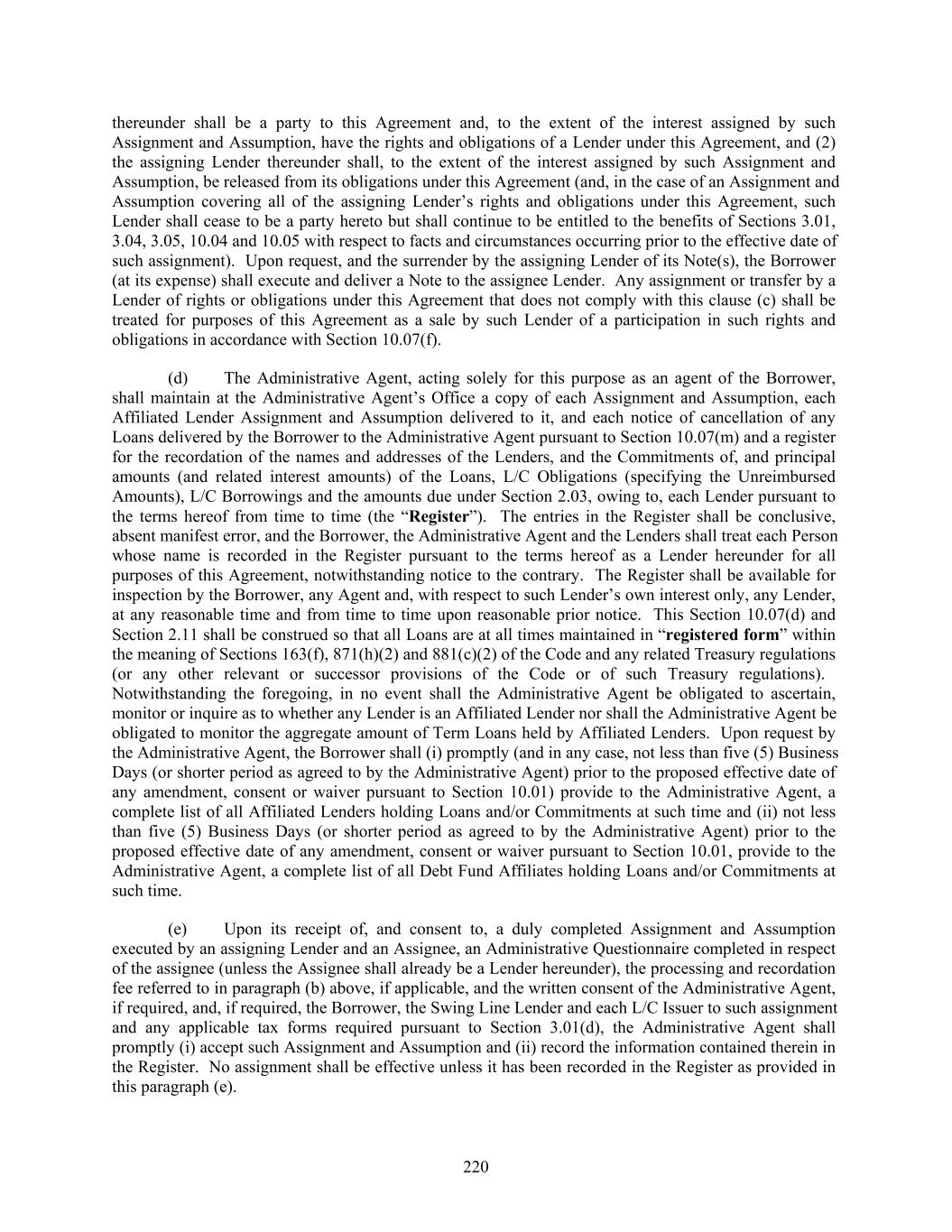 thereunder shall be a party to this Agreement and, to the extent of the interest assigned by suchAssignment and Assumption, have the rights and obligations of a Lender under this Agreement, and (2)the assigning Lender thereunder shall, to the extent of the interest assigned by such Assignment andAssumption, be released from its obligations under this Agreement (and, in the case of an Assignment andAssumption covering all of the assigning Lender’s rights and obligations under this Agreement, suchLender shall cease to be a party hereto but shall continue to be entitled to the benefits of Sections 3.01, 3.04, 3.05, 10.04 and 10.05 with respect to facts and circumstances occurring prior to the effective date ofsuch assignment). Upon request, and the surrender by the assigning Lender of its Note(s), the Borrower(at its expense) shall execute and deliver a Note to the assignee Lender. Any assignment or transfer by aLender of rights or obligations under this Agreement that does not comply with this clause (c) shall betreated for purposes of this Agreement as a sale by such Lender of a participation in such rights andobligations in accordance with Section 10.07(f).(d) The Administrative Agent, acting solely for this purpose as an agent of the Borrower,shall maintain at the Administrative Agent’s Office a copy of each Assignment and Assumption, eachAffiliated Lender Assignment and Assumption delivered to it, and each notice of cancellation of anyLoans delivered by the Borrower to the Administrative Agent pursuant to Section 10.07(m) and a registerfor the recordation of the names and addresses of the Lenders, and the Commitments of, and principalamounts (and related interest amounts) of the Loans, L/C Obligations (specifying the UnreimbursedAmounts), L/C Borrowings and the amounts due under Section 2.03, owing to, each Lender pursuant tothe terms hereof from time to time (the “Register”). The entries in the Register shall be conclusive,absent manifest error, and the Borrower, the Administrative Agent and the Lenders shall treat each Personwhose name is recorded in the Register pursuant to the terms hereof as a Lender hereunder for allpurposes of this Agreement, notwithstanding notice to the contrary. The Register shall be available forinspection by the Borrower, any Agent and, with respect to such Lender’s own interest only, any Lender,at any reasonable time and from time to time upon reasonable prior notice. This Section 10.07(d) and Section 2.11 shall be construed so that all Loans are at all times maintained in “registered form” withinthe meaning of Sections 163(f), 871(h)(2) and 881(c)(2) of the Code and any related Treasury regulations(or any other relevant or successor provisions of the Code or of such Treasury regulations).Notwithstanding the foregoing, in no event shall the Administrative Agent be obligated to ascertain,monitor or inquire as to whether any Lender is an Affiliated Lender nor shall the Administrative Agent beobligated to monitor the aggregate amount of Term Loans held by Affiliated Lenders. Upon request bythe Administrative Agent, the Borrower shall (i) promptly (and in any case, not less than five (5) BusinessDays (or shorter period as agreed to by the Administrative Agent) prior to the proposed effective date ofany amendment, consent or waiver pursuant to Section 10.01) provide to the Administrative Agent, acomplete list of all Affiliated Lenders holding Loans and/or Commitments at such time and (ii) not lessthan five (5) Business Days (or shorter period as agreed to by the Administrative Agent) prior to theproposed effective date of any amendment, consent or waiver pursuant to Section 10.01, provide to theAdministrative Agent, a complete list of all Debt Fund Affiliates holding Loans and/or Commitments atsuch time.(e) Upon its receipt of, and consent to, a duly completed Assignment and Assumptionexecuted by an assigning Lender and an Assignee, an Administrative Questionnaire completed in respectof the assignee (unless the Assignee shall already be a Lender hereunder), the processing and recordationfee referred to in paragraph (b) above, if applicable, and the written consent of the Administrative Agent,if required, and, if required, the Borrower, the Swing Line Lender and each L/C Issuer to such assignmentand any applicable tax forms required pursuant to Section 3.01(d), the Administrative Agent shallpromptly (i) accept such Assignment and Assumption and (ii) record the information contained therein inthe Register. No assignment shall be effective unless it has been recorded in the Register as provided inthis paragraph (e). 220