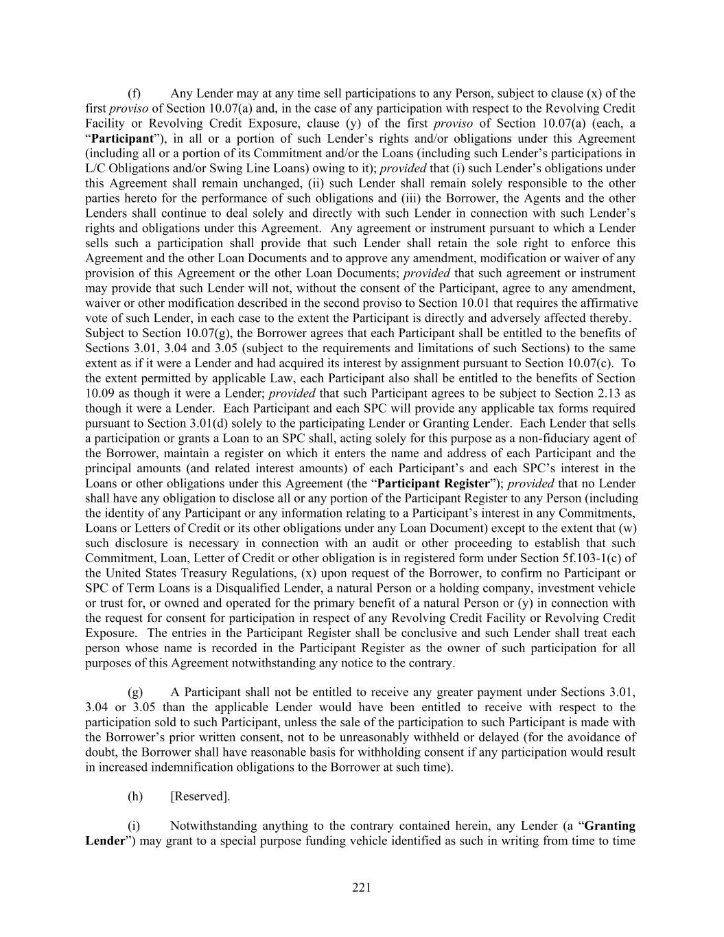 (f) Any Lender may at any time sell participations to any Person, subject to clause (x) of thefirst proviso of Section 10.07(a) and, in the case of any participation with respect to the Revolving CreditFacility or Revolving Credit Exposure, clause (y) of the first proviso of Section 10.07(a) (each, a“Participant”), in all or a portion of such Lender’s rights and/or obligations under this Agreement(including all or a portion of its Commitment and/or the Loans (including such Lender’s participations inL/C Obligations and/or Swing Line Loans) owing to it); provided that (i) such Lender’s obligations underthis Agreement shall remain unchanged, (ii) such Lender shall remain solely responsible to the otherparties hereto for the performance of such obligations and (iii) the Borrower, the Agents and the otherLenders shall continue to deal solely and directly with such Lender in connection with such Lender’srights and obligations under this Agreement. Any agreement or instrument pursuant to which a Lendersells such a participation shall provide that such Lender shall retain the sole right to enforce thisAgreement and the other Loan Documents and to approve any amendment, modification or waiver of anyprovision of this Agreement or the other Loan Documents; provided that such agreement or instrumentmay provide that such Lender will not, without the consent of the Participant, agree to any amendment,waiver or other modification described in the second proviso to Section 10.01 that requires the affirmativevote of such Lender, in each case to the extent the Participant is directly and adversely affected thereby.Subject to Section 10.07(g), the Borrower agrees that each Participant shall be entitled to the benefits ofSections 3.01, 3.04 and 3.05 (subject to the requirements and limitations of such Sections) to the sameextent as if it were a Lender and had acquired its interest by assignment pursuant to Section 10.07(c). Tothe extent permitted by applicable Law, each Participant also shall be entitled to the benefits of Section10.09 as though it were a Lender; provided that such Participant agrees to be subject to Section 2.13 asthough it were a Lender. Each Participant and each SPC will provide any applicable tax forms requiredpursuant to Section 3.01(d) solely to the participating Lender or Granting Lender. Each Lender that sellsa participation or grants a Loan to an SPC shall, acting solely for this purpose as a non-fiduciary agent ofthe Borrower, maintain a register on which it enters the name and address of each Participant and theprincipal amounts (and related interest amounts) of each Participant’s and each SPC’s interest in theLoans or other obligations under this Agreement (the “Participant Register”); provided that no Lendershall have any obligation to disclose all or any portion of the Participant Register to any Person (includingthe identity of any Participant or any information relating to a Participant’s interest in any Commitments,Loans or Letters of Credit or its other obligations under any Loan Document) except to the extent that (w)such disclosure is necessary in connection with an audit or other proceeding to establish that suchCommitment, Loan, Letter of Credit or other obligation is in registered form under Section 5f.103-1(c) ofthe United States Treasury Regulations, (x) upon request of the Borrower, to confirm no Participant orSPC of Term Loans is a Disqualified Lender, a natural Person or a holding company, investment vehicleor trust for, or owned and operated for the primary benefit of a natural Person or (y) in connection withthe request for consent for participation in respect of any Revolving Credit Facility or Revolving CreditExposure. The entries in the Participant Register shall be conclusive and such Lender shall treat eachperson whose name is recorded in the Participant Register as the owner of such participation for allpurposes of this Agreement notwithstanding any notice to the contrary.(g) A Participant shall not be entitled to receive any greater payment under Sections 3.01, 3.04 or 3.05 than the applicable Lender would have been entitled to receive with respect to theparticipation sold to such Participant, unless the sale of the participation to such Participant is made withthe Borrower’s prior written consent, not to be unreasonably withheld or delayed (for the avoidance ofdoubt, the Borrower shall have reasonable basis for withholding consent if any participation would resultin increased indemnification obligations to the Borrower at such time).(h) [Reserved].(i) Notwithstanding anything to the contrary contained herein, any Lender (a “GrantingLender”) may grant to a special purpose funding vehicle identified as such in writing from time to time221