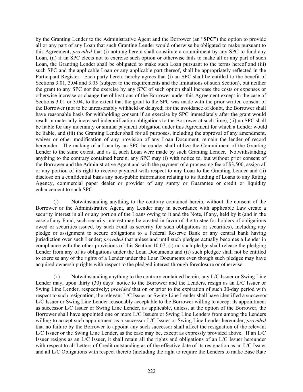 by the Granting Lender to the Administrative Agent and the Borrower (an “SPC”) the option to provideall or any part of any Loan that such Granting Lender would otherwise be obligated to make pursuant tothis Agreement; provided that (i) nothing herein shall constitute a commitment by any SPC to fund anyLoan, (ii) if an SPC elects not to exercise such option or otherwise fails to make all or any part of suchLoan, the Granting Lender shall be obligated to make such Loan pursuant to the terms hereof and (iii)such SPC and the applicable Loan or any applicable part thereof, shall be appropriately reflected in theParticipant Register. Each party hereto hereby agrees that (i) an SPC shall be entitled to the benefit ofSections 3.01, 3.04 and 3.05 (subject to the requirements and the limitations of such Section), but neitherthe grant to any SPC nor the exercise by any SPC of such option shall increase the costs or expenses orotherwise increase or change the obligations of the Borrower under this Agreement except in the case ofSections 3.01 or 3.04, to the extent that the grant to the SPC was made with the prior written consent ofthe Borrower (not to be unreasonably withheld or delayed; for the avoidance of doubt, the Borrower shallhave reasonable basis for withholding consent if an exercise by SPC immediately after the grant wouldresult in materially increased indemnification obligations to the Borrower at such time), (ii) no SPC shallbe liable for any indemnity or similar payment obligation under this Agreement for which a Lender wouldbe liable, and (iii) the Granting Lender shall for all purposes, including the approval of any amendment,waiver or other modification of any provision of any Loan Document, remain the lender of recordhereunder. The making of a Loan by an SPC hereunder shall utilize the Commitment of the GrantingLender to the same extent, and as if, such Loan were made by such Granting Lender. Notwithstandinganything to the contrary contained herein, any SPC may (i) with notice to, but without prior consent ofthe Borrower and the Administrative Agent and with the payment of a processing fee of $3,500, assign allor any portion of its right to receive payment with respect to any Loan to the Granting Lender and (ii)disclose on a confidential basis any non-public information relating to its funding of Loans to any RatingAgency, commercial paper dealer or provider of any surety or Guarantee or credit or liquidityenhancement to such SPC.(j) Notwithstanding anything to the contrary contained herein, without the consent of theBorrower or the Administrative Agent, any Lender may in accordance with applicable Law create asecurity interest in all or any portion of the Loans owing to it and the Note, if any, held by it (and in thecase of any Fund, such security interest may be created in favor of the trustee for holders of obligationsowed or securities issued, by such Fund as security for such obligations or securities), including anypledge or assignment to secure obligations to a Federal Reserve Bank or any central bank havingjurisdiction over such Lender; provided that unless and until such pledgee actually becomes a Lender incompliance with the other provisions of this Section 10.07, (i) no such pledge shall release the pledgingLender from any of its obligations under the Loan Documents and (ii) such pledgee shall not be entitledto exercise any of the rights of a Lender under the Loan Documents even though such pledgee may haveacquired ownership rights with respect to the pledged interest through foreclosure or otherwise.(k) Notwithstanding anything to the contrary contained herein, any L/C Issuer or Swing LineLender may, upon thirty (30) days’ notice to the Borrower and the Lenders, resign as an L/C Issuer orSwing Line Lender, respectively; provided that on or prior to the expiration of such 30-day period withrespect to such resignation, the relevant L/C Issuer or Swing Line Lender shall have identified a successorL/C Issuer or Swing Line Lender reasonably acceptable to the Borrower willing to accept its appointmentas successor L/C Issuer or Swing Line Lender, as applicable, unless, at the option of the Borrower, theBorrower shall have appointed one or more L/C Issuers or Swing Line Lenders from among the Lenderswilling to accept such appointment as a successor L/C Issuer or Swing Line Lender hereunder; providedthat no failure by the Borrower to appoint any such successor shall affect the resignation of the relevantL/C Issuer or the Swing Line Lender, as the case may be, except as expressly provided above. If an L/CIssuer resigns as an L/C Issuer, it shall retain all the rights and obligations of an L/C Issuer hereunderwith respect to all Letters of Credit outstanding as of the effective date of its resignation as an L/C Issuerand all L/C Obligations with respect thereto (including the right to require the Lenders to make Base Rate222