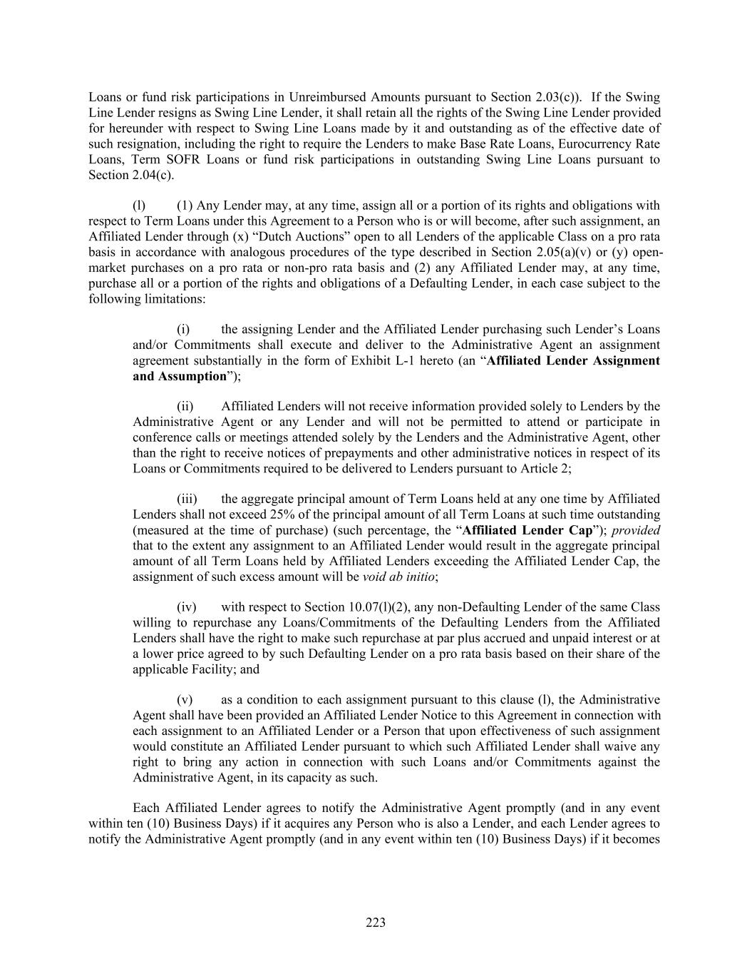 Loans or fund risk participations in Unreimbursed Amounts pursuant to Section 2.03(c)). If the SwingLine Lender resigns as Swing Line Lender, it shall retain all the rights of the Swing Line Lender providedfor hereunder with respect to Swing Line Loans made by it and outstanding as of the effective date ofsuch resignation, including the right to require the Lenders to make Base Rate Loans, Eurocurrency RateLoans, Term SOFR Loans or fund risk participations in outstanding Swing Line Loans pursuant to Section 2.04(c).(l) (1) Any Lender may, at any time, assign all or a portion of its rights and obligations withrespect to Term Loans under this Agreement to a Person who is or will become, after such assignment, anAffiliated Lender through (x) “Dutch Auctions” open to all Lenders of the applicable Class on a pro ratabasis in accordance with analogous procedures of the type described in Section 2.05(a)(v) or (y) open-market purchases on a pro rata or non-pro rata basis and (2) any Affiliated Lender may, at any time,purchase all or a portion of the rights and obligations of a Defaulting Lender, in each case subject to thefollowing limitations:(i) the assigning Lender and the Affiliated Lender purchasing such Lender’s Loansand/or Commitments shall execute and deliver to the Administrative Agent an assignmentagreement substantially in the form of Exhibit L-1 hereto (an “Affiliated Lender Assignmentand Assumption”);(ii) Affiliated Lenders will not receive information provided solely to Lenders by theAdministrative Agent or any Lender and will not be permitted to attend or participate inconference calls or meetings attended solely by the Lenders and the Administrative Agent, otherthan the right to receive notices of prepayments and other administrative notices in respect of itsLoans or Commitments required to be delivered to Lenders pursuant to Article 2;(iii) the aggregate principal amount of Term Loans held at any one time by AffiliatedLenders shall not exceed 25% of the principal amount of all Term Loans at such time outstanding(measured at the time of purchase) (such percentage, the “Affiliated Lender Cap”); providedthat to the extent any assignment to an Affiliated Lender would result in the aggregate principalamount of all Term Loans held by Affiliated Lenders exceeding the Affiliated Lender Cap, theassignment of such excess amount will be void ab initio;(iv) with respect to Section 10.07(l)(2), any non-Defaulting Lender of the same Classwilling to repurchase any Loans/Commitments of the Defaulting Lenders from the AffiliatedLenders shall have the right to make such repurchase at par plus accrued and unpaid interest or ata lower price agreed to by such Defaulting Lender on a pro rata basis based on their share of theapplicable Facility; and(v) as a condition to each assignment pursuant to this clause (l), the AdministrativeAgent shall have been provided an Affiliated Lender Notice to this Agreement in connection witheach assignment to an Affiliated Lender or a Person that upon effectiveness of such assignmentwould constitute an Affiliated Lender pursuant to which such Affiliated Lender shall waive anyright to bring any action in connection with such Loans and/or Commitments against theAdministrative Agent, in its capacity as such.Each Affiliated Lender agrees to notify the Administrative Agent promptly (and in any eventwithin ten (10) Business Days) if it acquires any Person who is also a Lender, and each Lender agrees tonotify the Administrative Agent promptly (and in any event within ten (10) Business Days) if it becomes223