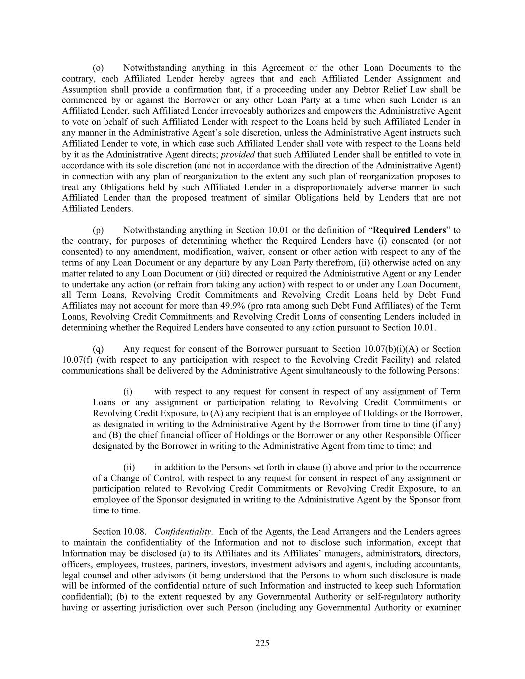 (o) Notwithstanding anything in this Agreement or the other Loan Documents to thecontrary, each Affiliated Lender hereby agrees that and each Affiliated Lender Assignment andAssumption shall provide a confirmation that, if a proceeding under any Debtor Relief Law shall becommenced by or against the Borrower or any other Loan Party at a time when such Lender is anAffiliated Lender, such Affiliated Lender irrevocably authorizes and empowers the Administrative Agentto vote on behalf of such Affiliated Lender with respect to the Loans held by such Affiliated Lender inany manner in the Administrative Agent’s sole discretion, unless the Administrative Agent instructs suchAffiliated Lender to vote, in which case such Affiliated Lender shall vote with respect to the Loans heldby it as the Administrative Agent directs; provided that such Affiliated Lender shall be entitled to vote inaccordance with its sole discretion (and not in accordance with the direction of the Administrative Agent)in connection with any plan of reorganization to the extent any such plan of reorganization proposes totreat any Obligations held by such Affiliated Lender in a disproportionately adverse manner to suchAffiliated Lender than the proposed treatment of similar Obligations held by Lenders that are notAffiliated Lenders.(p) Notwithstanding anything in Section 10.01 or the definition of “Required Lenders” tothe contrary, for purposes of determining whether the Required Lenders have (i) consented (or notconsented) to any amendment, modification, waiver, consent or other action with respect to any of theterms of any Loan Document or any departure by any Loan Party therefrom, (ii) otherwise acted on anymatter related to any Loan Document or (iii) directed or required the Administrative Agent or any Lenderto undertake any action (or refrain from taking any action) with respect to or under any Loan Document,all Term Loans, Revolving Credit Commitments and Revolving Credit Loans held by Debt FundAffiliates may not account for more than 49.9% (pro rata among such Debt Fund Affiliates) of the TermLoans, Revolving Credit Commitments and Revolving Credit Loans of consenting Lenders included indetermining whether the Required Lenders have consented to any action pursuant to Section 10.01.(q) Any request for consent of the Borrower pursuant to Section 10.07(b)(i)(A) or Section10.07(f) (with respect to any participation with respect to the Revolving Credit Facility) and relatedcommunications shall be delivered by the Administrative Agent simultaneously to the following Persons:(i) with respect to any request for consent in respect of any assignment of TermLoans or any assignment or participation relating to Revolving Credit Commitments orRevolving Credit Exposure, to (A) any recipient that is an employee of Holdings or the Borrower,as designated in writing to the Administrative Agent by the Borrower from time to time (if any)and (B) the chief financial officer of Holdings or the Borrower or any other Responsible Officerdesignated by the Borrower in writing to the Administrative Agent from time to time; and(ii) in addition to the Persons set forth in clause (i) above and prior to the occurrenceof a Change of Control, with respect to any request for consent in respect of any assignment orparticipation related to Revolving Credit Commitments or Revolving Credit Exposure, to anemployee of the Sponsor designated in writing to the Administrative Agent by the Sponsor fromtime to time.Section 10.08. Confidentiality. Each of the Agents, the Lead Arrangers and the Lenders agreesto maintain the confidentiality of the Information and not to disclose such information, except thatInformation may be disclosed (a) to its Affiliates and its Affiliates’ managers, administrators, directors,officers, employees, trustees, partners, investors, investment advisors and agents, including accountants,legal counsel and other advisors (it being understood that the Persons to whom such disclosure is madewill be informed of the confidential nature of such Information and instructed to keep such Informationconfidential); (b) to the extent requested by any Governmental Authority or self-regulatory authorityhaving or asserting jurisdiction over such Person (including any Governmental Authority or examiner225