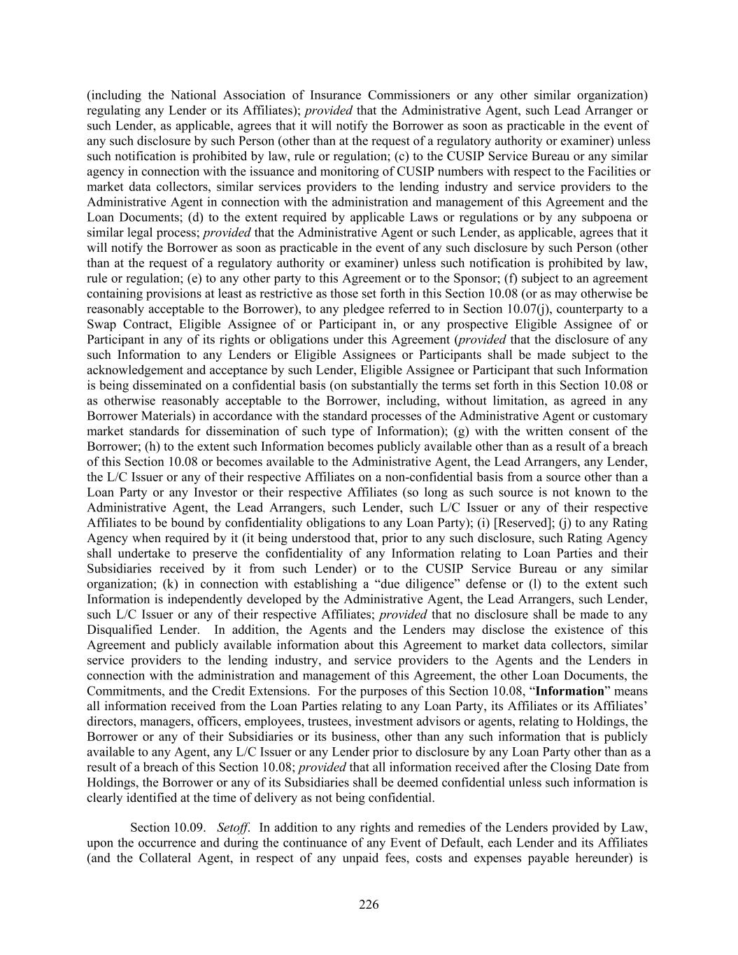 (including the National Association of Insurance Commissioners or any other similar organization)regulating any Lender or its Affiliates); provided that the Administrative Agent, such Lead Arranger orsuch Lender, as applicable, agrees that it will notify the Borrower as soon as practicable in the event ofany such disclosure by such Person (other than at the request of a regulatory authority or examiner) unlesssuch notification is prohibited by law, rule or regulation; (c) to the CUSIP Service Bureau or any similaragency in connection with the issuance and monitoring of CUSIP numbers with respect to the Facilities ormarket data collectors, similar services providers to the lending industry and service providers to theAdministrative Agent in connection with the administration and management of this Agreement and theLoan Documents; (d) to the extent required by applicable Laws or regulations or by any subpoena orsimilar legal process; provided that the Administrative Agent or such Lender, as applicable, agrees that itwill notify the Borrower as soon as practicable in the event of any such disclosure by such Person (otherthan at the request of a regulatory authority or examiner) unless such notification is prohibited by law,rule or regulation; (e) to any other party to this Agreement or to the Sponsor; (f) subject to an agreementcontaining provisions at least as restrictive as those set forth in this Section 10.08 (or as may otherwise bereasonably acceptable to the Borrower), to any pledgee referred to in Section 10.07(j), counterparty to aSwap Contract, Eligible Assignee of or Participant in, or any prospective Eligible Assignee of orParticipant in any of its rights or obligations under this Agreement (provided that the disclosure of anysuch Information to any Lenders or Eligible Assignees or Participants shall be made subject to theacknowledgement and acceptance by such Lender, Eligible Assignee or Participant that such Informationis being disseminated on a confidential basis (on substantially the terms set forth in this Section 10.08 oras otherwise reasonably acceptable to the Borrower, including, without limitation, as agreed in anyBorrower Materials) in accordance with the standard processes of the Administrative Agent or customarymarket standards for dissemination of such type of Information); (g) with the written consent of theBorrower; (h) to the extent such Information becomes publicly available other than as a result of a breachof this Section 10.08 or becomes available to the Administrative Agent, the Lead Arrangers, any Lender,the L/C Issuer or any of their respective Affiliates on a non-confidential basis from a source other than aLoan Party or any Investor or their respective Affiliates (so long as such source is not known to theAdministrative Agent, the Lead Arrangers, such Lender, such L/C Issuer or any of their respectiveAffiliates to be bound by confidentiality obligations to any Loan Party); (i) [Reserved]; (j) to any RatingAgency when required by it (it being understood that, prior to any such disclosure, such Rating Agencyshall undertake to preserve the confidentiality of any Information relating to Loan Parties and theirSubsidiaries received by it from such Lender) or to the CUSIP Service Bureau or any similarorganization; (k) in connection with establishing a “due diligence” defense or (l) to the extent suchInformation is independently developed by the Administrative Agent, the Lead Arrangers, such Lender,such L/C Issuer or any of their respective Affiliates; provided that no disclosure shall be made to anyDisqualified Lender. In addition, the Agents and the Lenders may disclose the existence of thisAgreement and publicly available information about this Agreement to market data collectors, similarservice providers to the lending industry, and service providers to the Agents and the Lenders inconnection with the administration and management of this Agreement, the other Loan Documents, theCommitments, and the Credit Extensions. For the purposes of this Section 10.08, “Information” meansall information received from the Loan Parties relating to any Loan Party, its Affiliates or its Affiliates’directors, managers, officers, employees, trustees, investment advisors or agents, relating to Holdings, theBorrower or any of their Subsidiaries or its business, other than any such information that is publiclyavailable to any Agent, any L/C Issuer or any Lender prior to disclosure by any Loan Party other than as aresult of a breach of this Section 10.08; provided that all information received after the Closing Date fromHoldings, the Borrower or any of its Subsidiaries shall be deemed confidential unless such information isclearly identified at the time of delivery as not being confidential.Section 10.09. Setoff. In addition to any rights and remedies of the Lenders provided by Law,upon the occurrence and during the continuance of any Event of Default, each Lender and its Affiliates(and the Collateral Agent, in respect of any unpaid fees, costs and expenses payable hereunder) is226