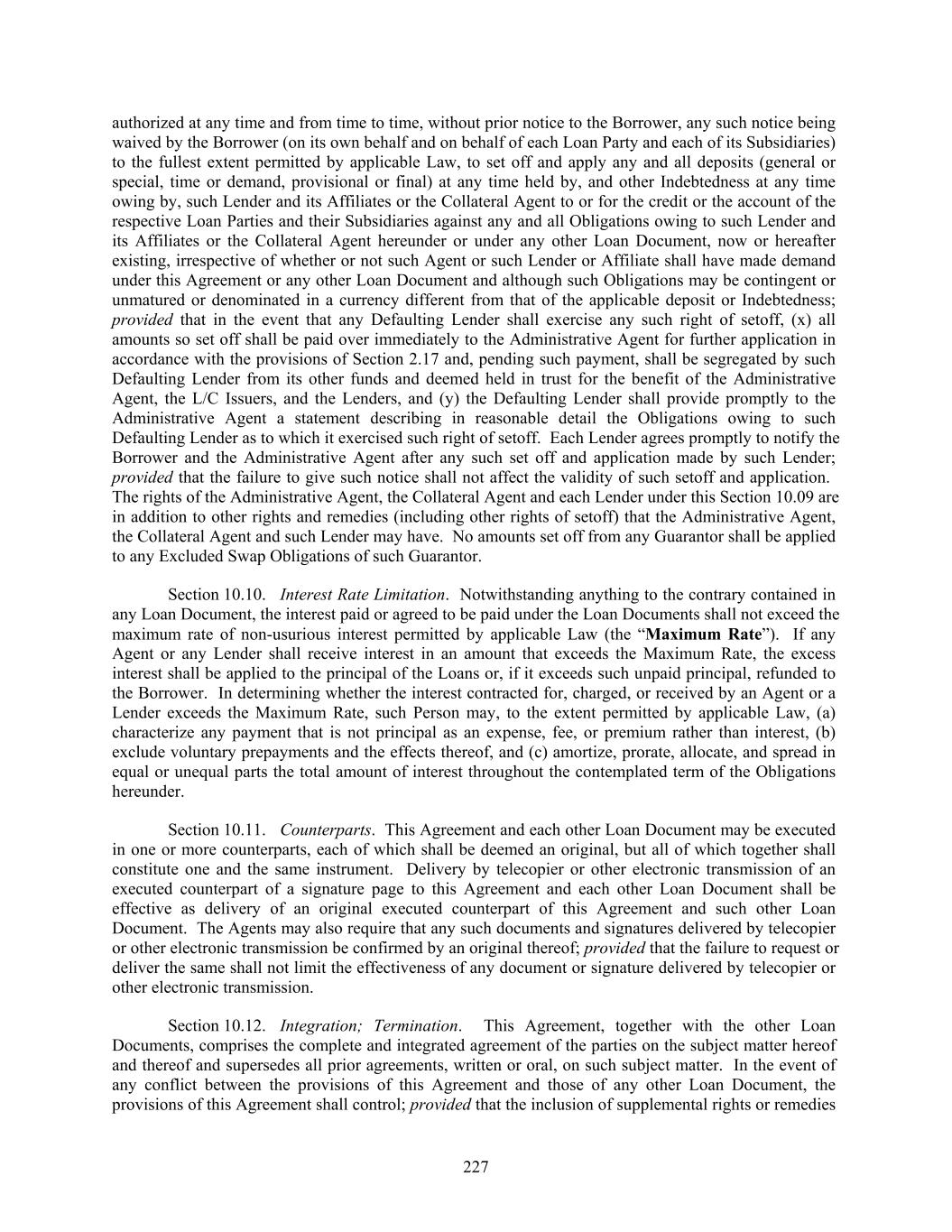 authorized at any time and from time to time, without prior notice to the Borrower, any such notice beingwaived by the Borrower (on its own behalf and on behalf of each Loan Party and each of its Subsidiaries)to the fullest extent permitted by applicable Law, to set off and apply any and all deposits (general orspecial, time or demand, provisional or final) at any time held by, and other Indebtedness at any timeowing by, such Lender and its Affiliates or the Collateral Agent to or for the credit or the account of therespective Loan Parties and their Subsidiaries against any and all Obligations owing to such Lender andits Affiliates or the Collateral Agent hereunder or under any other Loan Document, now or hereafterexisting, irrespective of whether or not such Agent or such Lender or Affiliate shall have made demandunder this Agreement or any other Loan Document and although such Obligations may be contingent orunmatured or denominated in a currency different from that of the applicable deposit or Indebtedness;provided that in the event that any Defaulting Lender shall exercise any such right of setoff, (x) allamounts so set off shall be paid over immediately to the Administrative Agent for further application inaccordance with the provisions of Section 2.17 and, pending such payment, shall be segregated by suchDefaulting Lender from its other funds and deemed held in trust for the benefit of the AdministrativeAgent, the L/C Issuers, and the Lenders, and (y) the Defaulting Lender shall provide promptly to theAdministrative Agent a statement describing in reasonable detail the Obligations owing to suchDefaulting Lender as to which it exercised such right of setoff. Each Lender agrees promptly to notify theBorrower and the Administrative Agent after any such set off and application made by such Lender;provided that the failure to give such notice shall not affect the validity of such setoff and application.The rights of the Administrative Agent, the Collateral Agent and each Lender under this Section 10.09 arein addition to other rights and remedies (including other rights of setoff) that the Administrative Agent,the Collateral Agent and such Lender may have. No amounts set off from any Guarantor shall be appliedto any Excluded Swap Obligations of such Guarantor.Section 10.10. Interest Rate Limitation. Notwithstanding anything to the contrary contained inany Loan Document, the interest paid or agreed to be paid under the Loan Documents shall not exceed themaximum rate of non-usurious interest permitted by applicable Law (the “Maximum Rate”). If anyAgent or any Lender shall receive interest in an amount that exceeds the Maximum Rate, the excessinterest shall be applied to the principal of the Loans or, if it exceeds such unpaid principal, refunded tothe Borrower. In determining whether the interest contracted for, charged, or received by an Agent or aLender exceeds the Maximum Rate, such Person may, to the extent permitted by applicable Law, (a)characterize any payment that is not principal as an expense, fee, or premium rather than interest, (b)exclude voluntary prepayments and the effects thereof, and (c) amortize, prorate, allocate, and spread inequal or unequal parts the total amount of interest throughout the contemplated term of the Obligationshereunder.Section 10.11. Counterparts. This Agreement and each other Loan Document may be executedin one or more counterparts, each of which shall be deemed an original, but all of which together shallconstitute one and the same instrument. Delivery by telecopier or other electronic transmission of anexecuted counterpart of a signature page to this Agreement and each other Loan Document shall beeffective as delivery of an original executed counterpart of this Agreement and such other LoanDocument. The Agents may also require that any such documents and signatures delivered by telecopieror other electronic transmission be confirmed by an original thereof; provided that the failure to request ordeliver the same shall not limit the effectiveness of any document or signature delivered by telecopier orother electronic transmission.Section 10.12. Integration; Termination. This Agreement, together with the other LoanDocuments, comprises the complete and integrated agreement of the parties on the subject matter hereofand thereof and supersedes all prior agreements, written or oral, on such subject matter. In the event ofany conflict between the provisions of this Agreement and those of any other Loan Document, theprovisions of this Agreement shall control; provided that the inclusion of supplemental rights or remedies227