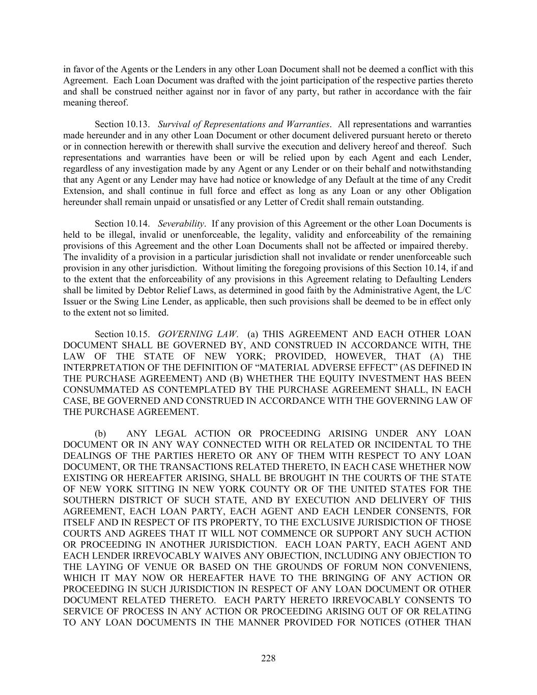 in favor of the Agents or the Lenders in any other Loan Document shall not be deemed a conflict with thisAgreement. Each Loan Document was drafted with the joint participation of the respective parties theretoand shall be construed neither against nor in favor of any party, but rather in accordance with the fairmeaning thereof.Section 10.13. Survival of Representations and Warranties. All representations and warrantiesmade hereunder and in any other Loan Document or other document delivered pursuant hereto or theretoor in connection herewith or therewith shall survive the execution and delivery hereof and thereof. Suchrepresentations and warranties have been or will be relied upon by each Agent and each Lender,regardless of any investigation made by any Agent or any Lender or on their behalf and notwithstandingthat any Agent or any Lender may have had notice or knowledge of any Default at the time of any CreditExtension, and shall continue in full force and effect as long as any Loan or any other Obligationhereunder shall remain unpaid or unsatisfied or any Letter of Credit shall remain outstanding.Section 10.14. Severability. If any provision of this Agreement or the other Loan Documents isheld to be illegal, invalid or unenforceable, the legality, validity and enforceability of the remainingprovisions of this Agreement and the other Loan Documents shall not be affected or impaired thereby.The invalidity of a provision in a particular jurisdiction shall not invalidate or render unenforceable suchprovision in any other jurisdiction. Without limiting the foregoing provisions of this Section 10.14, if andto the extent that the enforceability of any provisions in this Agreement relating to Defaulting Lendersshall be limited by Debtor Relief Laws, as determined in good faith by the Administrative Agent, the L/CIssuer or the Swing Line Lender, as applicable, then such provisions shall be deemed to be in effect onlyto the extent not so limited.Section 10.15. GOVERNING LAW. (a) THIS AGREEMENT AND EACH OTHER LOANDOCUMENT SHALL BE GOVERNED BY, AND CONSTRUED IN ACCORDANCE WITH, THELAW OF THE STATE OF NEW YORK; PROVIDED, HOWEVER, THAT (A) THEINTERPRETATION OF THE DEFINITION OF “MATERIAL ADVERSE EFFECT” (AS DEFINED INTHE PURCHASE AGREEMENT) AND (B) WHETHER THE EQUITY INVESTMENT HAS BEENCONSUMMATED AS CONTEMPLATED BY THE PURCHASE AGREEMENT SHALL, IN EACHCASE, BE GOVERNED AND CONSTRUED IN ACCORDANCE WITH THE GOVERNING LAW OFTHE PURCHASE AGREEMENT.(b) ANY LEGAL ACTION OR PROCEEDING ARISING UNDER ANY LOANDOCUMENT OR IN ANY WAY CONNECTED WITH OR RELATED OR INCIDENTAL TO THEDEALINGS OF THE PARTIES HERETO OR ANY OF THEM WITH RESPECT TO ANY LOANDOCUMENT, OR THE TRANSACTIONS RELATED THERETO, IN EACH CASE WHETHER NOWEXISTING OR HEREAFTER ARISING, SHALL BE BROUGHT IN THE COURTS OF THE STATEOF NEW YORK SITTING IN NEW YORK COUNTY OR OF THE UNITED STATES FOR THESOUTHERN DISTRICT OF SUCH STATE, AND BY EXECUTION AND DELIVERY OF THISAGREEMENT, EACH LOAN PARTY, EACH AGENT AND EACH LENDER CONSENTS, FORITSELF AND IN RESPECT OF ITS PROPERTY, TO THE EXCLUSIVE JURISDICTION OF THOSECOURTS AND AGREES THAT IT WILL NOT COMMENCE OR SUPPORT ANY SUCH ACTIONOR PROCEEDING IN ANOTHER JURISDICTION. EACH LOAN PARTY, EACH AGENT ANDEACH LENDER IRREVOCABLY WAIVES ANY OBJECTION, INCLUDING ANY OBJECTION TOTHE LAYING OF VENUE OR BASED ON THE GROUNDS OF FORUM NON CONVENIENS,WHICH IT MAY NOW OR HEREAFTER HAVE TO THE BRINGING OF ANY ACTION ORPROCEEDING IN SUCH JURISDICTION IN RESPECT OF ANY LOAN DOCUMENT OR OTHERDOCUMENT RELATED THERETO. EACH PARTY HERETO IRREVOCABLY CONSENTS TOSERVICE OF PROCESS IN ANY ACTION OR PROCEEDING ARISING OUT OF OR RELATINGTO ANY LOAN DOCUMENTS IN THE MANNER PROVIDED FOR NOTICES (OTHER THAN228