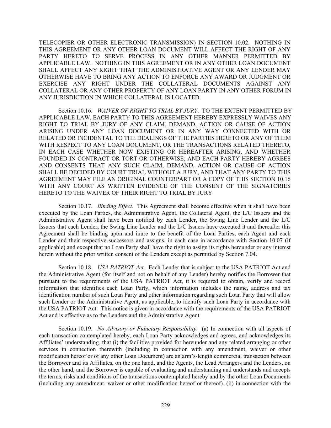 TELECOPIER OR OTHER ELECTRONIC TRANSMISSION) IN SECTION 10.02. NOTHING INTHIS AGREEMENT OR ANY OTHER LOAN DOCUMENT WILL AFFECT THE RIGHT OF ANYPARTY HERETO TO SERVE PROCESS IN ANY OTHER MANNER PERMITTED BYAPPLICABLE LAW. NOTHING IN THIS AGREEMENT OR IN ANY OTHER LOAN DOCUMENTSHALL AFFECT ANY RIGHT THAT THE ADMINISTRATIVE AGENT OR ANY LENDER MAYOTHERWISE HAVE TO BRING ANY ACTION TO ENFORCE ANY AWARD OR JUDGMENT OREXERCISE ANY RIGHT UNDER THE COLLATERAL DOCUMENTS AGAINST ANYCOLLATERAL OR ANY OTHER PROPERTY OF ANY LOAN PARTY IN ANY OTHER FORUM INANY JURISDICTION IN WHICH COLLATERAL IS LOCATED.Section 10.16. WAIVER OF RIGHT TO TRIAL BY JURY. TO THE EXTENT PERMITTED BYAPPLICABLE LAW, EACH PARTY TO THIS AGREEMENT HEREBY EXPRESSLY WAIVES ANYRIGHT TO TRIAL BY JURY OF ANY CLAIM, DEMAND, ACTION OR CAUSE OF ACTIONARISING UNDER ANY LOAN DOCUMENT OR IN ANY WAY CONNECTED WITH ORRELATED OR INCIDENTAL TO THE DEALINGS OF THE PARTIES HERETO OR ANY OF THEMWITH RESPECT TO ANY LOAN DOCUMENT, OR THE TRANSACTIONS RELATED THERETO,IN EACH CASE WHETHER NOW EXISTING OR HEREAFTER ARISING, AND WHETHERFOUNDED IN CONTRACT OR TORT OR OTHERWISE; AND EACH PARTY HEREBY AGREESAND CONSENTS THAT ANY SUCH CLAIM, DEMAND, ACTION OR CAUSE OF ACTIONSHALL BE DECIDED BY COURT TRIAL WITHOUT A JURY, AND THAT ANY PARTY TO THISAGREEMENT MAY FILE AN ORIGINAL COUNTERPART OR A COPY OF THIS SECTION 10.16WITH ANY COURT AS WRITTEN EVIDENCE OF THE CONSENT OF THE SIGNATORIESHERETO TO THE WAIVER OF THEIR RIGHT TO TRIAL BY JURY.Section 10.17. Binding Effect. This Agreement shall become effective when it shall have beenexecuted by the Loan Parties, the Administrative Agent, the Collateral Agent, the L/C Issuers and theAdministrative Agent shall have been notified by each Lender, the Swing Line Lender and the L/CIssuers that each Lender, the Swing Line Lender and the L/C Issuers have executed it and thereafter thisAgreement shall be binding upon and inure to the benefit of the Loan Parties, each Agent and eachLender and their respective successors and assigns, in each case in accordance with Section 10.07 (ifapplicable) and except that no Loan Party shall have the right to assign its rights hereunder or any interestherein without the prior written consent of the Lenders except as permitted by Section 7.04.Section 10.18. USA PATRIOT Act. Each Lender that is subject to the USA PATRIOT Act andthe Administrative Agent (for itself and not on behalf of any Lender) hereby notifies the Borrower thatpursuant to the requirements of the USA PATRIOT Act, it is required to obtain, verify and recordinformation that identifies each Loan Party, which information includes the name, address and taxidentification number of such Loan Party and other information regarding such Loan Party that will allowsuch Lender or the Administrative Agent, as applicable, to identify such Loan Party in accordance withthe USA PATRIOT Act. This notice is given in accordance with the requirements of the USA PATRIOTAct and is effective as to the Lenders and the Administrative Agent.Section 10.19. No Advisory or Fiduciary Responsibility. (a) In connection with all aspects ofeach transaction contemplated hereby, each Loan Party acknowledges and agrees, and acknowledges itsAffiliates’ understanding, that (i) the facilities provided for hereunder and any related arranging or otherservices in connection therewith (including in connection with any amendment, waiver or othermodification hereof or of any other Loan Document) are an arm’s-length commercial transaction betweenthe Borrower and its Affiliates, on the one hand, and the Agents, the Lead Arrangers and the Lenders, onthe other hand, and the Borrower is capable of evaluating and understanding and understands and acceptsthe terms, risks and conditions of the transactions contemplated hereby and by the other Loan Documents(including any amendment, waiver or other modification hereof or thereof), (ii) in connection with the229