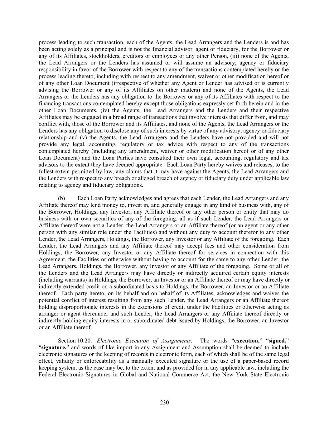 process leading to such transaction, each of the Agents, the Lead Arrangers and the Lenders is and hasbeen acting solely as a principal and is not the financial advisor, agent or fiduciary, for the Borrower orany of its Affiliates, stockholders, creditors or employees or any other Person, (iii) none of the Agents,the Lead Arrangers or the Lenders has assumed or will assume an advisory, agency or fiduciaryresponsibility in favor of the Borrower with respect to any of the transactions contemplated hereby or theprocess leading thereto, including with respect to any amendment, waiver or other modification hereof orof any other Loan Document (irrespective of whether any Agent or Lender has advised or is currentlyadvising the Borrower or any of its Affiliates on other matters) and none of the Agents, the LeadArrangers or the Lenders has any obligation to the Borrower or any of its Affiliates with respect to thefinancing transactions contemplated hereby except those obligations expressly set forth herein and in theother Loan Documents, (iv) the Agents, the Lead Arrangers and the Lenders and their respectiveAffiliates may be engaged in a broad range of transactions that involve interests that differ from, and mayconflict with, those of the Borrower and its Affiliates, and none of the Agents, the Lead Arrangers or theLenders has any obligation to disclose any of such interests by virtue of any advisory, agency or fiduciaryrelationship and (v) the Agents, the Lead Arrangers and the Lenders have not provided and will notprovide any legal, accounting, regulatory or tax advice with respect to any of the transactionscontemplated hereby (including any amendment, waiver or other modification hereof or of any otherLoan Document) and the Loan Parties have consulted their own legal, accounting, regulatory and taxadvisors to the extent they have deemed appropriate. Each Loan Party hereby waives and releases, to thefullest extent permitted by law, any claims that it may have against the Agents, the Lead Arrangers andthe Lenders with respect to any breach or alleged breach of agency or fiduciary duty under applicable lawrelating to agency and fiduciary obligations.(b) Each Loan Party acknowledges and agrees that each Lender, the Lead Arrangers and anyAffiliate thereof may lend money to, invest in, and generally engage in any kind of business with, any ofthe Borrower, Holdings, any Investor, any Affiliate thereof or any other person or entity that may dobusiness with or own securities of any of the foregoing, all as if such Lender, the Lead Arrangers orAffiliate thereof were not a Lender, the Lead Arrangers or an Affiliate thereof (or an agent or any otherperson with any similar role under the Facilities) and without any duty to account therefor to any otherLender, the Lead Arrangers, Holdings, the Borrower, any Investor or any Affiliate of the foregoing. EachLender, the Lead Arrangers and any Affiliate thereof may accept fees and other consideration fromHoldings, the Borrower, any Investor or any Affiliate thereof for services in connection with thisAgreement, the Facilities or otherwise without having to account for the same to any other Lender, theLead Arrangers, Holdings, the Borrower, any Investor or any Affiliate of the foregoing. Some or all ofthe Lenders and the Lead Arrangers may have directly or indirectly acquired certain equity interests(including warrants) in Holdings, the Borrower, an Investor or an Affiliate thereof or may have directly orindirectly extended credit on a subordinated basis to Holdings, the Borrower, an Investor or an Affiliatethereof. Each party hereto, on its behalf and on behalf of its Affiliates, acknowledges and waives thepotential conflict of interest resulting from any such Lender, the Lead Arrangers or an Affiliate thereofholding disproportionate interests in the extensions of credit under the Facilities or otherwise acting asarranger or agent thereunder and such Lender, the Lead Arrangers or any Affiliate thereof directly orindirectly holding equity interests in or subordinated debt issued by Holdings, the Borrower, an Investoror an Affiliate thereof.Section 10.20. Electronic Execution of Assignments. The words “execution,” “signed,”“signature,” and words of like import in any Assignment and Assumption shall be deemed to includeelectronic signatures or the keeping of records in electronic form, each of which shall be of the same legaleffect, validity or enforceability as a manually executed signature or the use of a paper-based recordkeeping system, as the case may be, to the extent and as provided for in any applicable law, including theFederal Electronic Signatures in Global and National Commerce Act, the New York State Electronic230