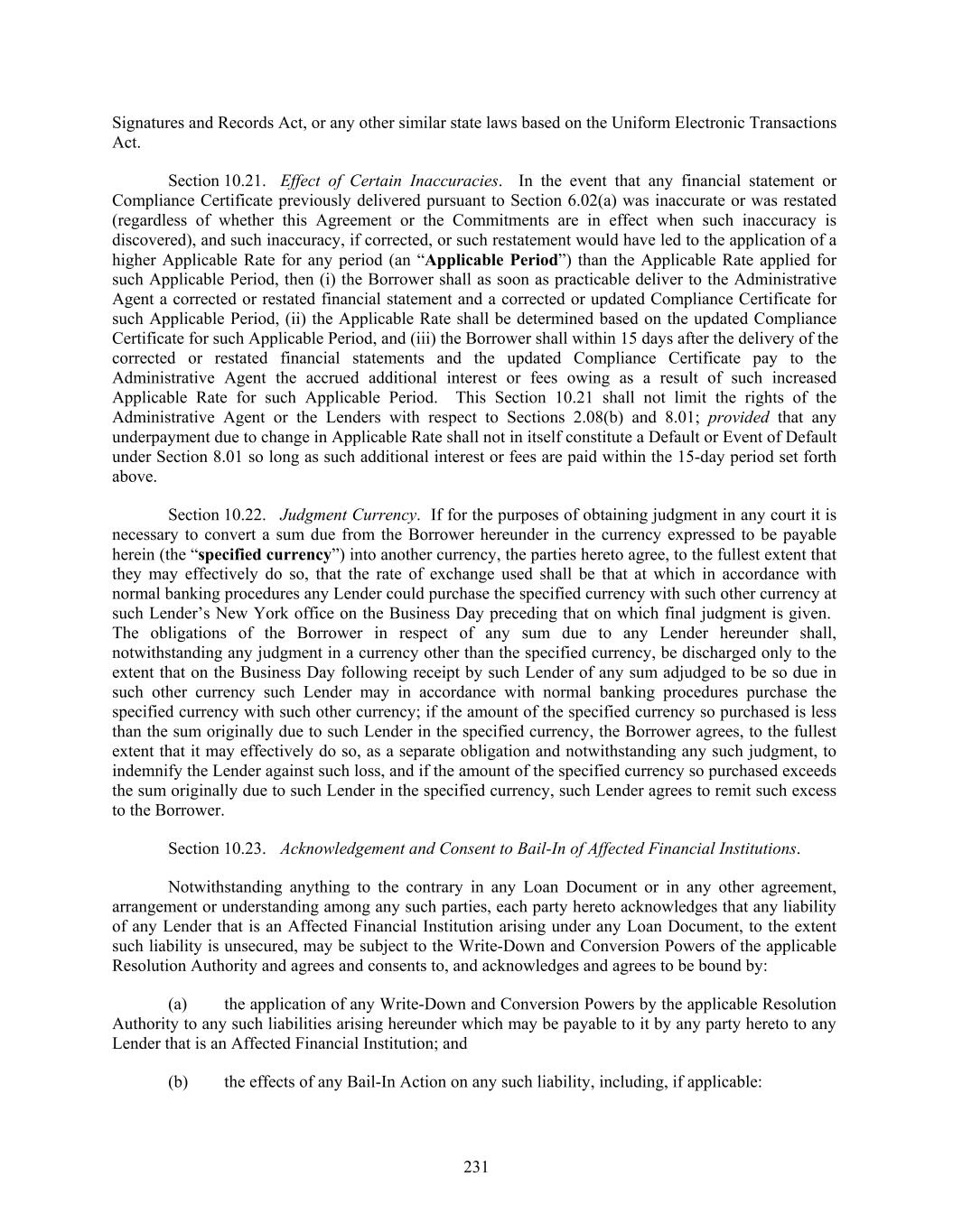 Signatures and Records Act, or any other similar state laws based on the Uniform Electronic TransactionsAct. Section 10.21. Effect of Certain Inaccuracies. In the event that any financial statement orCompliance Certificate previously delivered pursuant to Section 6.02(a) was inaccurate or was restated(regardless of whether this Agreement or the Commitments are in effect when such inaccuracy isdiscovered), and such inaccuracy, if corrected, or such restatement would have led to the application of ahigher Applicable Rate for any period (an “Applicable Period”) than the Applicable Rate applied forsuch Applicable Period, then (i) the Borrower shall as soon as practicable deliver to the AdministrativeAgent a corrected or restated financial statement and a corrected or updated Compliance Certificate forsuch Applicable Period, (ii) the Applicable Rate shall be determined based on the updated ComplianceCertificate for such Applicable Period, and (iii) the Borrower shall within 15 days after the delivery of thecorrected or restated financial statements and the updated Compliance Certificate pay to theAdministrative Agent the accrued additional interest or fees owing as a result of such increasedApplicable Rate for such Applicable Period. This Section 10.21 shall not limit the rights of theAdministrative Agent or the Lenders with respect to Sections 2.08(b) and 8.01; provided that anyunderpayment due to change in Applicable Rate shall not in itself constitute a Default or Event of Defaultunder Section 8.01 so long as such additional interest or fees are paid within the 15-day period set forthabove. Section 10.22. Judgment Currency. If for the purposes of obtaining judgment in any court it isnecessary to convert a sum due from the Borrower hereunder in the currency expressed to be payableherein (the “specified currency”) into another currency, the parties hereto agree, to the fullest extent thatthey may effectively do so, that the rate of exchange used shall be that at which in accordance withnormal banking procedures any Lender could purchase the specified currency with such other currency atsuch Lender’s New York office on the Business Day preceding that on which final judgment is given.The obligations of the Borrower in respect of any sum due to any Lender hereunder shall,notwithstanding any judgment in a currency other than the specified currency, be discharged only to theextent that on the Business Day following receipt by such Lender of any sum adjudged to be so due insuch other currency such Lender may in accordance with normal banking procedures purchase thespecified currency with such other currency; if the amount of the specified currency so purchased is lessthan the sum originally due to such Lender in the specified currency, the Borrower agrees, to the fullestextent that it may effectively do so, as a separate obligation and notwithstanding any such judgment, toindemnify the Lender against such loss, and if the amount of the specified currency so purchased exceedsthe sum originally due to such Lender in the specified currency, such Lender agrees to remit such excessto the Borrower.Section 10.23. Acknowledgement and Consent to Bail-In of Affected Financial Institutions.Notwithstanding anything to the contrary in any Loan Document or in any other agreement,arrangement or understanding among any such parties, each party hereto acknowledges that any liabilityof any Lender that is an Affected Financial Institution arising under any Loan Document, to the extentsuch liability is unsecured, may be subject to the Write-Down and Conversion Powers of the applicableResolution Authority and agrees and consents to, and acknowledges and agrees to be bound by:(a) the application of any Write-Down and Conversion Powers by the applicable ResolutionAuthority to any such liabilities arising hereunder which may be payable to it by any party hereto to anyLender that is an Affected Financial Institution; and(b) the effects of any Bail-In Action on any such liability, including, if applicable:231