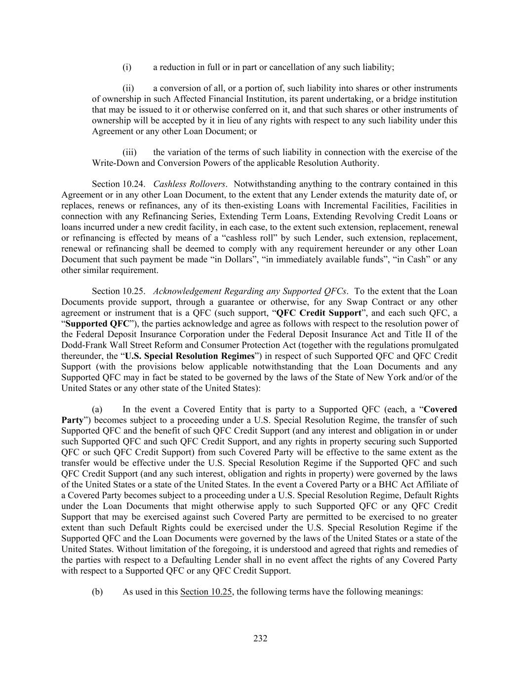 (i) a reduction in full or in part or cancellation of any such liability;(ii) a conversion of all, or a portion of, such liability into shares or other instrumentsof ownership in such Affected Financial Institution, its parent undertaking, or a bridge institutionthat may be issued to it or otherwise conferred on it, and that such shares or other instruments ofownership will be accepted by it in lieu of any rights with respect to any such liability under thisAgreement or any other Loan Document; or(iii) the variation of the terms of such liability in connection with the exercise of theWrite-Down and Conversion Powers of the applicable Resolution Authority.Section 10.24. Cashless Rollovers. Notwithstanding anything to the contrary contained in thisAgreement or in any other Loan Document, to the extent that any Lender extends the maturity date of, orreplaces, renews or refinances, any of its then-existing Loans with Incremental Facilities, Facilities inconnection with any Refinancing Series, Extending Term Loans, Extending Revolving Credit Loans orloans incurred under a new credit facility, in each case, to the extent such extension, replacement, renewalor refinancing is effected by means of a “cashless roll” by such Lender, such extension, replacement,renewal or refinancing shall be deemed to comply with any requirement hereunder or any other LoanDocument that such payment be made “in Dollars”, “in immediately available funds”, “in Cash” or anyother similar requirement.Section 10.25. Acknowledgement Regarding any Supported QFCs. To the extent that the LoanDocuments provide support, through a guarantee or otherwise, for any Swap Contract or any otheragreement or instrument that is a QFC (such support, “QFC Credit Support”, and each such QFC, a“Supported QFC”), the parties acknowledge and agree as follows with respect to the resolution power ofthe Federal Deposit Insurance Corporation under the Federal Deposit Insurance Act and Title II of theDodd-Frank Wall Street Reform and Consumer Protection Act (together with the regulations promulgatedthereunder, the “U.S. Special Resolution Regimes”) in respect of such Supported QFC and QFC CreditSupport (with the provisions below applicable notwithstanding that the Loan Documents and anySupported QFC may in fact be stated to be governed by the laws of the State of New York and/or of theUnited States or any other state of the United States):(a) In the event a Covered Entity that is party to a Supported QFC (each, a “CoveredParty”) becomes subject to a proceeding under a U.S. Special Resolution Regime, the transfer of suchSupported QFC and the benefit of such QFC Credit Support (and any interest and obligation in or undersuch Supported QFC and such QFC Credit Support, and any rights in property securing such SupportedQFC or such QFC Credit Support) from such Covered Party will be effective to the same extent as thetransfer would be effective under the U.S. Special Resolution Regime if the Supported QFC and suchQFC Credit Support (and any such interest, obligation and rights in property) were governed by the lawsof the United States or a state of the United States. In the event a Covered Party or a BHC Act Affiliate ofa Covered Party becomes subject to a proceeding under a U.S. Special Resolution Regime, Default Rightsunder the Loan Documents that might otherwise apply to such Supported QFC or any QFC CreditSupport that may be exercised against such Covered Party are permitted to be exercised to no greaterextent than such Default Rights could be exercised under the U.S. Special Resolution Regime if theSupported QFC and the Loan Documents were governed by the laws of the United States or a state of theUnited States. Without limitation of the foregoing, it is understood and agreed that rights and remedies ofthe parties with respect to a Defaulting Lender shall in no event affect the rights of any Covered Partywith respect to a Supported QFC or any QFC Credit Support.(b) As used in this Section 10.25, the following terms have the following meanings:232