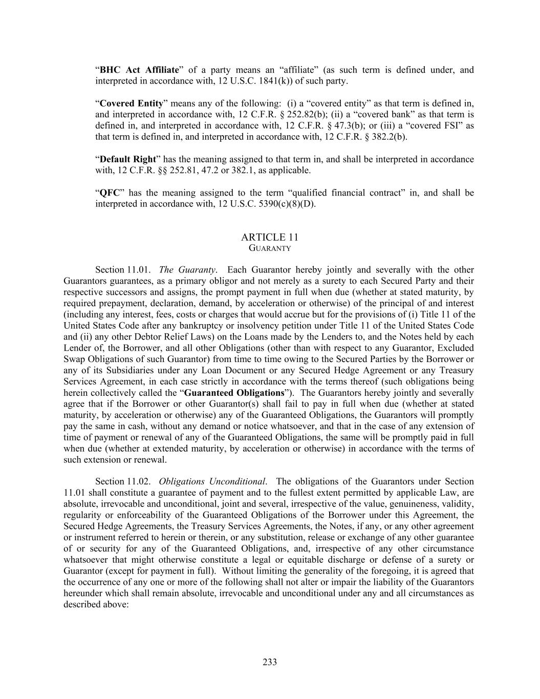 “BHC Act Affiliate” of a party means an “affiliate” (as such term is defined under, andinterpreted in accordance with, 12 U.S.C. 1841(k)) of such party.“Covered Entity” means any of the following: (i) a “covered entity” as that term is defined in,and interpreted in accordance with, 12 C.F.R. § 252.82(b); (ii) a “covered bank” as that term isdefined in, and interpreted in accordance with, 12 C.F.R. § 47.3(b); or (iii) a “covered FSI” asthat term is defined in, and interpreted in accordance with, 12 C.F.R. § 382.2(b).“Default Right” has the meaning assigned to that term in, and shall be interpreted in accordancewith, 12 C.F.R. §§ 252.81, 47.2 or 382.1, as applicable.“QFC” has the meaning assigned to the term “qualified financial contract” in, and shall beinterpreted in accordance with, 12 U.S.C. 5390(c)(8)(D).ARTICLE 11GUARANTYSection 11.01. The Guaranty. Each Guarantor hereby jointly and severally with the otherGuarantors guarantees, as a primary obligor and not merely as a surety to each Secured Party and theirrespective successors and assigns, the prompt payment in full when due (whether at stated maturity, byrequired prepayment, declaration, demand, by acceleration or otherwise) of the principal of and interest(including any interest, fees, costs or charges that would accrue but for the provisions of (i) Title 11 of theUnited States Code after any bankruptcy or insolvency petition under Title 11 of the United States Codeand (ii) any other Debtor Relief Laws) on the Loans made by the Lenders to, and the Notes held by eachLender of, the Borrower, and all other Obligations (other than with respect to any Guarantor, ExcludedSwap Obligations of such Guarantor) from time to time owing to the Secured Parties by the Borrower orany of its Subsidiaries under any Loan Document or any Secured Hedge Agreement or any TreasuryServices Agreement, in each case strictly in accordance with the terms thereof (such obligations beingherein collectively called the “Guaranteed Obligations”). The Guarantors hereby jointly and severallyagree that if the Borrower or other Guarantor(s) shall fail to pay in full when due (whether at statedmaturity, by acceleration or otherwise) any of the Guaranteed Obligations, the Guarantors will promptlypay the same in cash, without any demand or notice whatsoever, and that in the case of any extension oftime of payment or renewal of any of the Guaranteed Obligations, the same will be promptly paid in fullwhen due (whether at extended maturity, by acceleration or otherwise) in accordance with the terms ofsuch extension or renewal.Section 11.02. Obligations Unconditional. The obligations of the Guarantors under Section11.01 shall constitute a guarantee of payment and to the fullest extent permitted by applicable Law, areabsolute, irrevocable and unconditional, joint and several, irrespective of the value, genuineness, validity,regularity or enforceability of the Guaranteed Obligations of the Borrower under this Agreement, theSecured Hedge Agreements, the Treasury Services Agreements, the Notes, if any, or any other agreementor instrument referred to herein or therein, or any substitution, release or exchange of any other guaranteeof or security for any of the Guaranteed Obligations, and, irrespective of any other circumstancewhatsoever that might otherwise constitute a legal or equitable discharge or defense of a surety orGuarantor (except for payment in full). Without limiting the generality of the foregoing, it is agreed thatthe occurrence of any one or more of the following shall not alter or impair the liability of the Guarantorshereunder which shall remain absolute, irrevocable and unconditional under any and all circumstances asdescribed above: 233