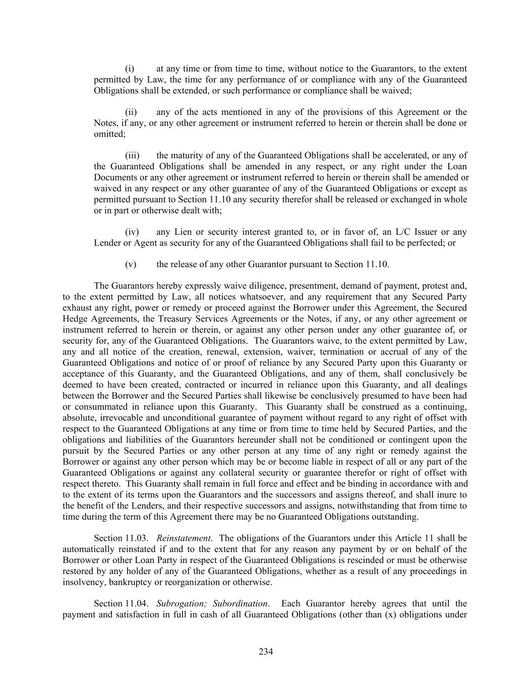 (i) at any time or from time to time, without notice to the Guarantors, to the extentpermitted by Law, the time for any performance of or compliance with any of the GuaranteedObligations shall be extended, or such performance or compliance shall be waived;(ii) any of the acts mentioned in any of the provisions of this Agreement or theNotes, if any, or any other agreement or instrument referred to herein or therein shall be done oromitted;(iii) the maturity of any of the Guaranteed Obligations shall be accelerated, or any ofthe Guaranteed Obligations shall be amended in any respect, or any right under the LoanDocuments or any other agreement or instrument referred to herein or therein shall be amended orwaived in any respect or any other guarantee of any of the Guaranteed Obligations or except aspermitted pursuant to Section 11.10 any security therefor shall be released or exchanged in wholeor in part or otherwise dealt with;(iv) any Lien or security interest granted to, or in favor of, an L/C Issuer or anyLender or Agent as security for any of the Guaranteed Obligations shall fail to be perfected; or(v) the release of any other Guarantor pursuant to Section 11.10.The Guarantors hereby expressly waive diligence, presentment, demand of payment, protest and,to the extent permitted by Law, all notices whatsoever, and any requirement that any Secured Partyexhaust any right, power or remedy or proceed against the Borrower under this Agreement, the SecuredHedge Agreements, the Treasury Services Agreements or the Notes, if any, or any other agreement orinstrument referred to herein or therein, or against any other person under any other guarantee of, orsecurity for, any of the Guaranteed Obligations. The Guarantors waive, to the extent permitted by Law,any and all notice of the creation, renewal, extension, waiver, termination or accrual of any of theGuaranteed Obligations and notice of or proof of reliance by any Secured Party upon this Guaranty oracceptance of this Guaranty, and the Guaranteed Obligations, and any of them, shall conclusively bedeemed to have been created, contracted or incurred in reliance upon this Guaranty, and all dealingsbetween the Borrower and the Secured Parties shall likewise be conclusively presumed to have been hador consummated in reliance upon this Guaranty. This Guaranty shall be construed as a continuing,absolute, irrevocable and unconditional guarantee of payment without regard to any right of offset withrespect to the Guaranteed Obligations at any time or from time to time held by Secured Parties, and theobligations and liabilities of the Guarantors hereunder shall not be conditioned or contingent upon thepursuit by the Secured Parties or any other person at any time of any right or remedy against theBorrower or against any other person which may be or become liable in respect of all or any part of theGuaranteed Obligations or against any collateral security or guarantee therefor or right of offset withrespect thereto. This Guaranty shall remain in full force and effect and be binding in accordance with andto the extent of its terms upon the Guarantors and the successors and assigns thereof, and shall inure tothe benefit of the Lenders, and their respective successors and assigns, notwithstanding that from time totime during the term of this Agreement there may be no Guaranteed Obligations outstanding.Section 11.03. Reinstatement. The obligations of the Guarantors under this Article 11 shall beautomatically reinstated if and to the extent that for any reason any payment by or on behalf of theBorrower or other Loan Party in respect of the Guaranteed Obligations is rescinded or must be otherwiserestored by any holder of any of the Guaranteed Obligations, whether as a result of any proceedings ininsolvency, bankruptcy or reorganization or otherwise.Section 11.04. Subrogation; Subordination. Each Guarantor hereby agrees that until thepayment and satisfaction in full in cash of all Guaranteed Obligations (other than (x) obligations under234