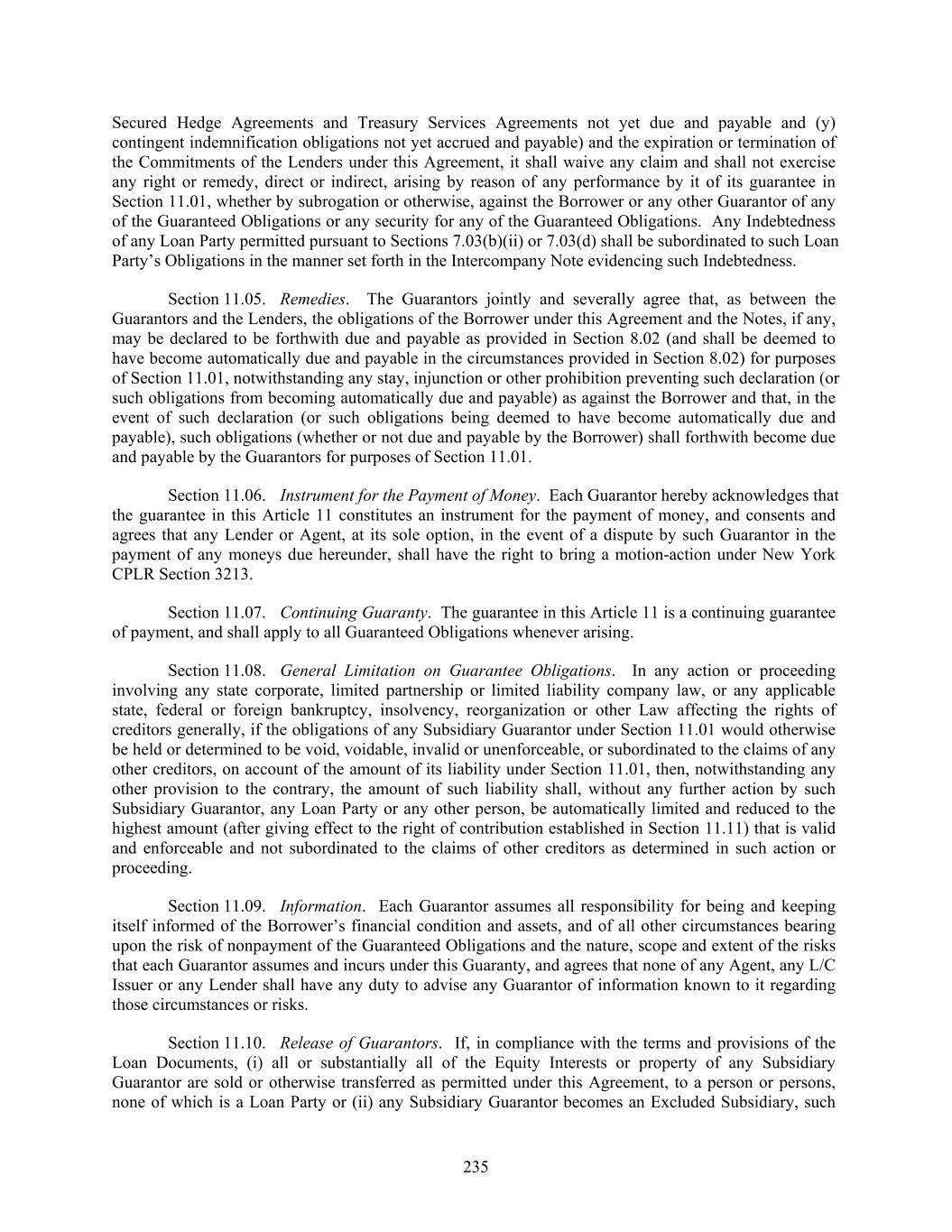 Secured Hedge Agreements and Treasury Services Agreements not yet due and payable and (y)contingent indemnification obligations not yet accrued and payable) and the expiration or termination ofthe Commitments of the Lenders under this Agreement, it shall waive any claim and shall not exerciseany right or remedy, direct or indirect, arising by reason of any performance by it of its guarantee in Section 11.01, whether by subrogation or otherwise, against the Borrower or any other Guarantor of anyof the Guaranteed Obligations or any security for any of the Guaranteed Obligations. Any Indebtednessof any Loan Party permitted pursuant to Sections 7.03(b)(ii) or 7.03(d) shall be subordinated to such LoanParty’s Obligations in the manner set forth in the Intercompany Note evidencing such Indebtedness.Section 11.05. Remedies. The Guarantors jointly and severally agree that, as between theGuarantors and the Lenders, the obligations of the Borrower under this Agreement and the Notes, if any,may be declared to be forthwith due and payable as provided in Section 8.02 (and shall be deemed tohave become automatically due and payable in the circumstances provided in Section 8.02) for purposesof Section 11.01, notwithstanding any stay, injunction or other prohibition preventing such declaration (orsuch obligations from becoming automatically due and payable) as against the Borrower and that, in theevent of such declaration (or such obligations being deemed to have become automatically due andpayable), such obligations (whether or not due and payable by the Borrower) shall forthwith become dueand payable by the Guarantors for purposes of Section 11.01.Section 11.06. Instrument for the Payment of Money. Each Guarantor hereby acknowledges thatthe guarantee in this Article 11 constitutes an instrument for the payment of money, and consents andagrees that any Lender or Agent, at its sole option, in the event of a dispute by such Guarantor in thepayment of any moneys due hereunder, shall have the right to bring a motion-action under New YorkCPLR Section 3213.Section 11.07. Continuing Guaranty. The guarantee in this Article 11 is a continuing guaranteeof payment, and shall apply to all Guaranteed Obligations whenever arising.Section 11.08. General Limitation on Guarantee Obligations. In any action or proceedinginvolving any state corporate, limited partnership or limited liability company law, or any applicablestate, federal or foreign bankruptcy, insolvency, reorganization or other Law affecting the rights ofcreditors generally, if the obligations of any Subsidiary Guarantor under Section 11.01 would otherwisebe held or determined to be void, voidable, invalid or unenforceable, or subordinated to the claims of anyother creditors, on account of the amount of its liability under Section 11.01, then, notwithstanding anyother provision to the contrary, the amount of such liability shall, without any further action by suchSubsidiary Guarantor, any Loan Party or any other person, be automatically limited and reduced to thehighest amount (after giving effect to the right of contribution established in Section 11.11) that is validand enforceable and not subordinated to the claims of other creditors as determined in such action orproceeding.Section 11.09. Information. Each Guarantor assumes all responsibility for being and keepingitself informed of the Borrower’s financial condition and assets, and of all other circumstances bearingupon the risk of nonpayment of the Guaranteed Obligations and the nature, scope and extent of the risksthat each Guarantor assumes and incurs under this Guaranty, and agrees that none of any Agent, any L/CIssuer or any Lender shall have any duty to advise any Guarantor of information known to it regardingthose circumstances or risks.Section 11.10. Release of Guarantors. If, in compliance with the terms and provisions of theLoan Documents, (i) all or substantially all of the Equity Interests or property of any SubsidiaryGuarantor are sold or otherwise transferred as permitted under this Agreement, to a person or persons,none of which is a Loan Party or (ii) any Subsidiary Guarantor becomes an Excluded Subsidiary, such235