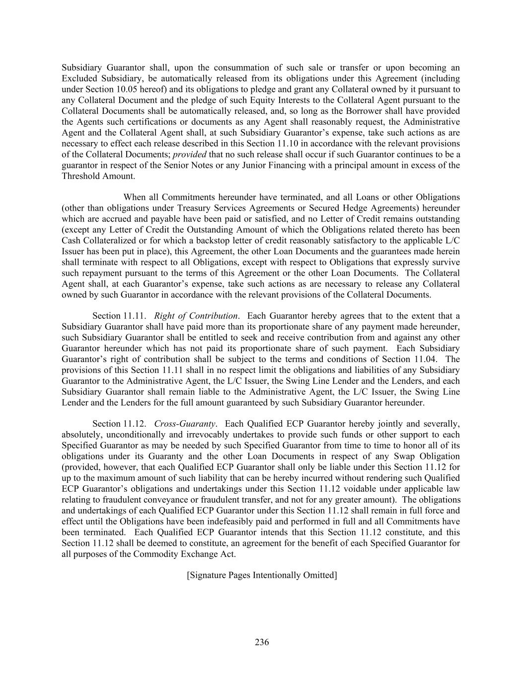 Subsidiary Guarantor shall, upon the consummation of such sale or transfer or upon becoming anExcluded Subsidiary, be automatically released from its obligations under this Agreement (includingunder Section 10.05 hereof) and its obligations to pledge and grant any Collateral owned by it pursuant toany Collateral Document and the pledge of such Equity Interests to the Collateral Agent pursuant to theCollateral Documents shall be automatically released, and, so long as the Borrower shall have providedthe Agents such certifications or documents as any Agent shall reasonably request, the AdministrativeAgent and the Collateral Agent shall, at such Subsidiary Guarantor’s expense, take such actions as arenecessary to effect each release described in this Section 11.10 in accordance with the relevant provisionsof the Collateral Documents; provided that no such release shall occur if such Guarantor continues to be aguarantor in respect of the Senior Notes or any Junior Financing with a principal amount in excess of theThreshold Amount.When all Commitments hereunder have terminated, and all Loans or other Obligations(other than obligations under Treasury Services Agreements or Secured Hedge Agreements) hereunderwhich are accrued and payable have been paid or satisfied, and no Letter of Credit remains outstanding(except any Letter of Credit the Outstanding Amount of which the Obligations related thereto has beenCash Collateralized or for which a backstop letter of credit reasonably satisfactory to the applicable L/CIssuer has been put in place), this Agreement, the other Loan Documents and the guarantees made hereinshall terminate with respect to all Obligations, except with respect to Obligations that expressly survivesuch repayment pursuant to the terms of this Agreement or the other Loan Documents. The CollateralAgent shall, at each Guarantor’s expense, take such actions as are necessary to release any Collateralowned by such Guarantor in accordance with the relevant provisions of the Collateral Documents.Section 11.11. Right of Contribution. Each Guarantor hereby agrees that to the extent that aSubsidiary Guarantor shall have paid more than its proportionate share of any payment made hereunder,such Subsidiary Guarantor shall be entitled to seek and receive contribution from and against any otherGuarantor hereunder which has not paid its proportionate share of such payment. Each SubsidiaryGuarantor’s right of contribution shall be subject to the terms and conditions of Section 11.04. Theprovisions of this Section 11.11 shall in no respect limit the obligations and liabilities of any SubsidiaryGuarantor to the Administrative Agent, the L/C Issuer, the Swing Line Lender and the Lenders, and eachSubsidiary Guarantor shall remain liable to the Administrative Agent, the L/C Issuer, the Swing LineLender and the Lenders for the full amount guaranteed by such Subsidiary Guarantor hereunder.Section 11.12. Cross-Guaranty. Each Qualified ECP Guarantor hereby jointly and severally,absolutely, unconditionally and irrevocably undertakes to provide such funds or other support to eachSpecified Guarantor as may be needed by such Specified Guarantor from time to time to honor all of itsobligations under its Guaranty and the other Loan Documents in respect of any Swap Obligation(provided, however, that each Qualified ECP Guarantor shall only be liable under this Section 11.12 forup to the maximum amount of such liability that can be hereby incurred without rendering such QualifiedECP Guarantor’s obligations and undertakings under this Section 11.12 voidable under applicable lawrelating to fraudulent conveyance or fraudulent transfer, and not for any greater amount). The obligationsand undertakings of each Qualified ECP Guarantor under this Section 11.12 shall remain in full force andeffect until the Obligations have been indefeasibly paid and performed in full and all Commitments havebeen terminated. Each Qualified ECP Guarantor intends that this Section 11.12 constitute, and this Section 11.12 shall be deemed to constitute, an agreement for the benefit of each Specified Guarantor forall purposes of the Commodity Exchange Act.[Signature Pages Intentionally Omitted]236
