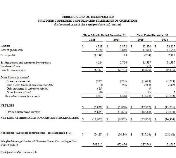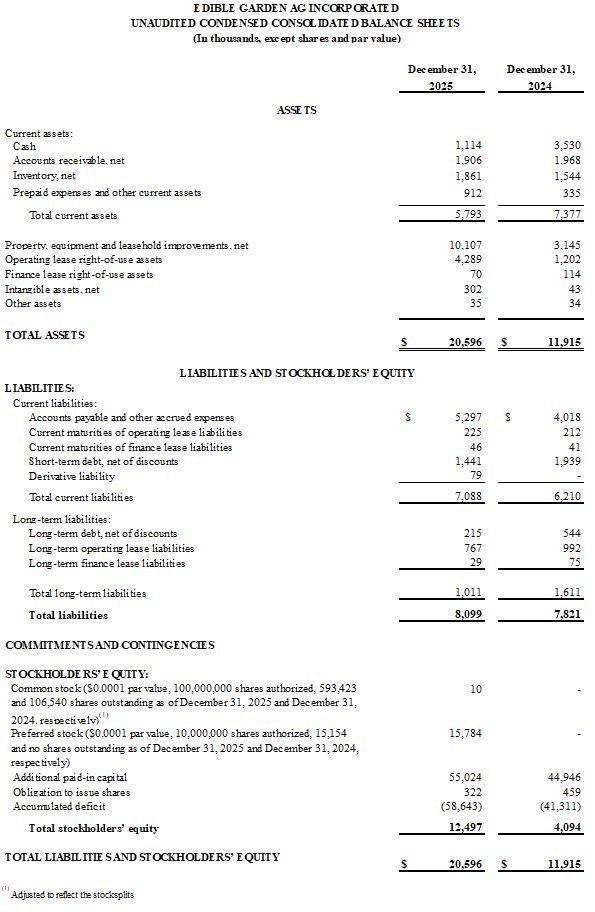 BELVIDERE, NJ, March 31, 2026 — Edible Garden AG Incorporated (“Edible Garden” or the “Company”) (Nasdaq: EDBL, EDBLW), a leader in controlled environment agriculture (CEA), locally grown, organic, and sustainable produce and products, today reported financial results for the three months and year ended December 31, 2025. The Company continued to build on its controlled environment agriculture foundation during the year, expanding into higher-margin, shelf-stable consumer packaged goods and leveraging its existing infrastructure, national distribution network, and product development capabilities to scale into adjacent, expected higher-value categories.