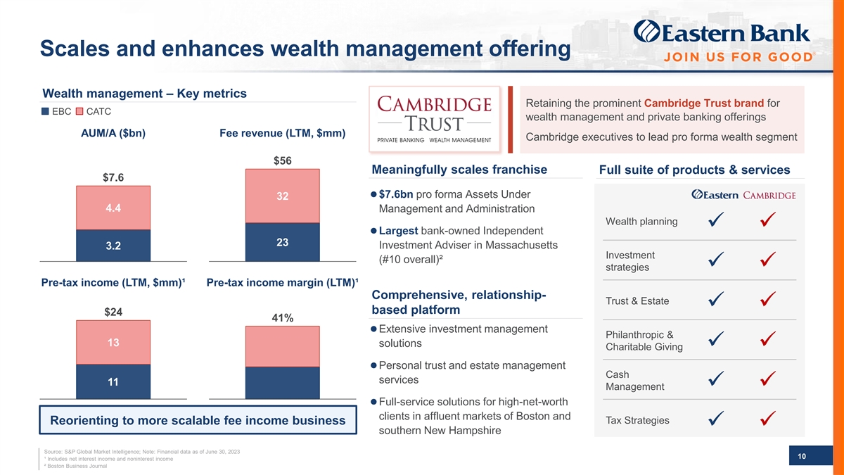 is the leading wealth-focused Boston bank Company overview Branch footprint ⚫ Founded in 1890 and headquartered in Harvard Square, Cambridge, MA Concord Winchester Dover ⚫ Differentiated Private Banking and Wealth Management focus Lexington Stratham Portsmouth Manchester North Hampton ⚫ Twenty-two branches and five wealth offices across highly affluent Boston Bedford and southern New Hampshire markets Weston North Andover ⚫ Pristine credit quality through multiple economic cycles Cambridge Andover Newton ⚫ Stable, high-quality deposit base Wellesley Key metrics Needham 12th $397mm $5.5bn Cambridge 22 branches in MA and NH Cambridge HQ Cambridge Trust Wealth Offices Overall deposit share Market cap Total assets in Boston MSA¹ Loan and deposit composition (GAAP) Balanced loan portfolio High-quality deposit base 1bp $4.4bn 25% Consumer: Commercial: 10-year average NCOs / avg. 4% 42% 3% 58% AUM/A Fee income ratio loans (vs. 0.13% for KRX)² 14% C&D 24% NIB 19% Multifamily IB checking 39% NOOCRE Seasoned management team Savings $4.0bn 22% $4.4bn OOCRE Money market 22% C&I 26% Time Denis Sheahan, Chief Executive Officer, President and Chair of 13% 1-4 family 9% 4% Other Consumer the Board of Cambridge Bancorp, will become CEO of Eastern, reporting to Bob Rivers, who will become Executive Chair Yield on loans: 4.80% Cost of deposits: 1.78% 91% loans / deposits ratio Source: FactSet; S&P Global Market Intelligence; Note: Financial data as of June 30, 2023; Market data as of September 18, 2023; Figures may not total to 100% due to rounding ¹ Excludes trust banks; Mid-sized bank defined as <$100bn in total assets; Based on FDIC Summary of Deposits Survey (2022) 9 ² Represents ten-year average net charge-offs for the years 2013–2022 relative to the Nasdaq Regional Banking Index