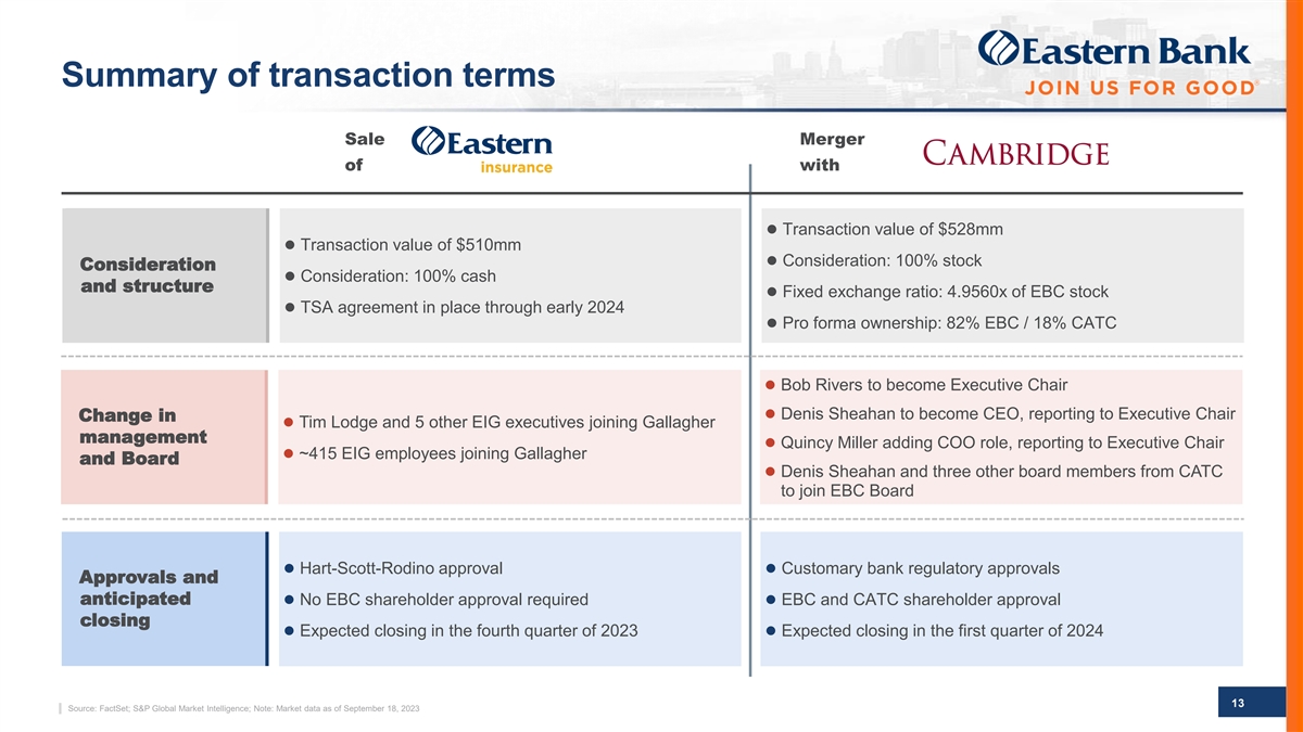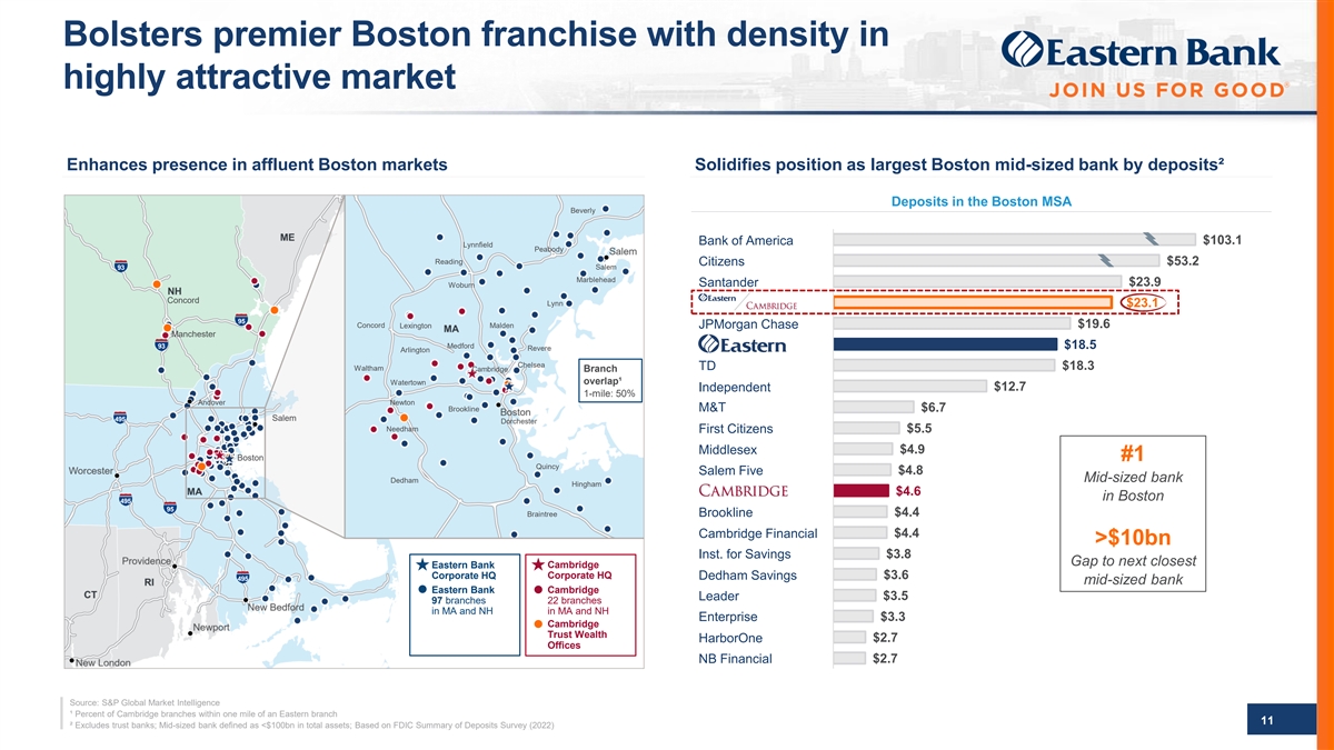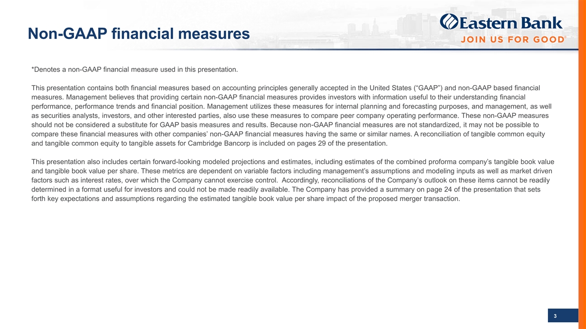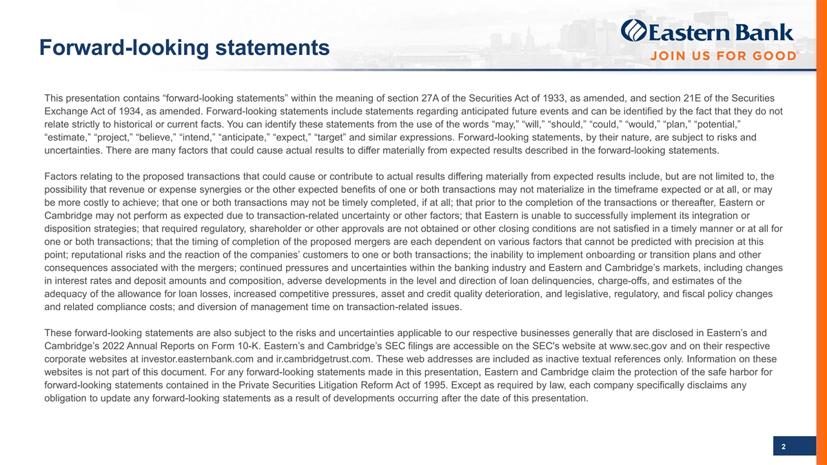 Forward-looking statements This presentation contains “forward-looking statements” within the meaning of section 27A of the Securities Act of 1933, as amended, and section 21E of the Securities Exchange Act of 1934, as amended. Forward-looking statements include statements regarding anticipated future events and can be identified by the fact that they do not relate strictly to historical or current facts. You can identify these statements from the use of the words “may,” “will,” “should,” “could,” “would,” “plan,” “potential,” “estimate,” “project,” “believe,” “intend,” “anticipate,” “expect,” “target” and similar expressions. Forward-looking statements, by their nature, are subject to risks and uncertainties. There are many factors that could cause actual results to differ materially from expected results described in the forward-looking statements. Factors relating to the proposed transactions that could cause or contribute to actual results differing materially from expected results include, but are not limited to, the possibility that revenue or expense synergies or the other expected benefits of one or both transactions may not materialize in the timeframe expected or at all, or may be more costly to achieve; that one or both transactions may not be timely completed, if at all; that prior to the completion of the transactions or thereafter, Eastern or Cambridge may not perform as expected due to transaction-related uncertainty or other factors; that Eastern is unable to successfully implement its integration or disposition strategies; that required regulatory, shareholder or other approvals are not obtained or other closing conditions are not satisfied in a timely manner or at all for one or both transactions; that the timing of completion of the proposed mergers are each dependent on various factors that cannot be predicted with precision at this point; reputational risks and the reaction of the companies’ customers to one or both transactions; the inability to implement onboarding or transition plans and other consequences associated with the mergers; continued pressures and uncertainties within the banking industry and Eastern and Cambridge’s markets, including changes in interest rates and deposit amounts and composition, adverse developments in the level and direction of loan delinquencies, charge-offs, and estimates of the adequacy of the allowance for loan losses, increased competitive pressures, asset and credit quality deterioration, and legislative, regulatory, and fiscal policy changes and related compliance costs; and diversion of management time on transaction-related issues. These forward-looking statements are also subject to the risks and uncertainties applicable to our respective businesses generally that are disclosed in Eastern’s and Cambridge’s 2022 Annual Reports on Form 10-K. Eastern’s and Cambridge’s SEC filings are accessible on the SEC's website at www.sec.gov and on their respective corporate websites at investor.easternbank.com and ir.cambridgetrust.com. These web addresses are included as inactive textual references only. Information on these websites is not part of this document. For any forward-looking statements made in this presentation, Eastern and Cambridge claim the protection of the safe harbor for forward-looking statements contained in the Private Securities Litigation Reform Act of 1995. Except as required by law, each company specifically disclaims any obligation to update any forward-looking statements as a result of developments occurring after the date of this presentation. 2