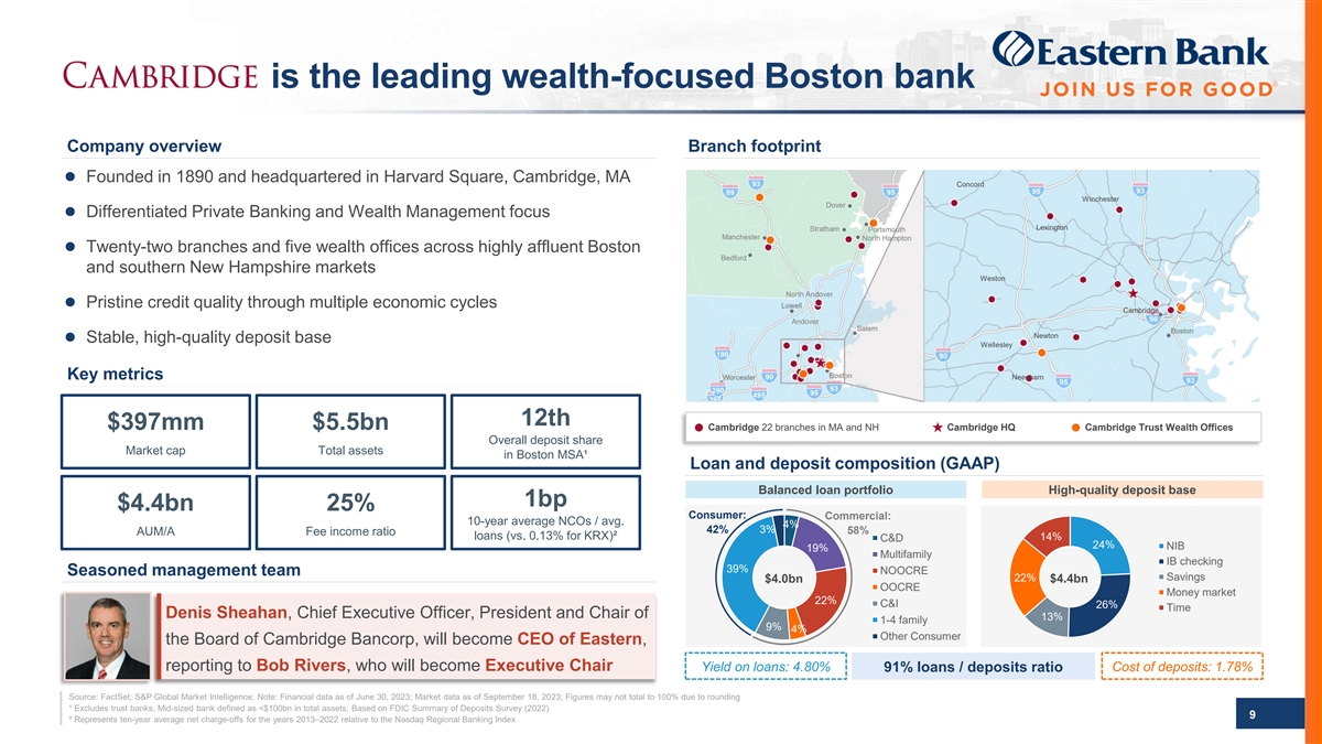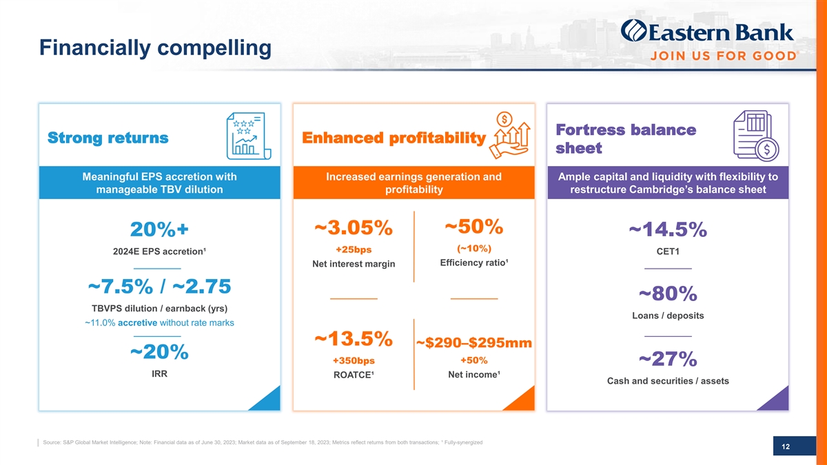 Financially compelling Fortress balance Strong returns Enhanced profitability sheet Meaningful EPS accretion with Increased earnings generation and Ample capital and liquidity with flexibility to manageable TBV dilution profitability restructure Cambridge’s balance sheet ~50% ~3.05% 20%+ ~14.5% (~10%) +25bps 2024E EPS accretion¹ CET1 Efficiency ratio¹ Net interest margin ~7.5% / ~2.75 ~80% TBVPS dilution / earnback (yrs) Loans / deposits ~11.0% accretive without rate marks ~13.5% ~$290–$295mm ~20% +50% +350bps ~27% IRR Net income¹ ROATCE¹ Cash and securities / assets Source: S&P Global Market Intelligence; Note: Financial data as of June 30, 2023; Market data as of September 18, 2023; Metrics reflect returns from both transactions; ¹ Fully-synergized 12